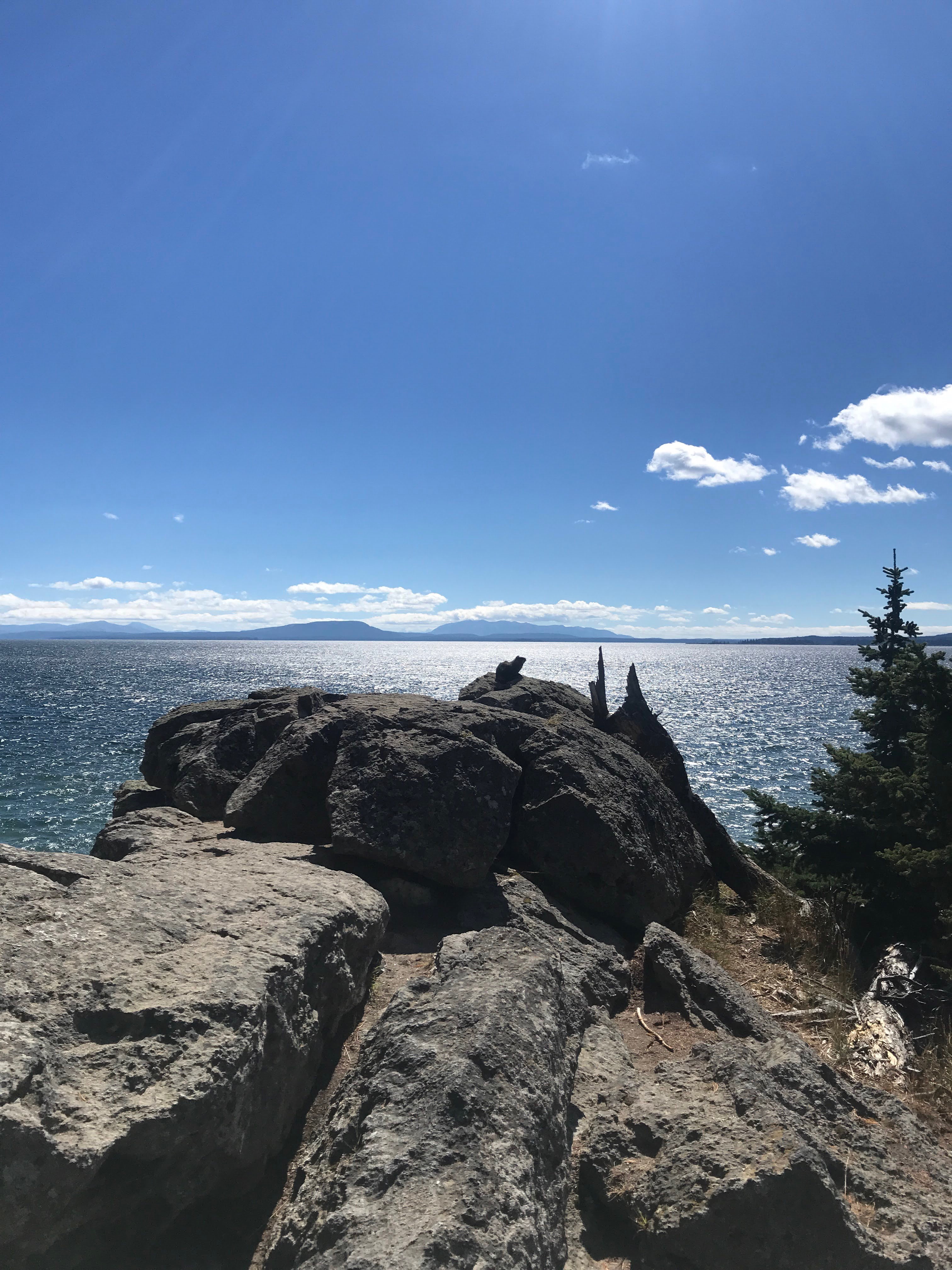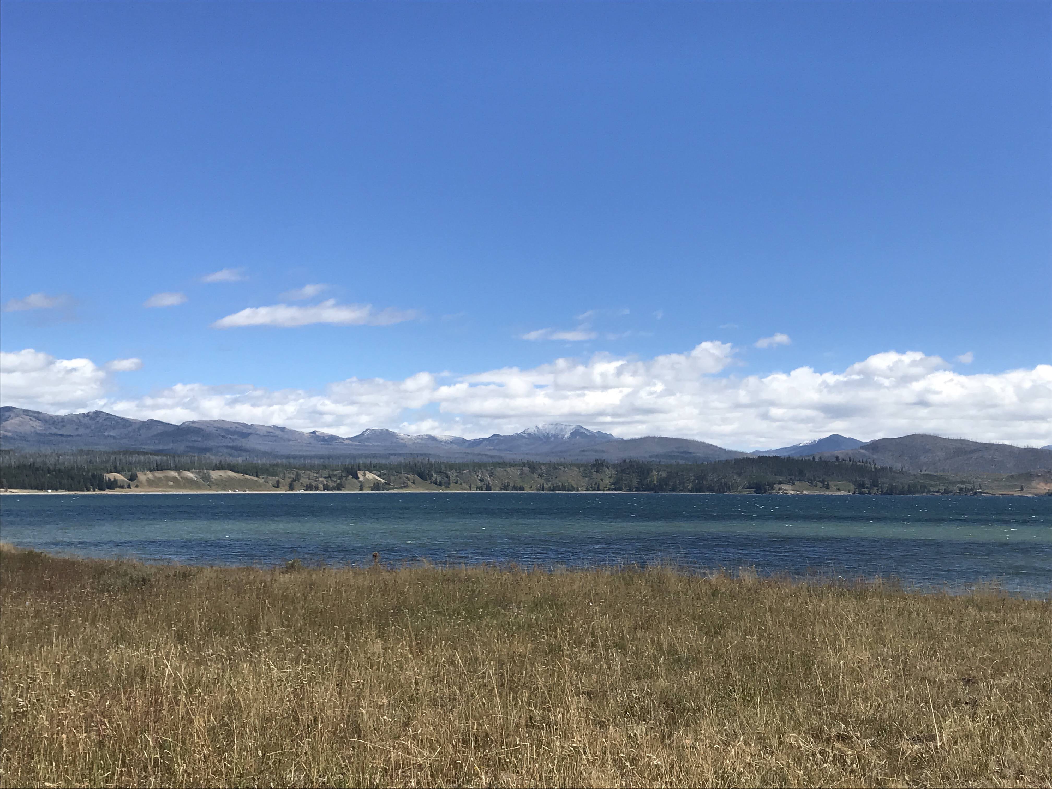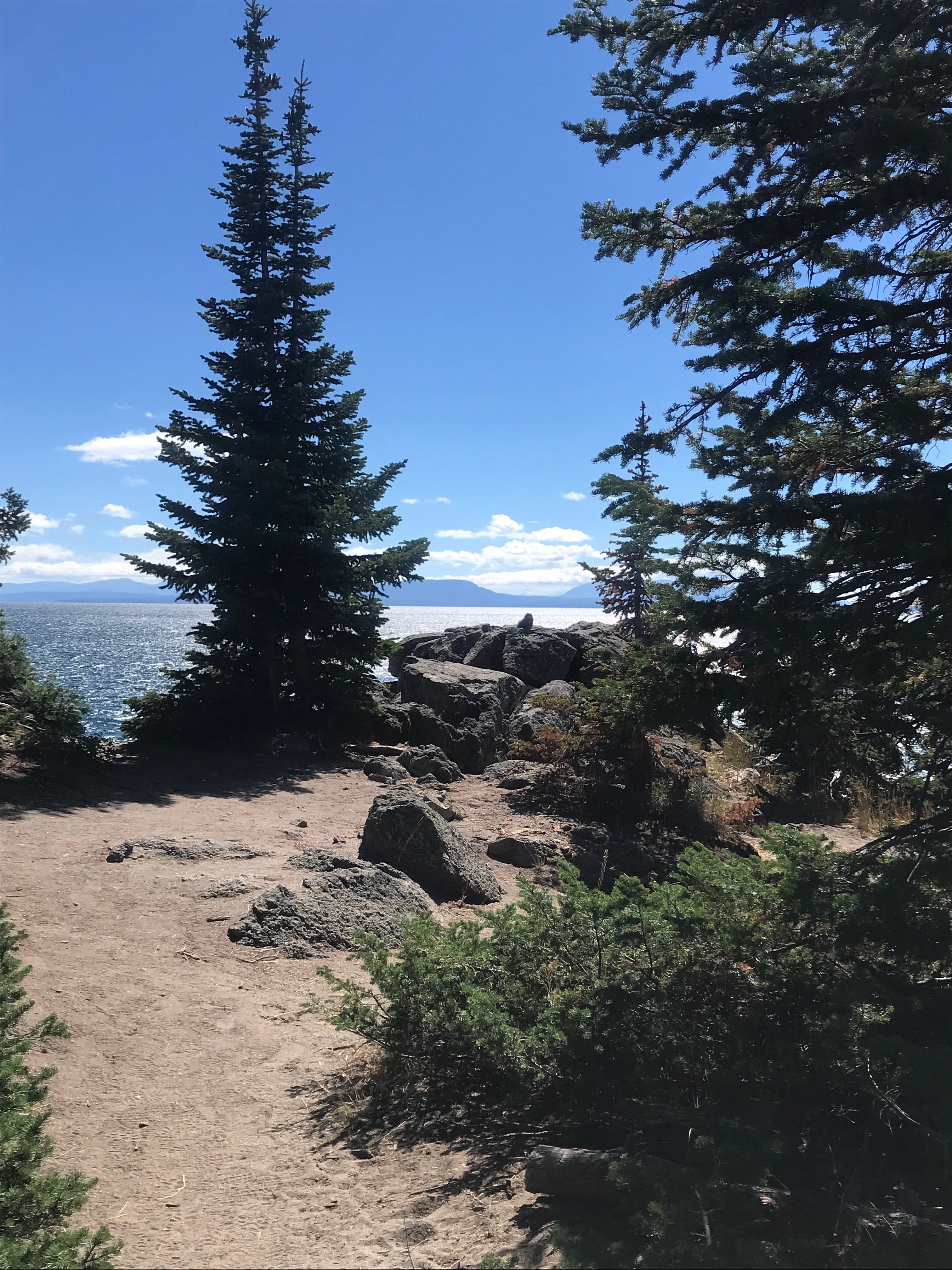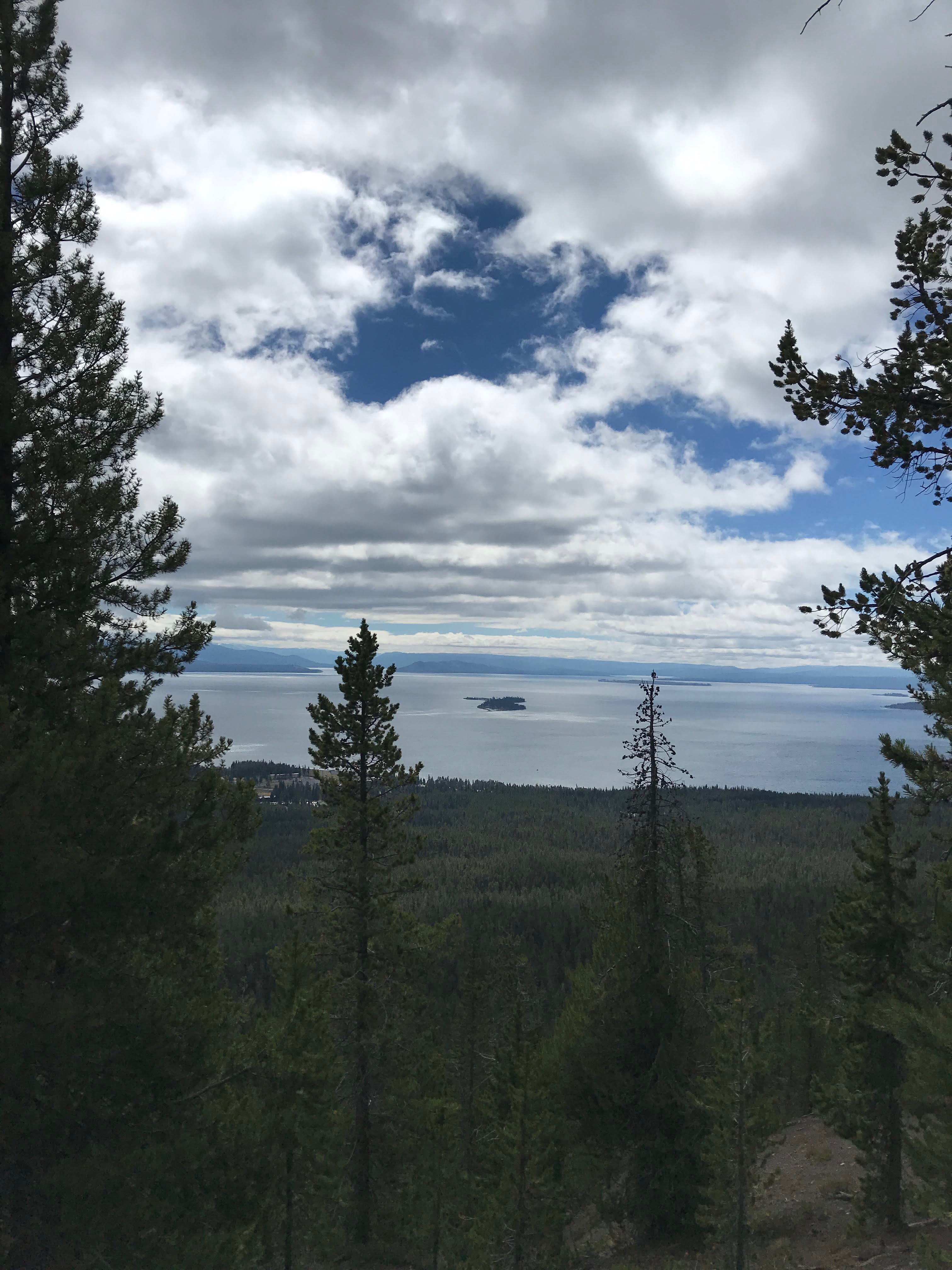 At the top, the trail flattened out and we made a big arc around to the viewing spot. Gosh, was it worth the effort. The sun was peaking through the puffy white clouds, shining down on the navy blue waters of Yellowstone Lake below. The water was calm, with only a few white lines stretching through it from early morning boaters. Two long wood logs, placed perfectly toward the opening, called our names and we sat down to soak it all in.