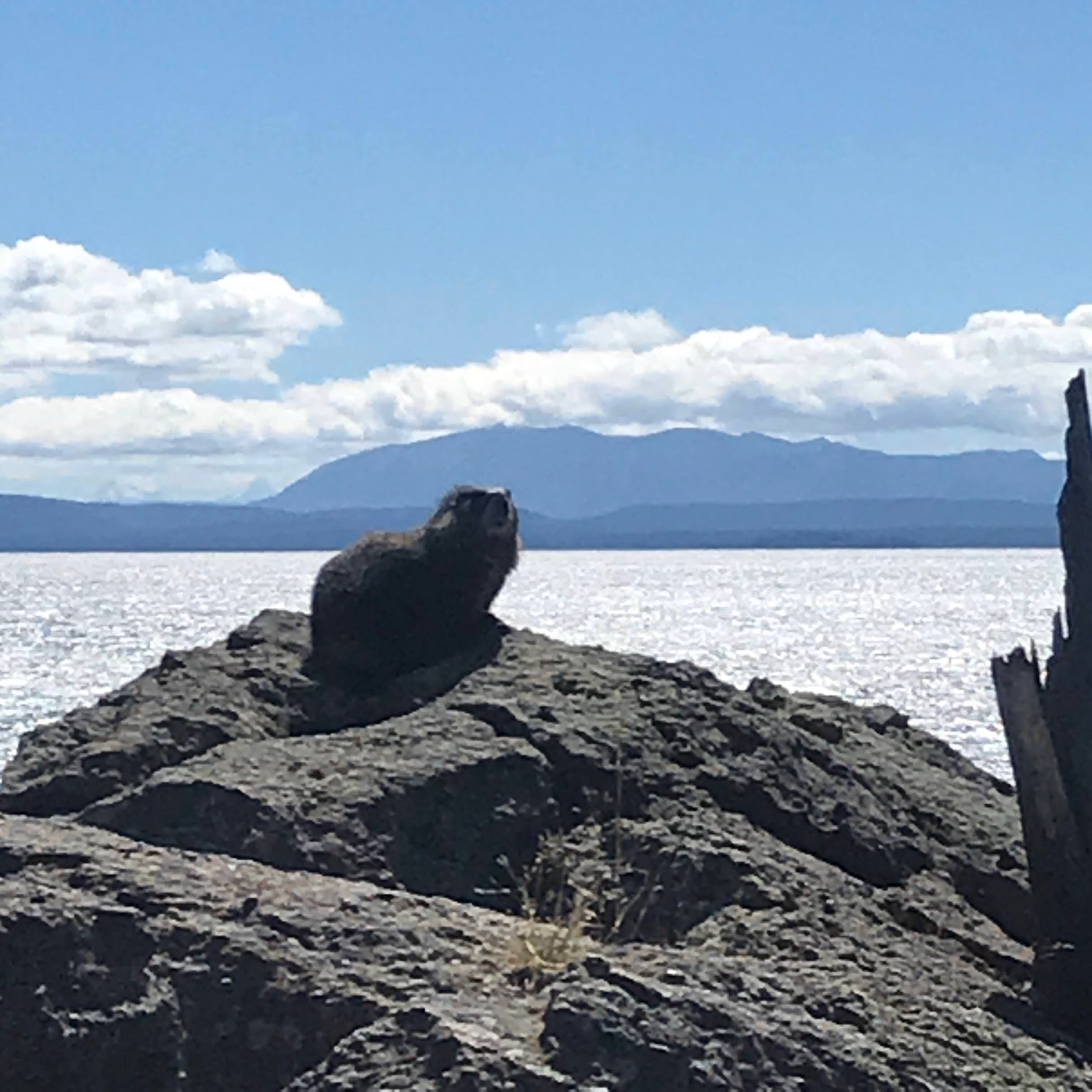Eventually we emerged from the woods and walked along the path onto of the cliff by the shore. Storm Point lay ahead, an outcropping giving a spectacular view of the lake. My mom and I were caught up taking pictures when my dad spotted a yellow-bellied marmot sunbathing on the rocks! We quietly but quickly hurried over to capture it in its glory, but we needed have hurried. The marmot seemed to love the camera and posed for us for a long time, making sure to have the scenic lake behind as a beautiful backdrop. Another animal to check off the list!