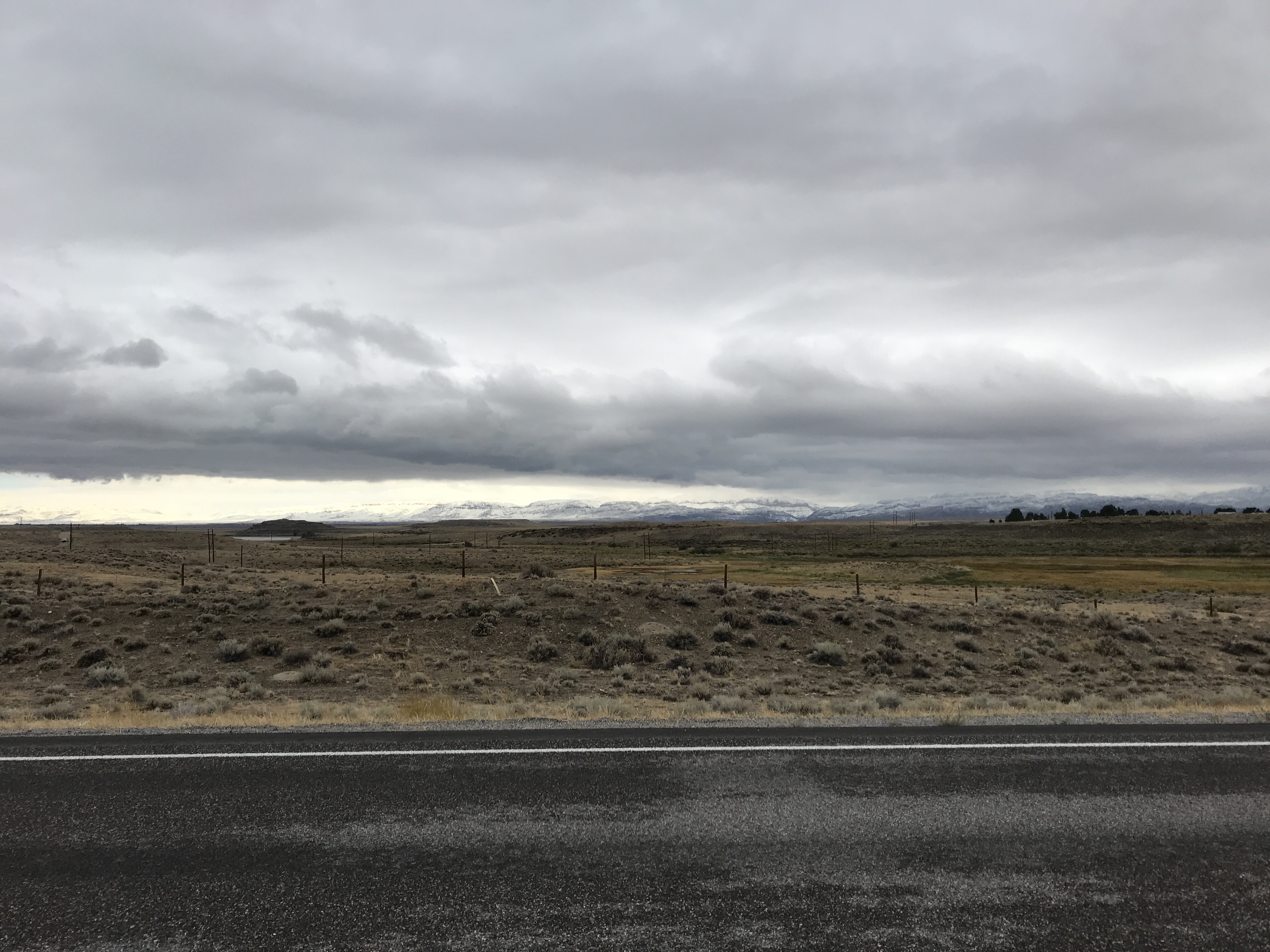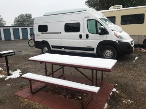 As we drove down the highway, we had plans to make it all the way to Casper, WY, but wind gusts of 30-40 miles per hour left us drained and ready to settle down about 100 miles short. So we got groceries, gas, and other supplies and found camping in Riverton, WY. It wasn’t a fancy place, but it had water and electric hookups – good enough for us and to ensure heat for the night! As soon as we settled in, the temperatures began to fall and before we knew it, we were running back and forth to the laundry room in wet heavy snow. It continued overnight and we woke up to an inch or two piled on the motorhomes and picnic tables. My first snow storm of the season! Haha