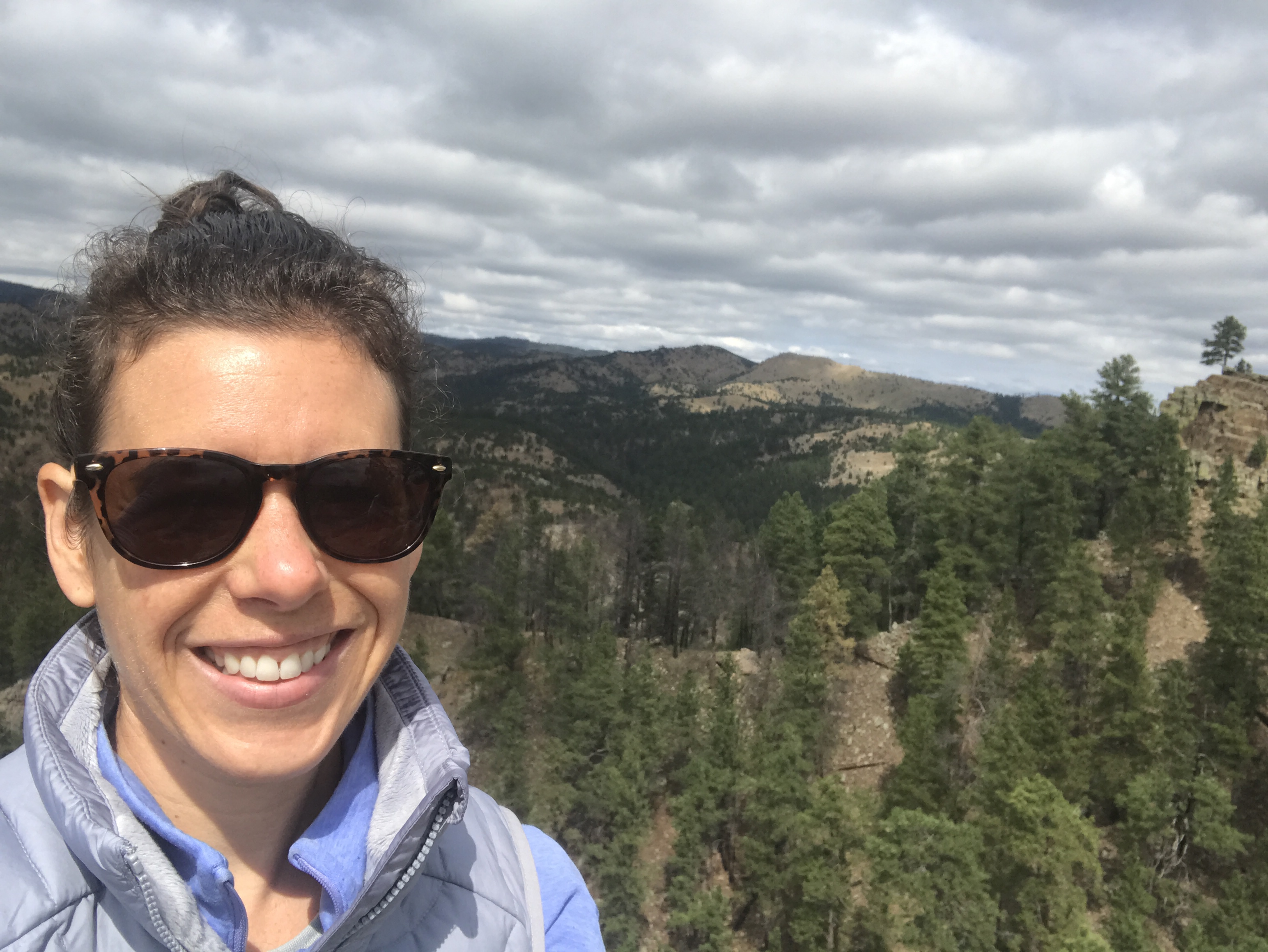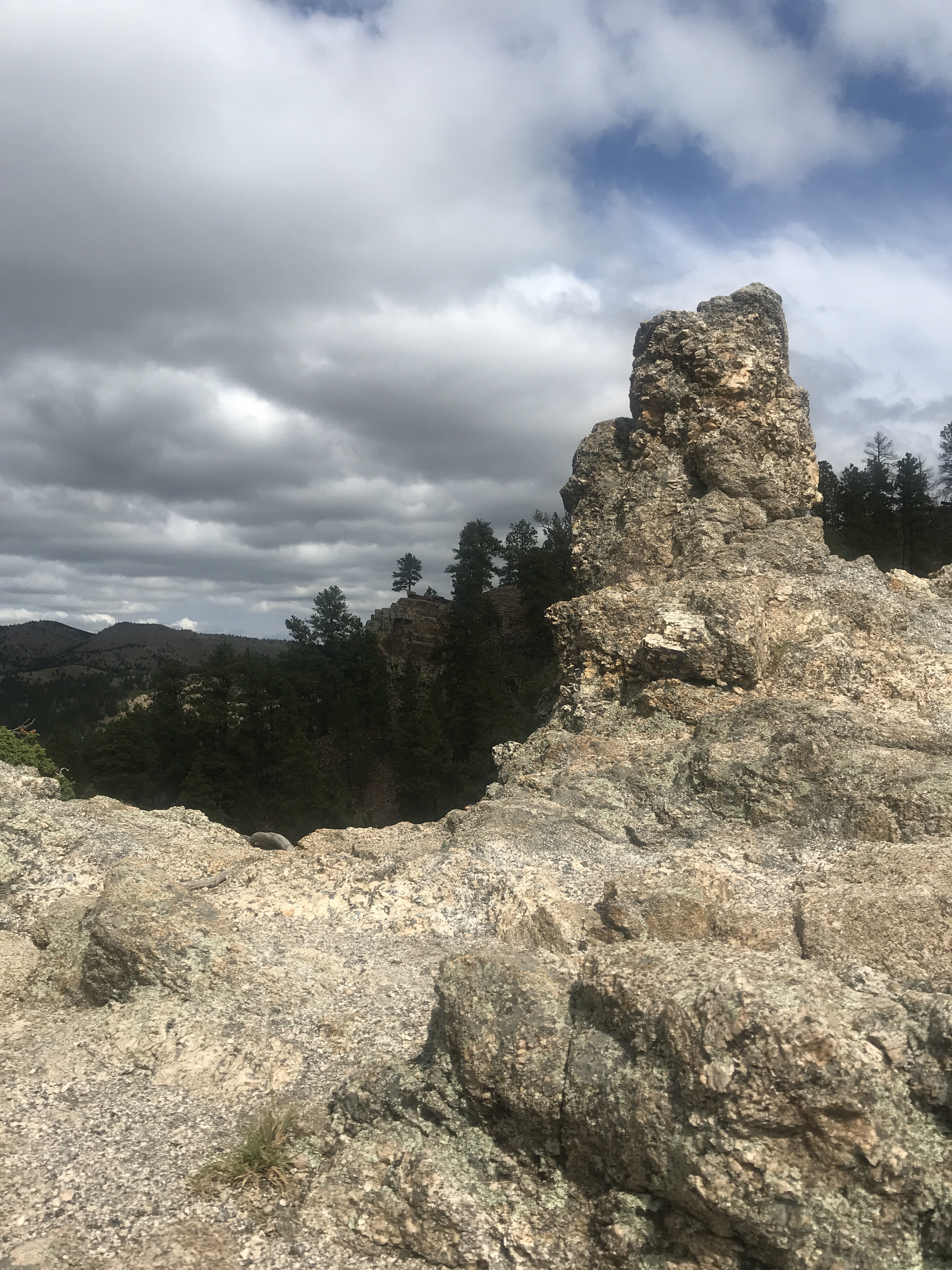 After our tour of the Visitors Center, we drove over to the Lovers Leap trailhead for a late morning hike. With guidance from a park ranger, we headed up the steep left side of the loop to the lookout point. We climbed the tree line trail to the ridge and then walked across the new growth forest. Soon we came upon the poem the ranger mentioned and scrambled up the rocks to the right for the 360 degree view, a well kept secret. Up top we saw the Black Hills roll in all directions. We settled down for lunch and soaked up the sun. Soon we had a tiny chipmunk visitor dart around us, looking for a free handout, but it was sadly disappointed. There were plenty of pine cones around, so I knew it would be well fed.