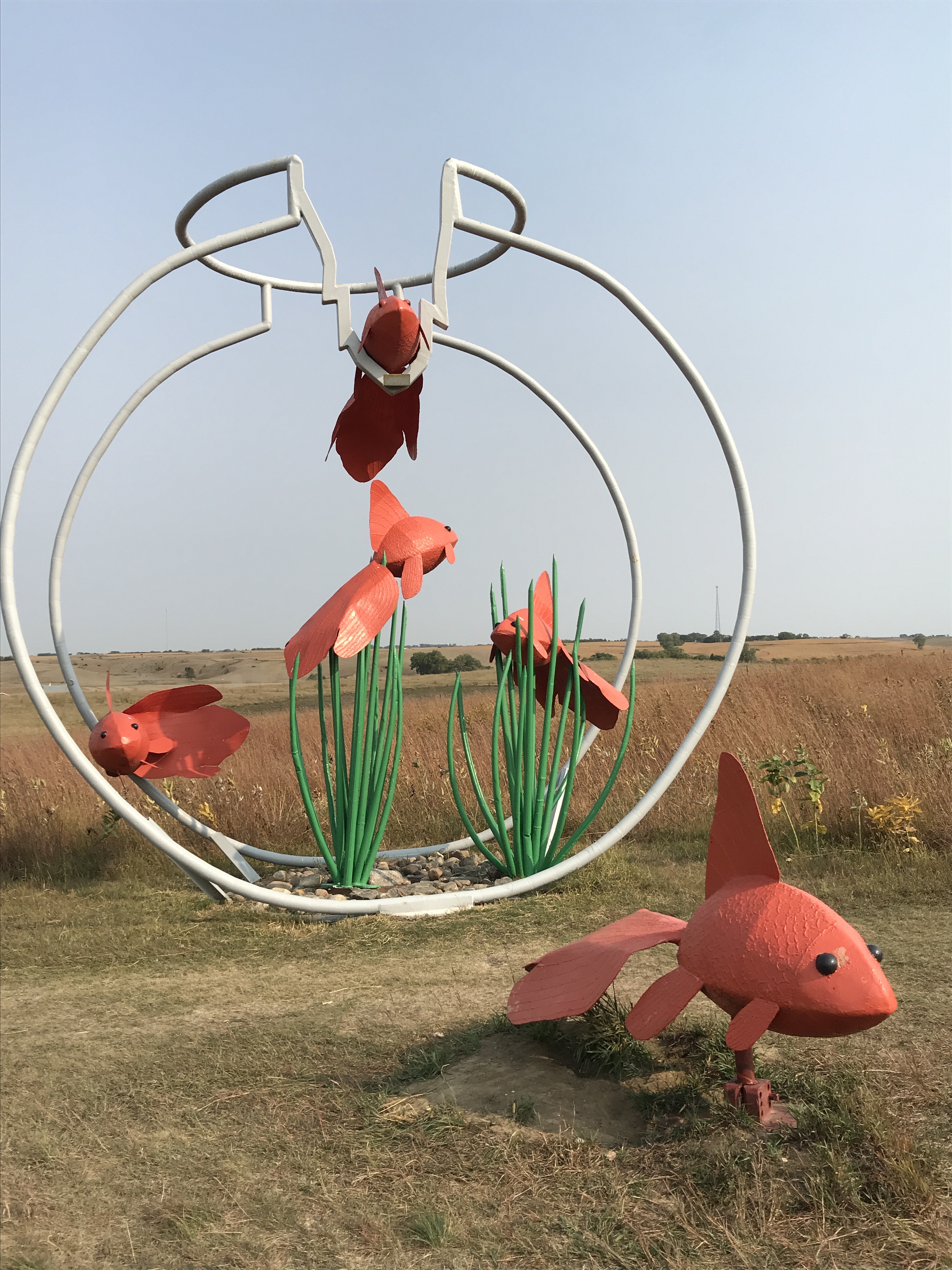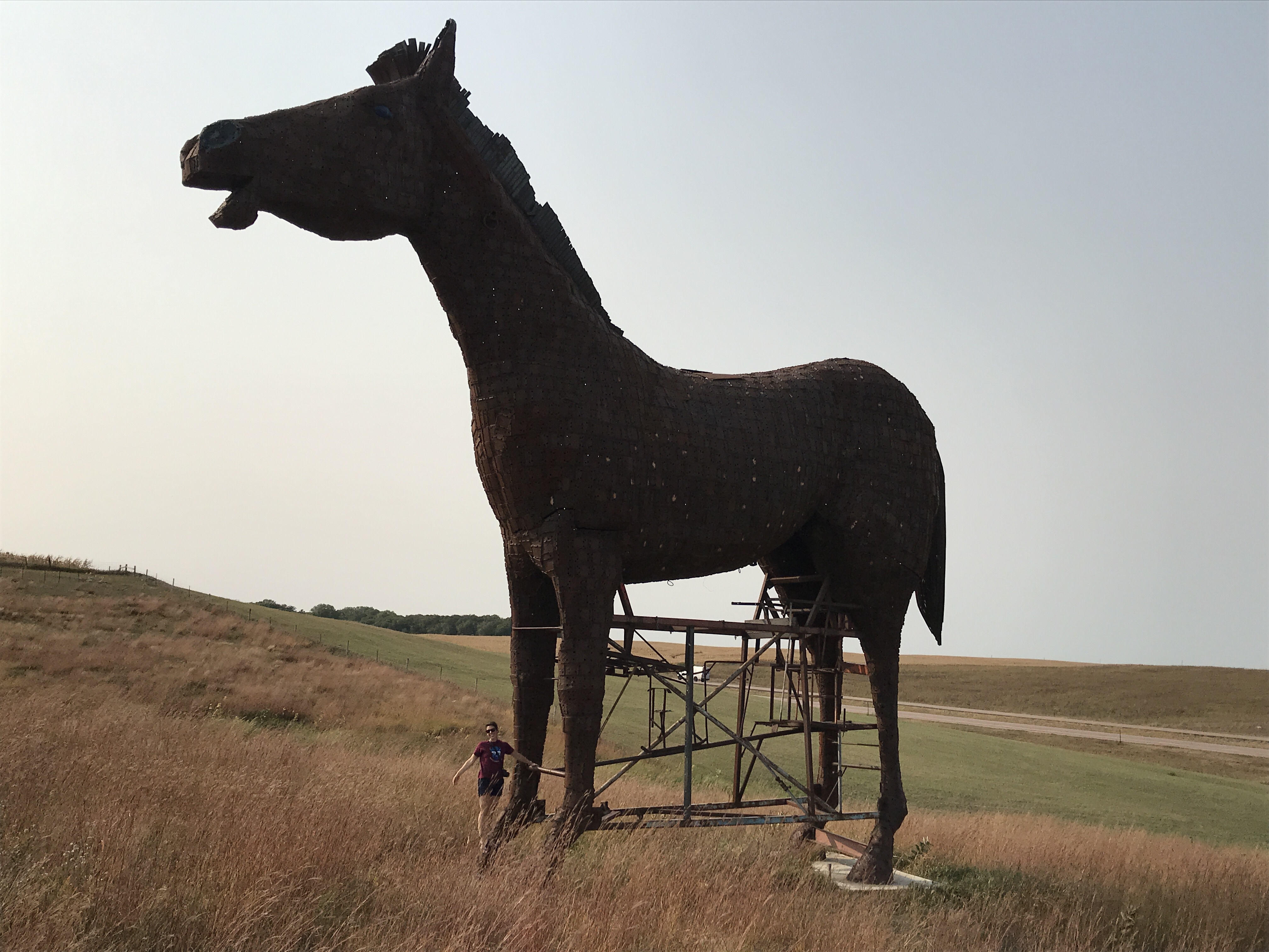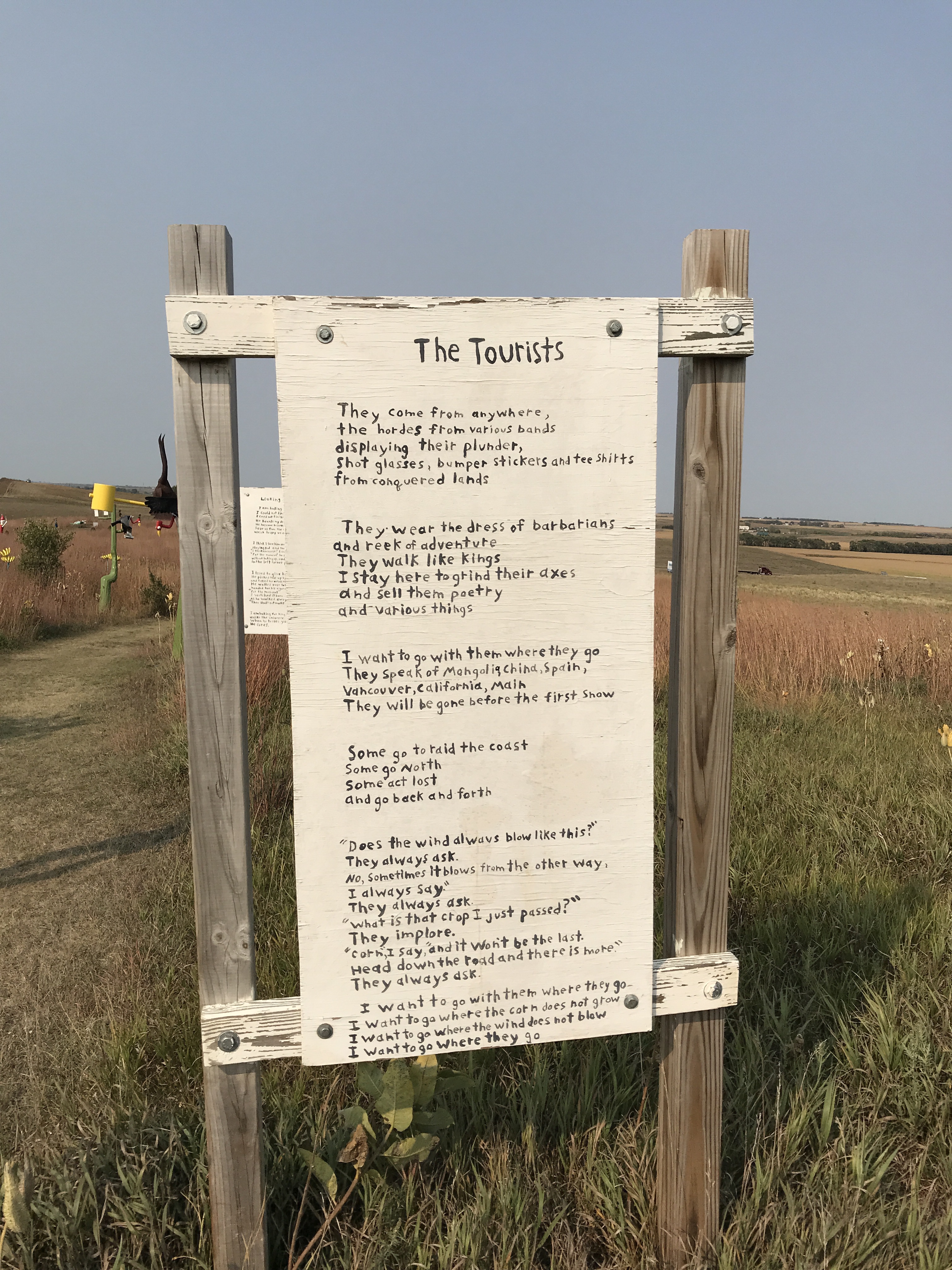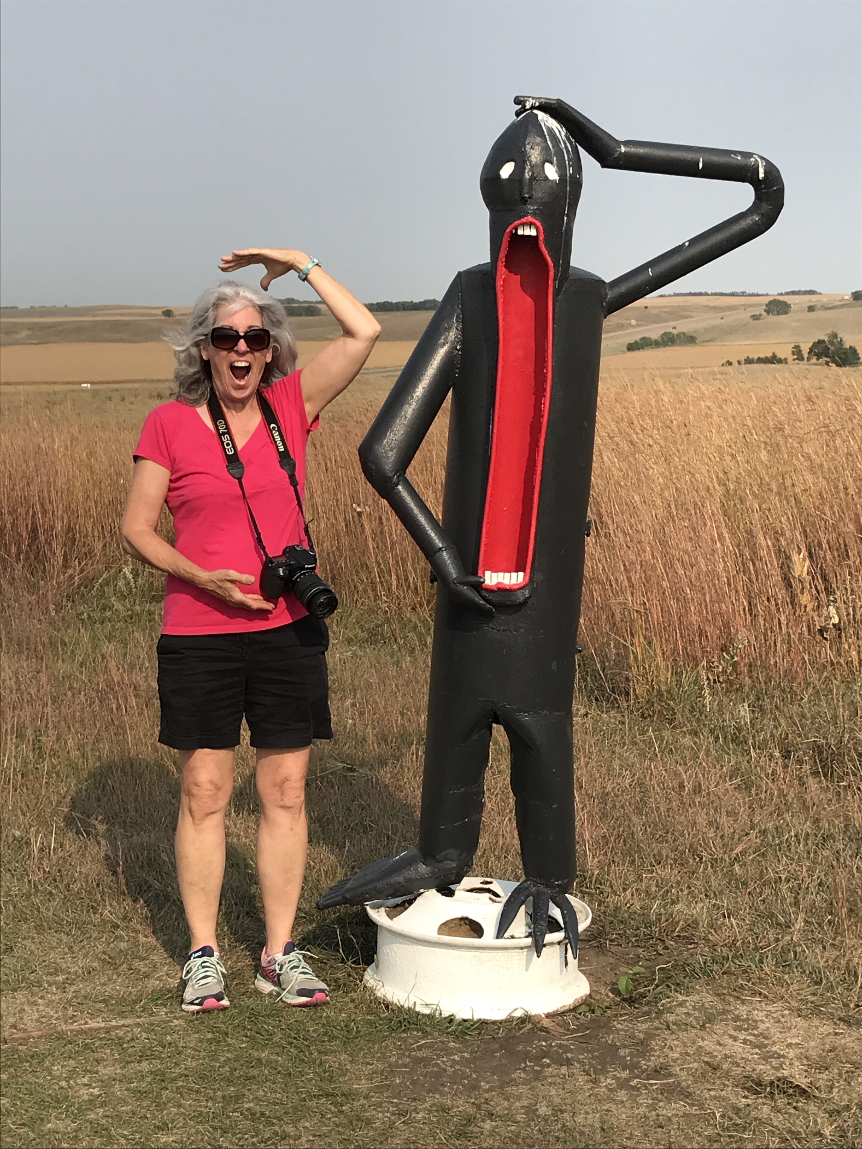 Soon we were rolling down the highway again to the South Dakota/Iowa border. The highways are wide and level, sometimes with a slowly inclining hill, and straight. A few hundred miles later and it was time for another break. Our second find of the day was Porter Sculpture Park, just a few miles from our state park campground.
