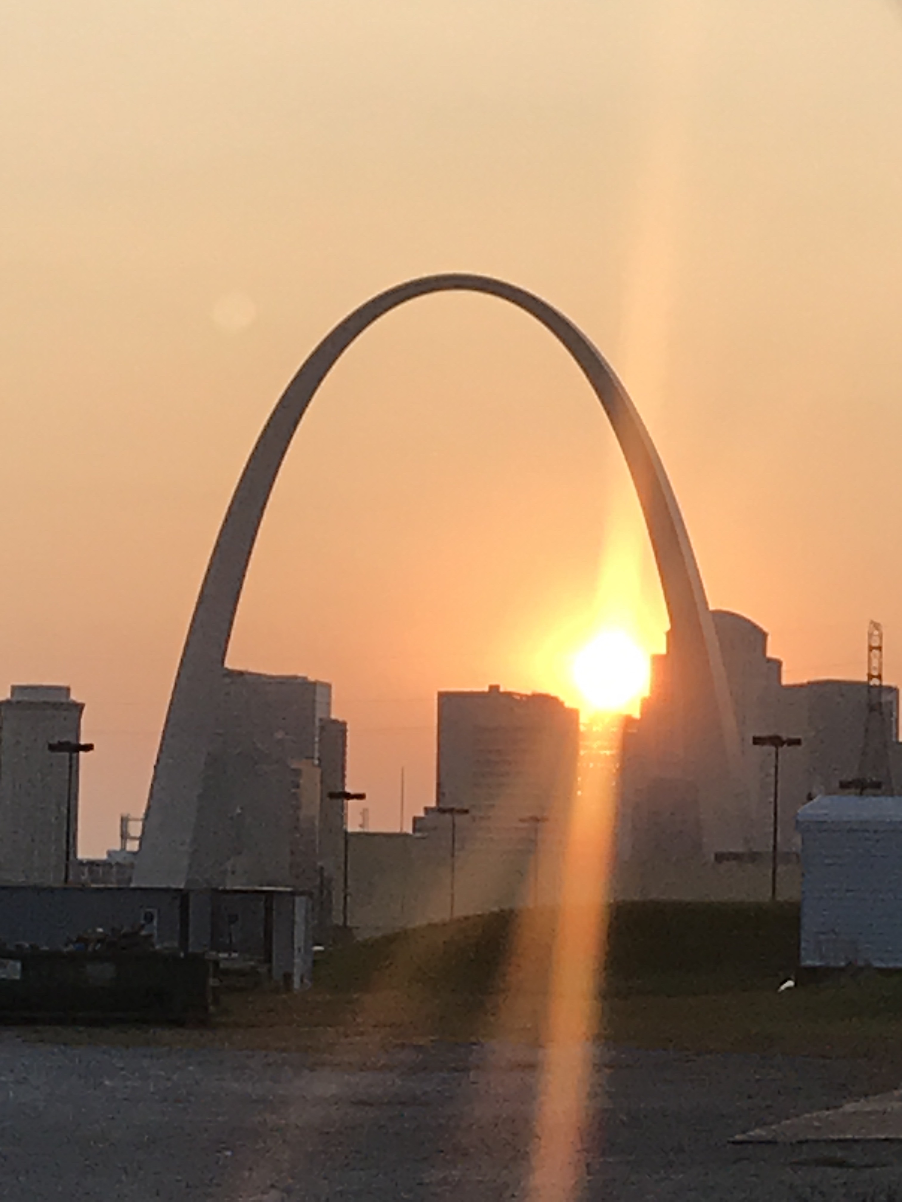 We drove across the Mississippi River, wide, brown, and quickly flowing, to the RV Park at The Casino Queen. While nothing too special, largely a paved parking lot with hookups, it provided a quiet and secure spot for the night. The lovely part was that it provided a great view of The Gateway Arch.