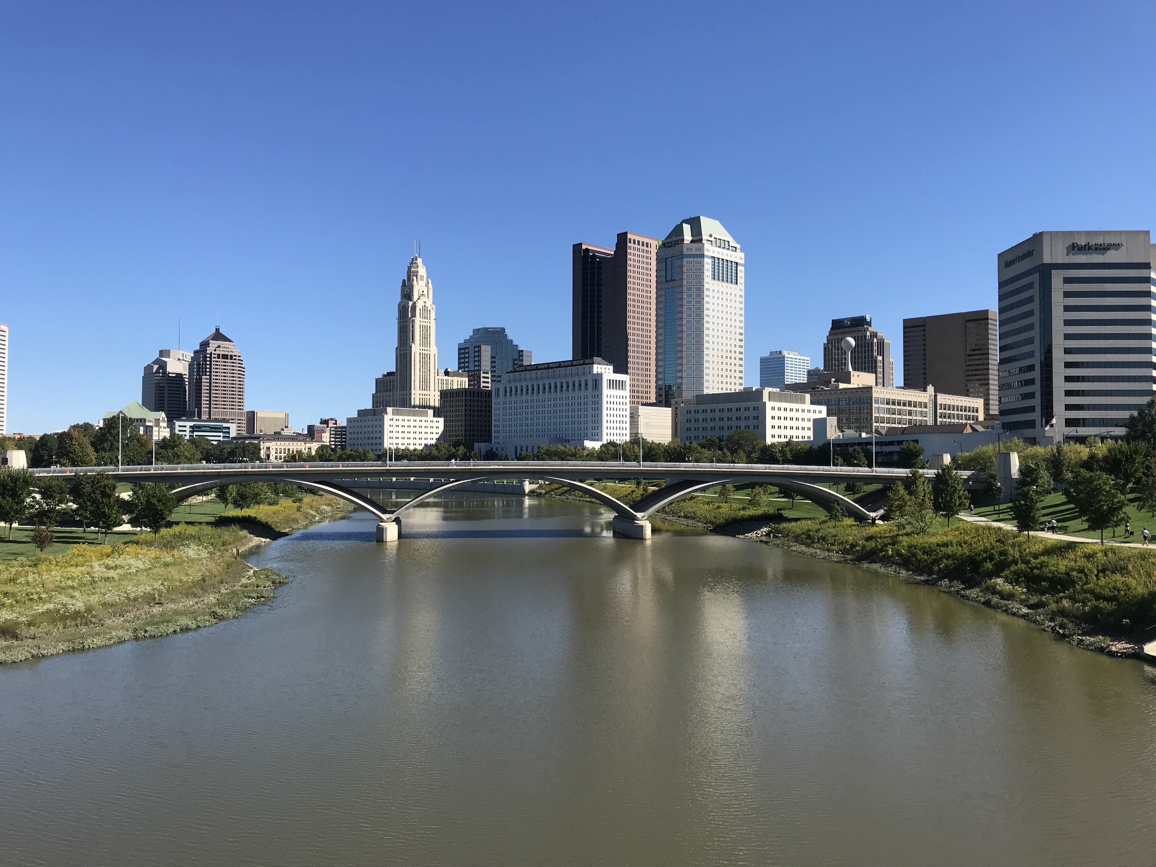 The city of Columbus has a lovely walkway along the Scioto River. A vibrant green park stretches along both sides of the river, from the city edge down to the water. Trees and flowers decorate the parks and line the wide pathway that is busy with walkers, runners, and scooter riders. The river flows peaceful beside you, under tall bridges in various designs.