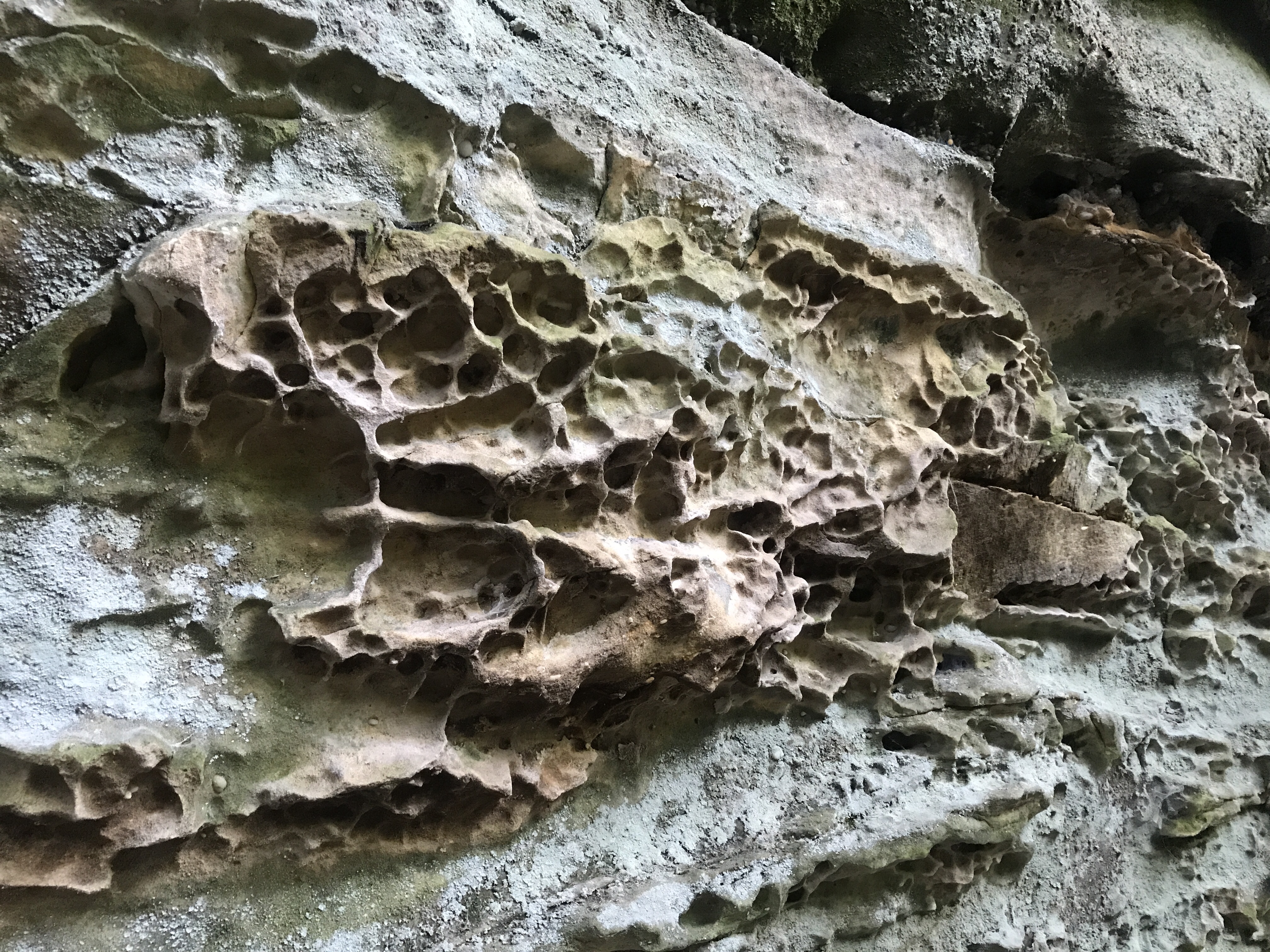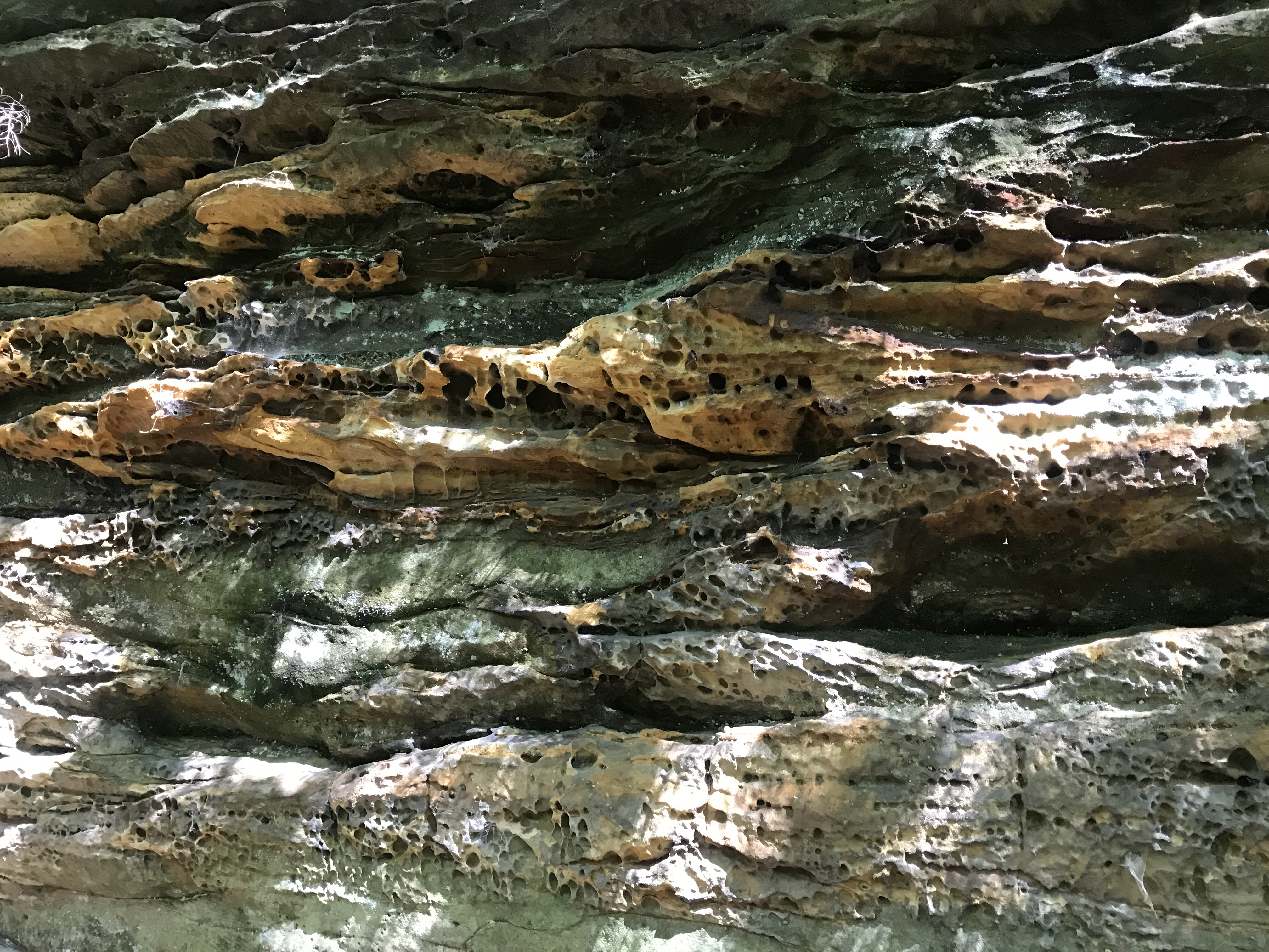 As the path winds to the bottom of the ledges, you are treated to a rainbow of colors streaking across pot-marked stone. In places the rock is a collection of tiny stones embedded in the sandstone, like concrete. The walls bend and wave, sometimes creasing in and making hallways to explore. There are little caves here and there, some closed off to protect bats, others free to explore.