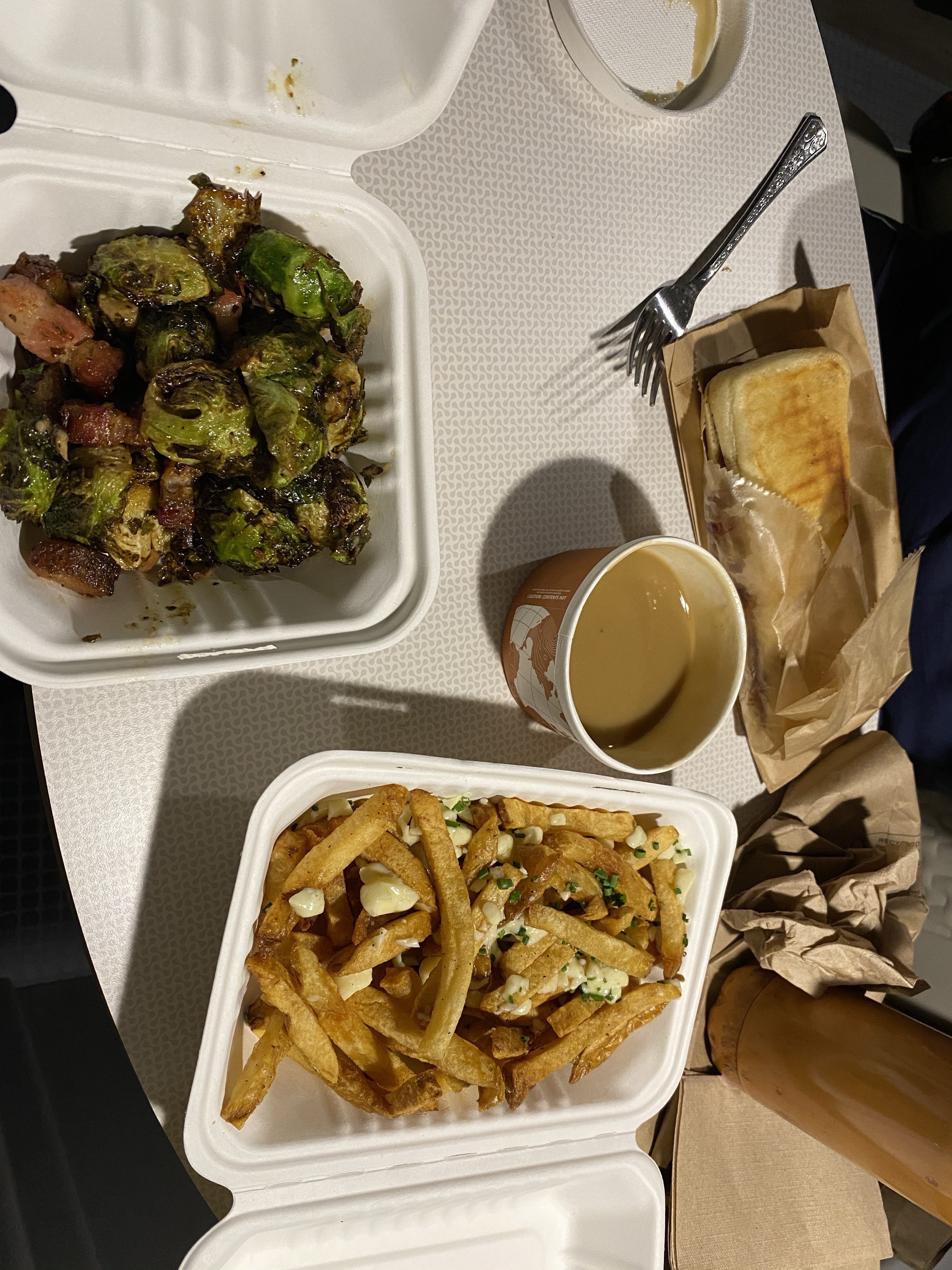 We passed the afternoon and evening with boardgames at the table – Spot It!, Speed, and Uno. And ordered poutine and roasted brussel sprouts from Duckfat downtown. We saved our spot at UFF with a cone we borrowed from the loading dock and drove over to grab it hot out of the fryer. Overall, despite the rain, it was a great first day away.