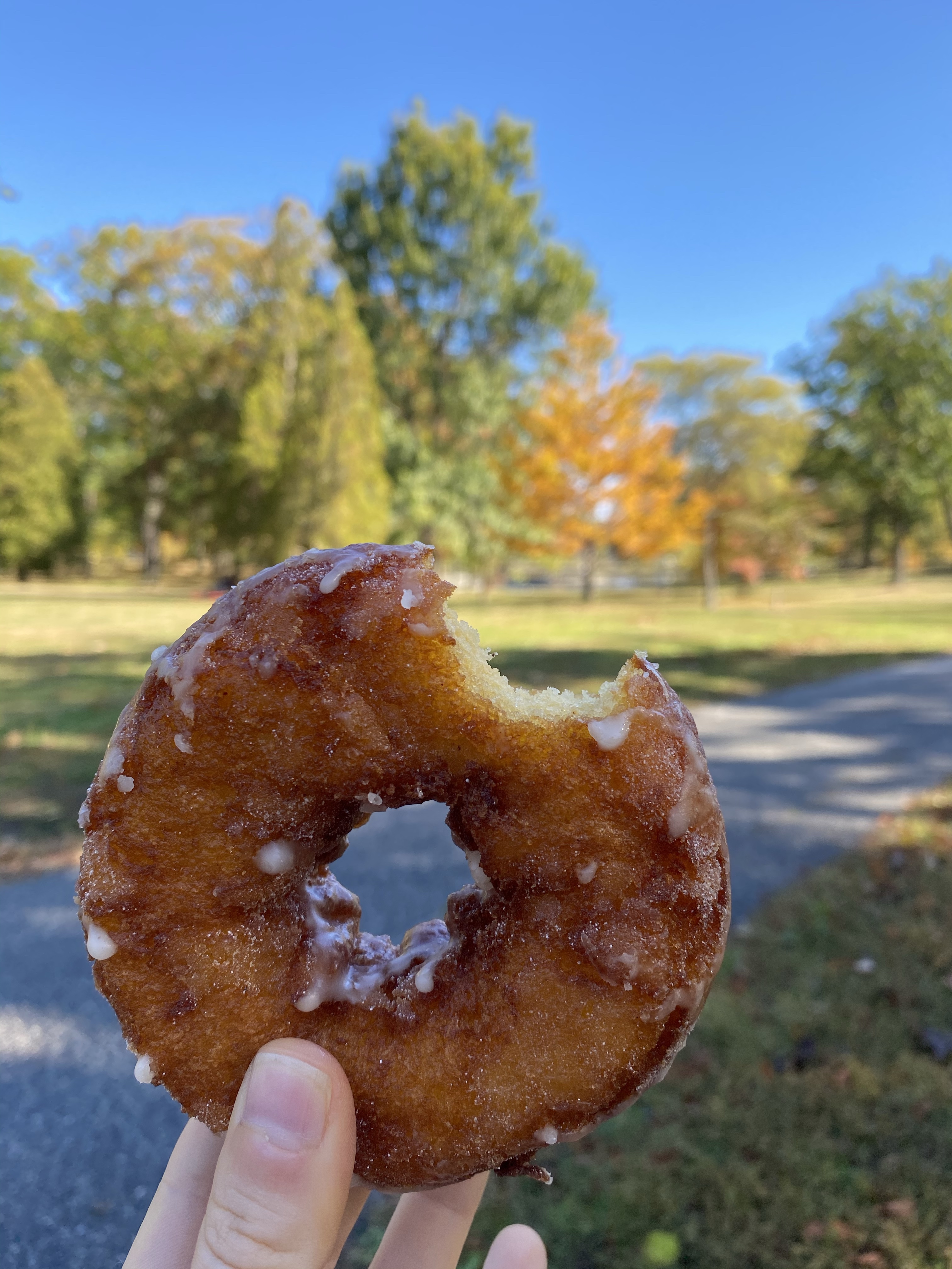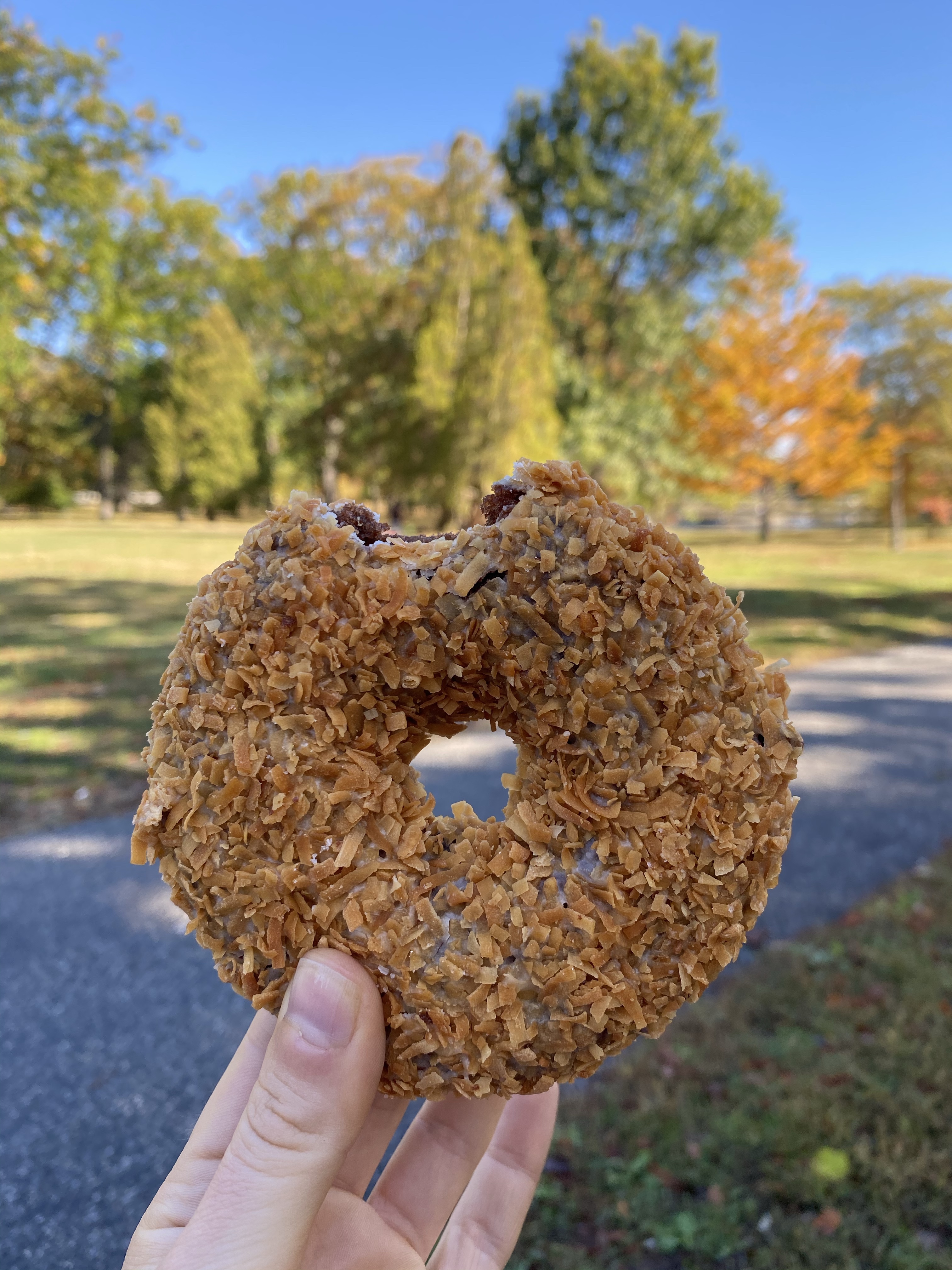 We walked through new parts of Portland, by parks and various community buildings, greeting everyone we saw, until we arrived at the shop full of hope. And guess what? They still had PLENTY of gf options. Totally worth the 2 mile walk! Plus, they had hot apple cider to warm up our chilled hards. Win. I picked out a chocolate glazed, a chocolate toasted coconut, and an apple cider donut to try. Three isn’t too many, right? With mouths watering, we hurried over to the park and found a lovely bench to sit in as we dove into our treasures. And they didn’t disappoint! Even the seagull nearby knew they were tasty – he kept trying to sneak in for a taste. I was feeling generous that day and left behind a few crumbs for it. 😉