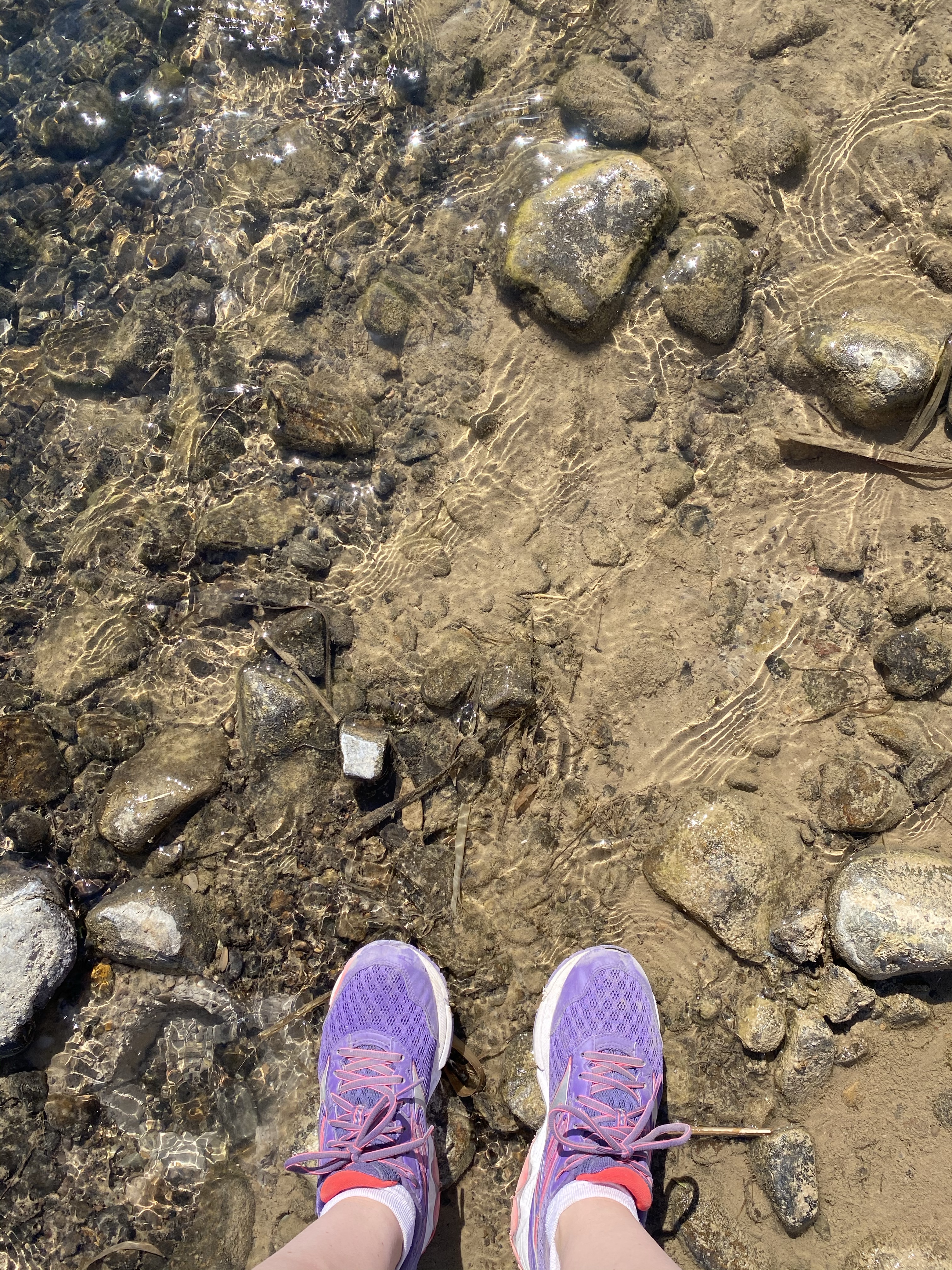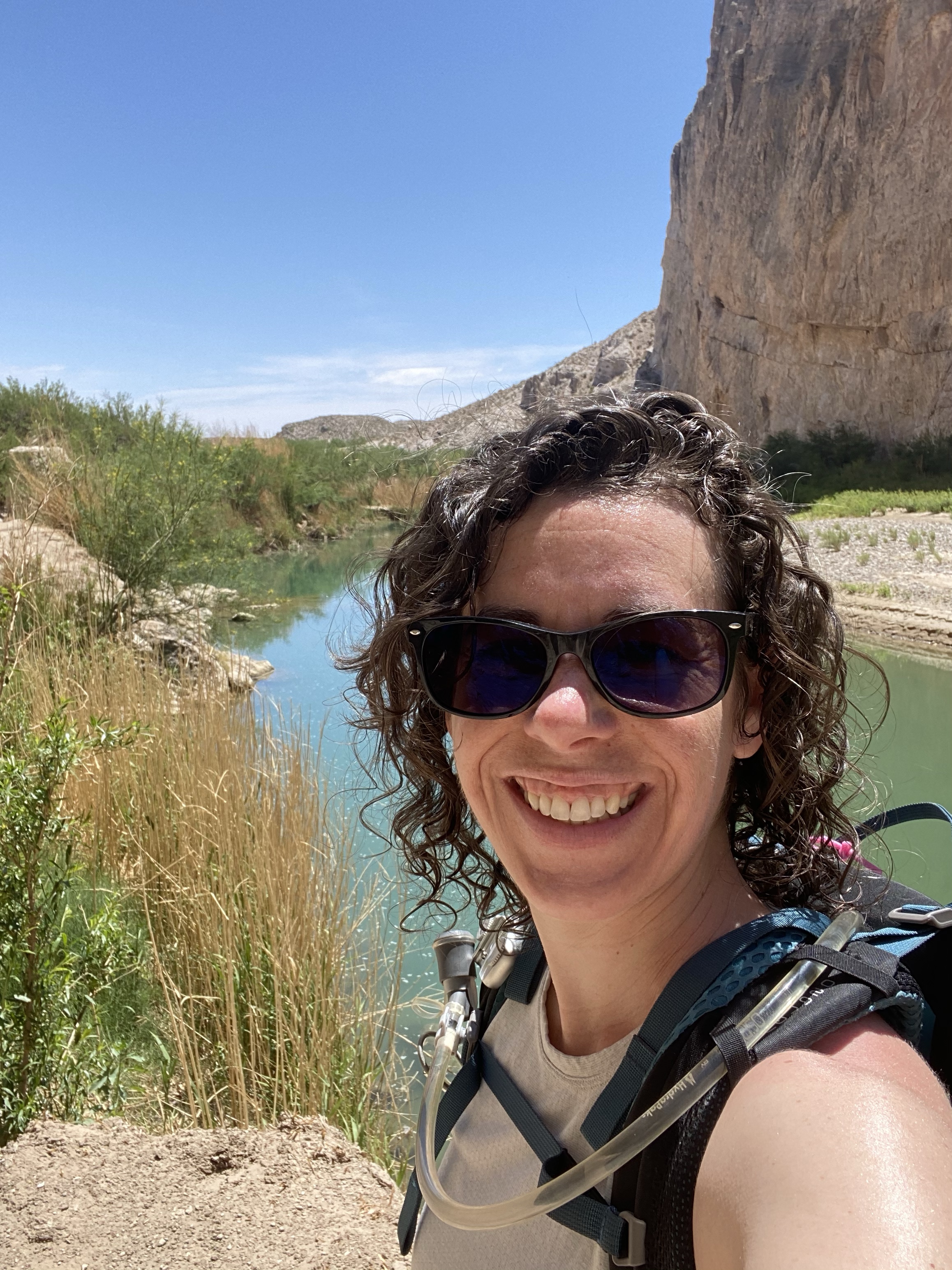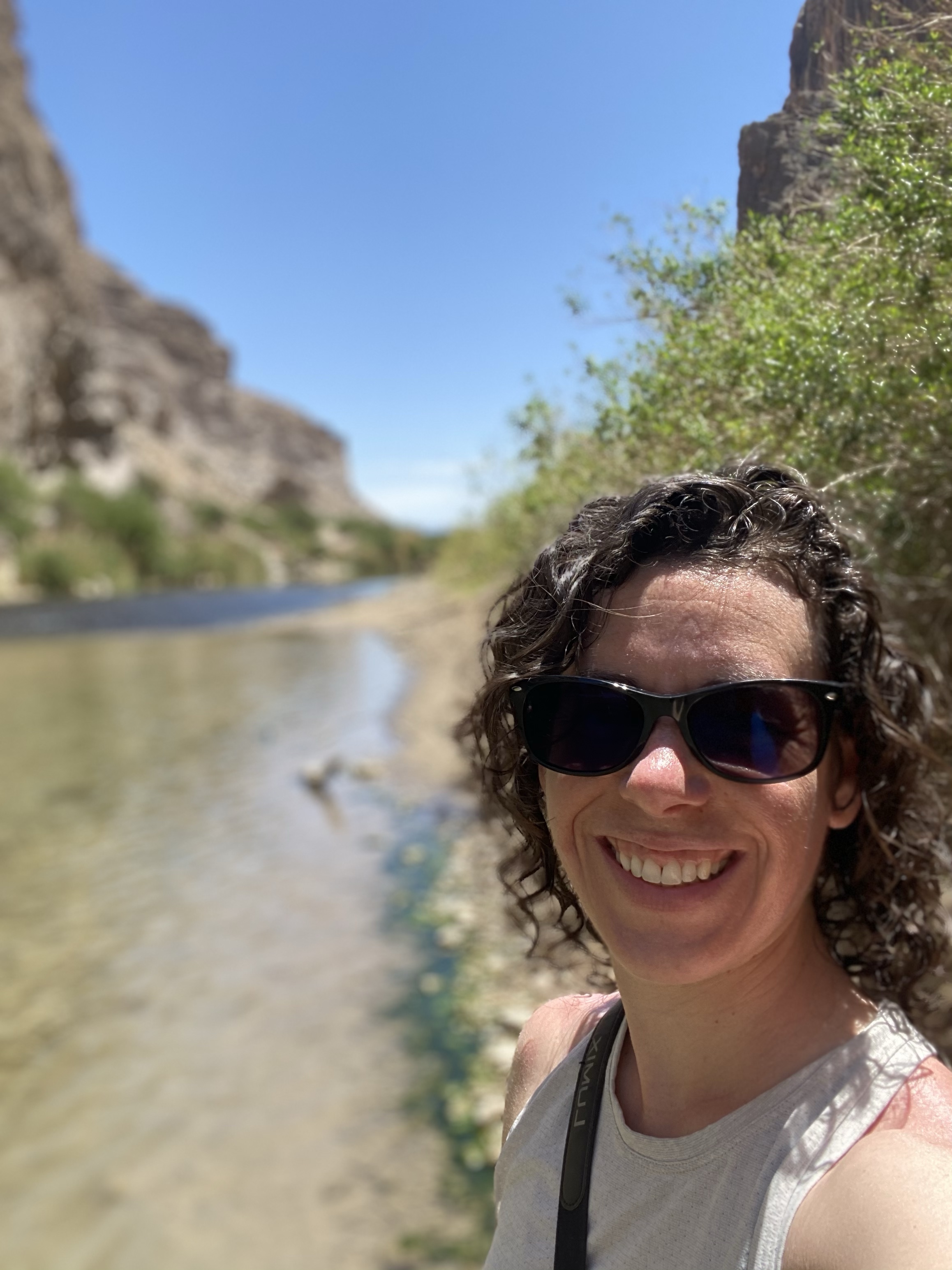 Then on I went to the river, wide but shallow, bending around through the high walled canyon. I kept going until the end of the path, where the sand ended and the water continued. Prepared with my sandals, I dipped my toes in and was surprised to find the water fairly warm! I guess I shouldn’t have been surprised, it is 90 plus degrees almost every day right now. A step or two in wasn’t enough though and shortly I was wading across to the other side. The water never reached above my knees, but it still took effort to push through the current. Then all of the sudden, I was in Mexico! I stayed long enough for a picture, but then my rule following inner voice starting shouting, “You don’t have your passport!” and I quickly made my way back. But now I can say, “I’ve been to Mexico!” Kind of.