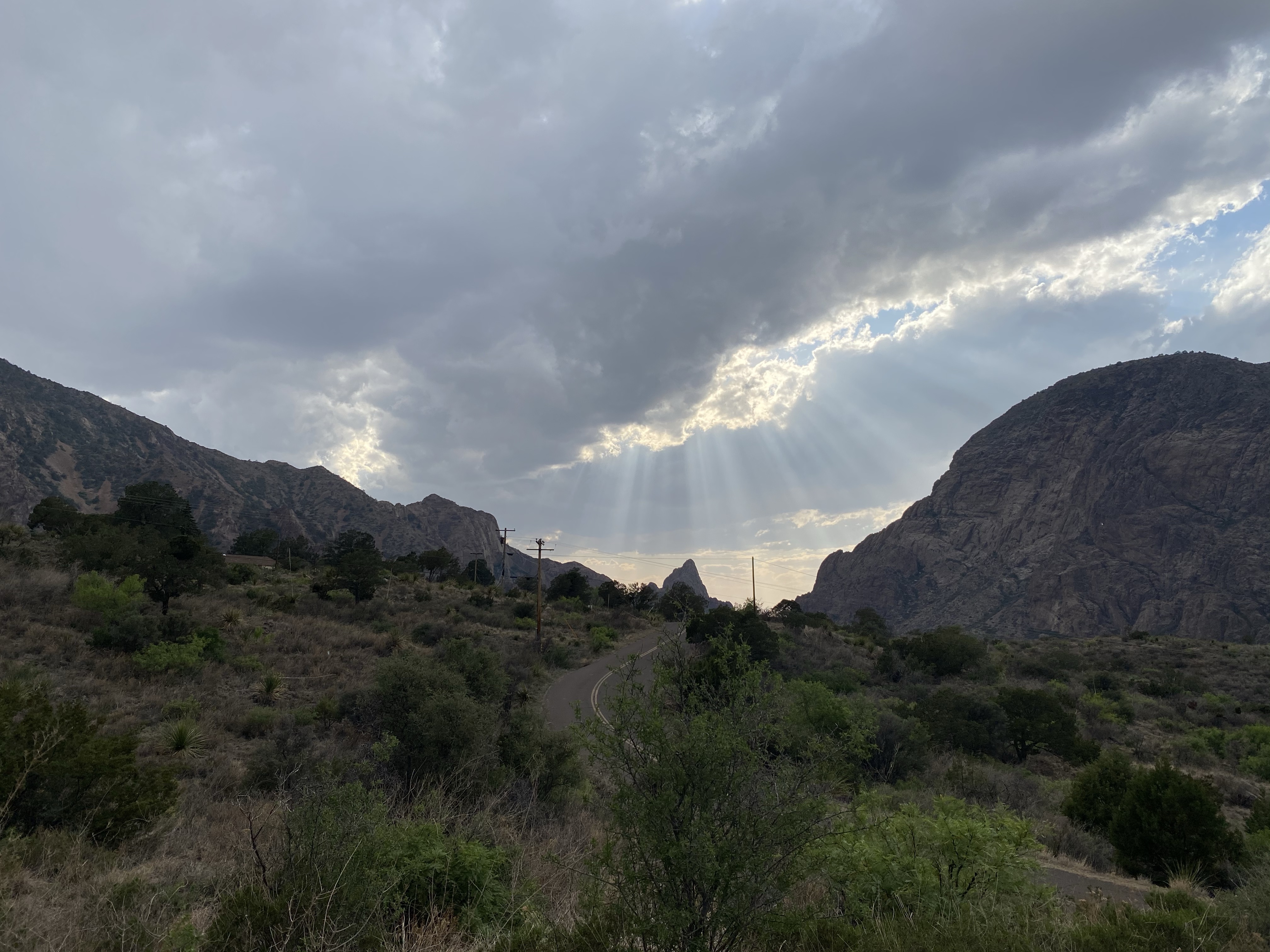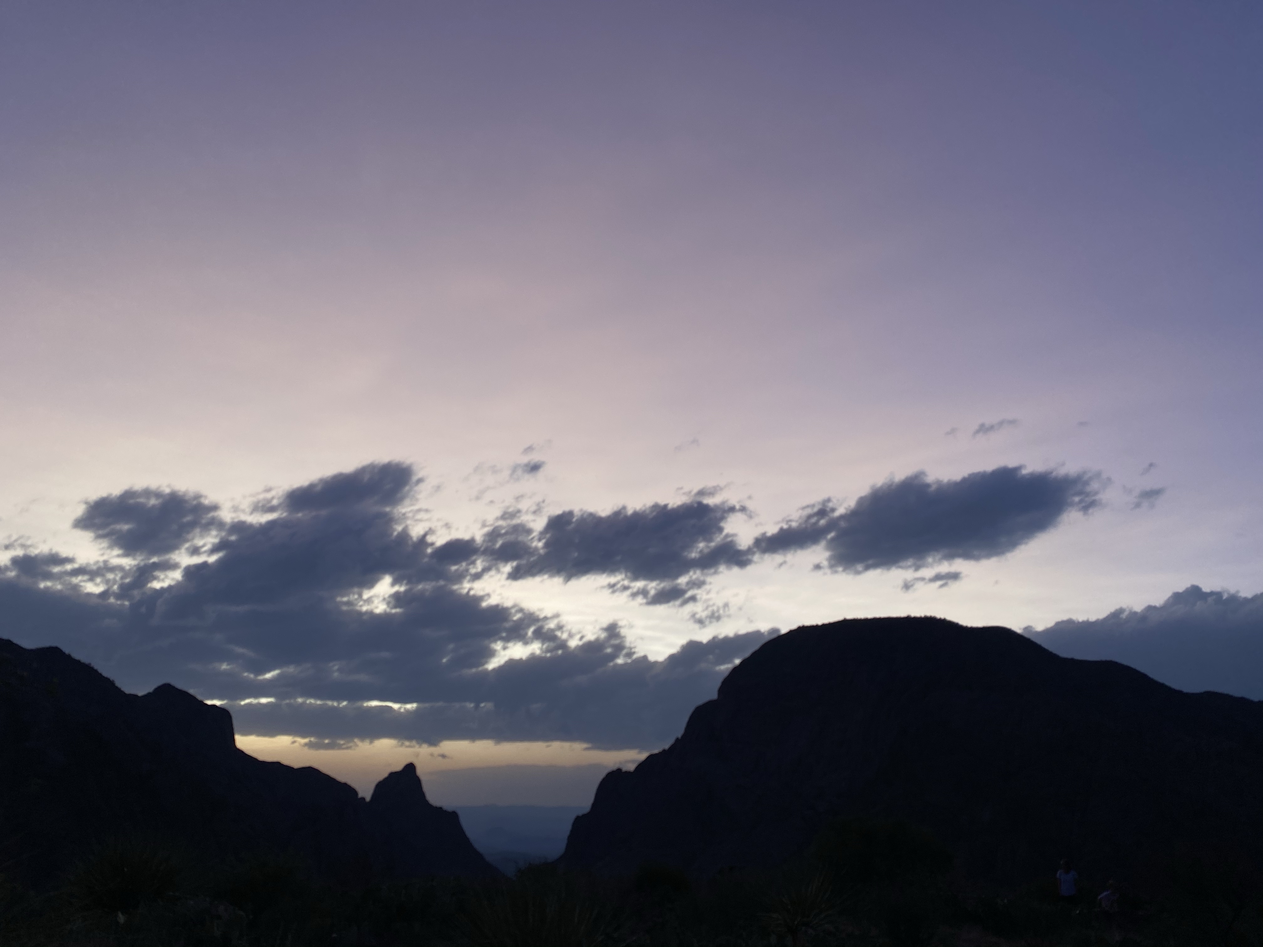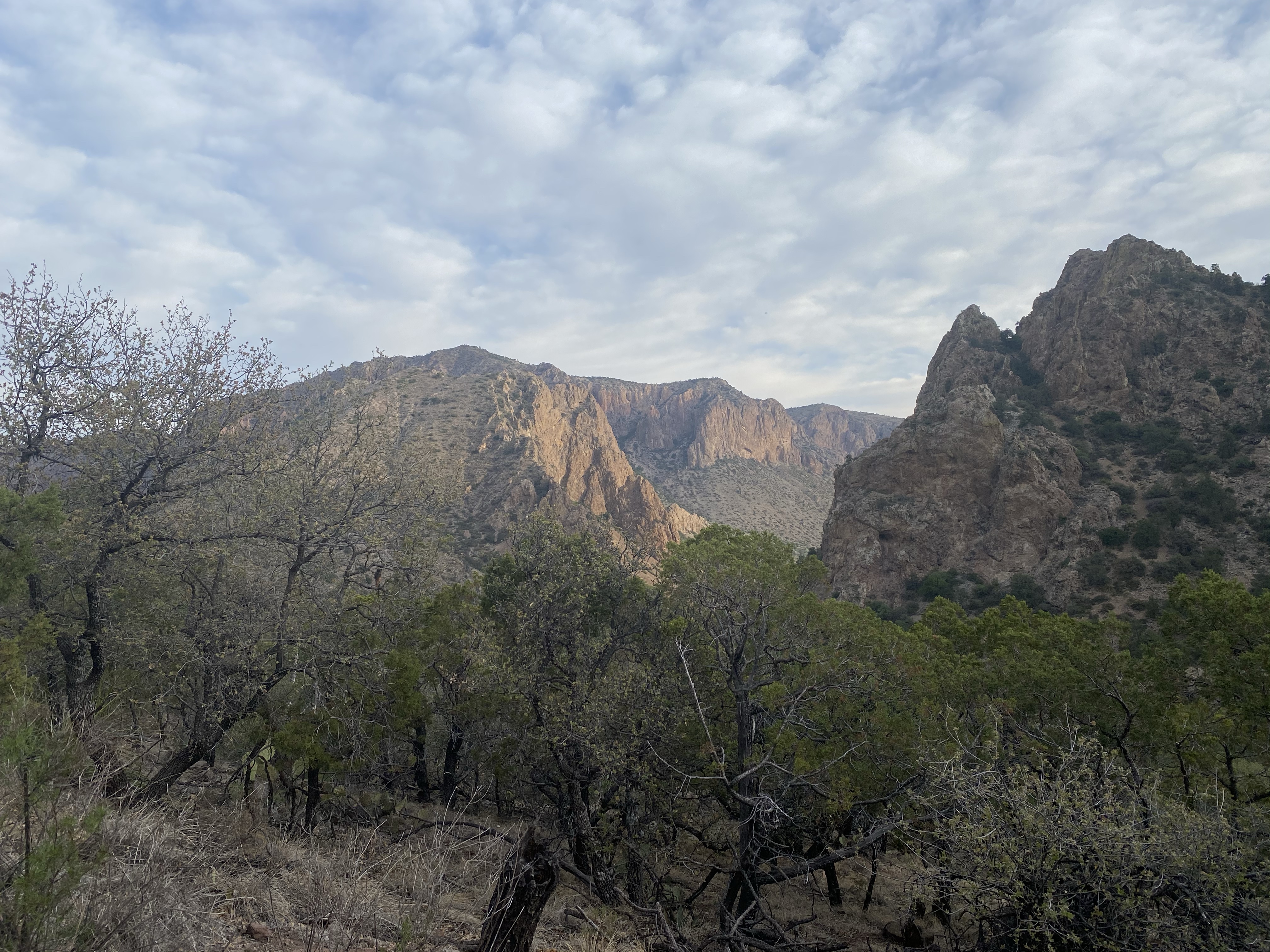 On my way down, I encountered three people from the fire crew, watching a smoldering spot of forest on the slope across the canyon. This part of the park had a large fire the week before my visit and was only recently contained. Many trails in the Chisos Basin area are still closed. These fire observers were making sure the still burning spot stayed put, far away, so the trail and area could remain open. They explained that it was a difficult area to contain and manage because of the steep slopes there. Luckily the fire hadn’t moved in a few days and rain was on the horizon. Hopefully whatever fell would be enough to naturally end the burning embers. (And I think it was as I have not heard anything about the fire in the days since.)