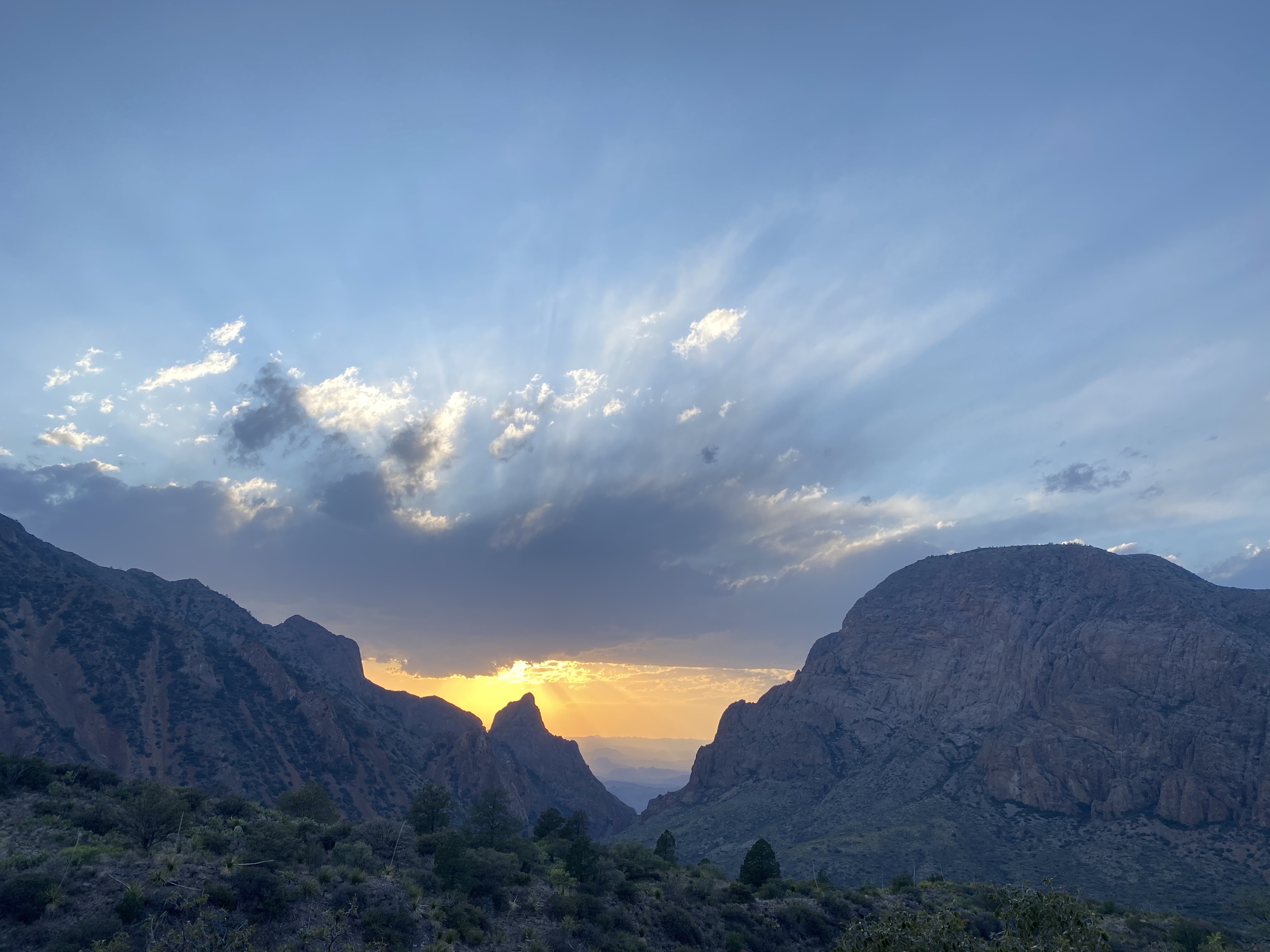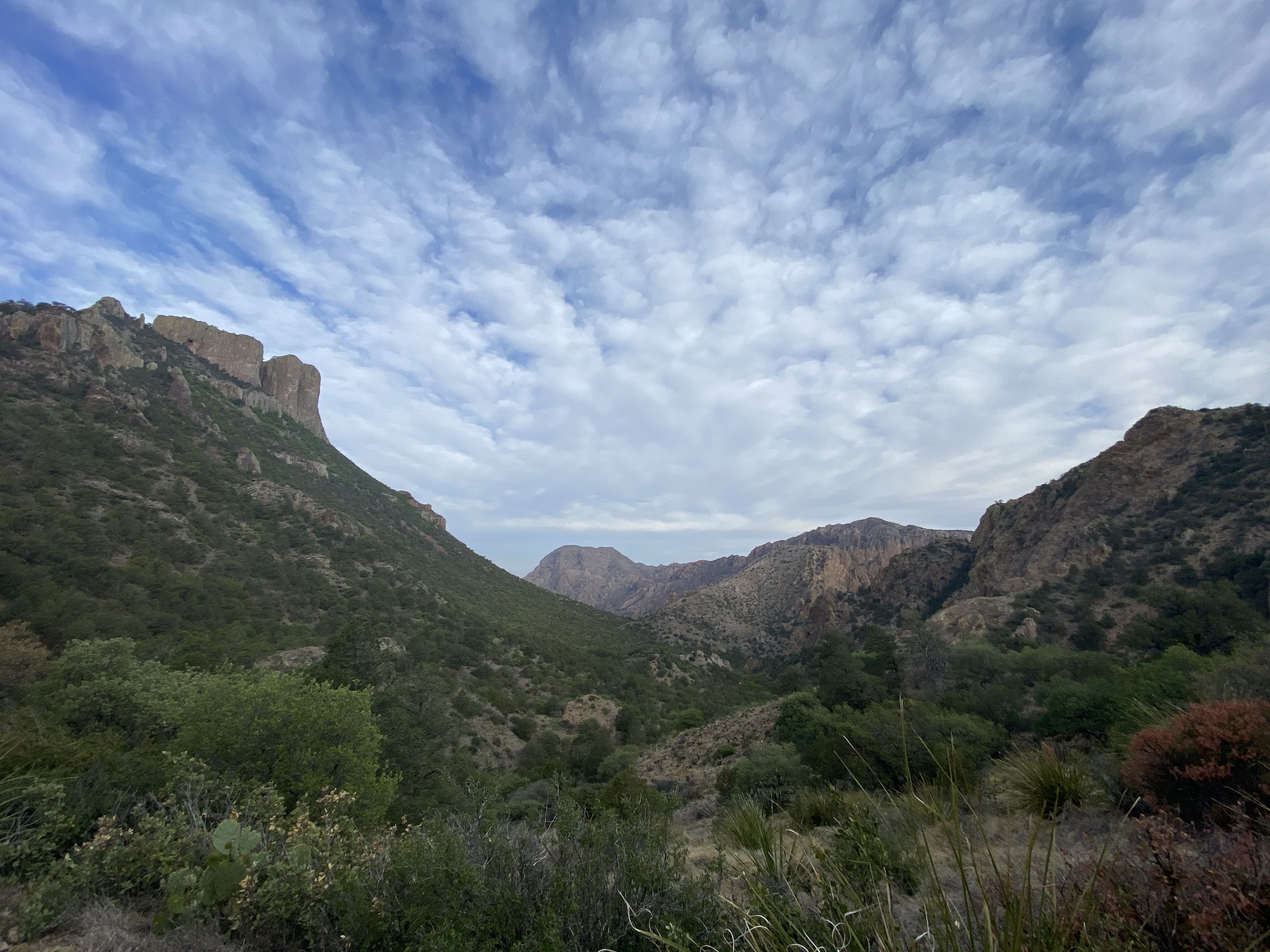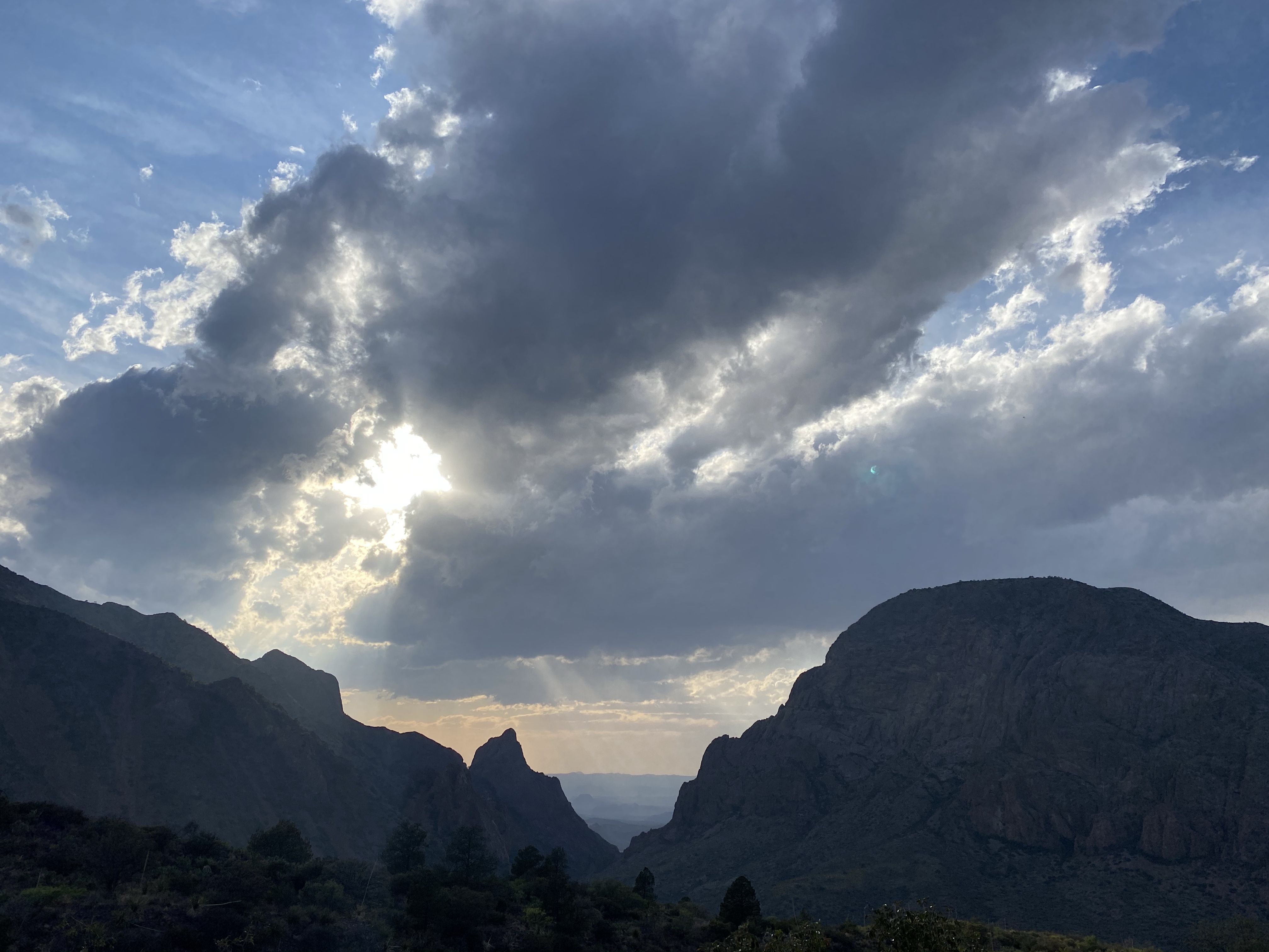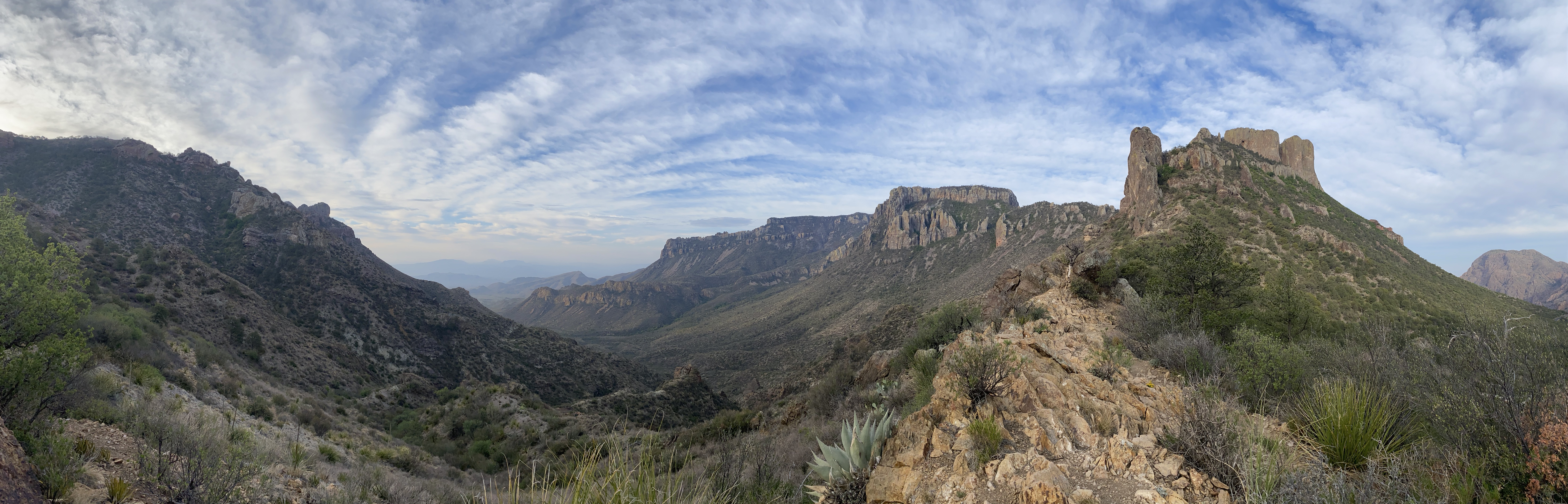 On my way down, I encountered three people from the fire crew, watching a smoldering spot of forest on the slope across the canyon. This part of the park had a large fire the week before my visit and was only recently contained. Many trails in the Chisos Basin area are still closed. These fire observers were making sure the still burning spot stayed put, far away, so the trail and area could remain open. They explained that it was a difficult area to contain and manage because of the steep slopes there. Luckily the fire hadn’t moved in a few days and rain was on the horizon. Hopefully whatever fell would be enough to naturally end the burning embers. (And I think it was as I have not heard anything about the fire in the days since.)