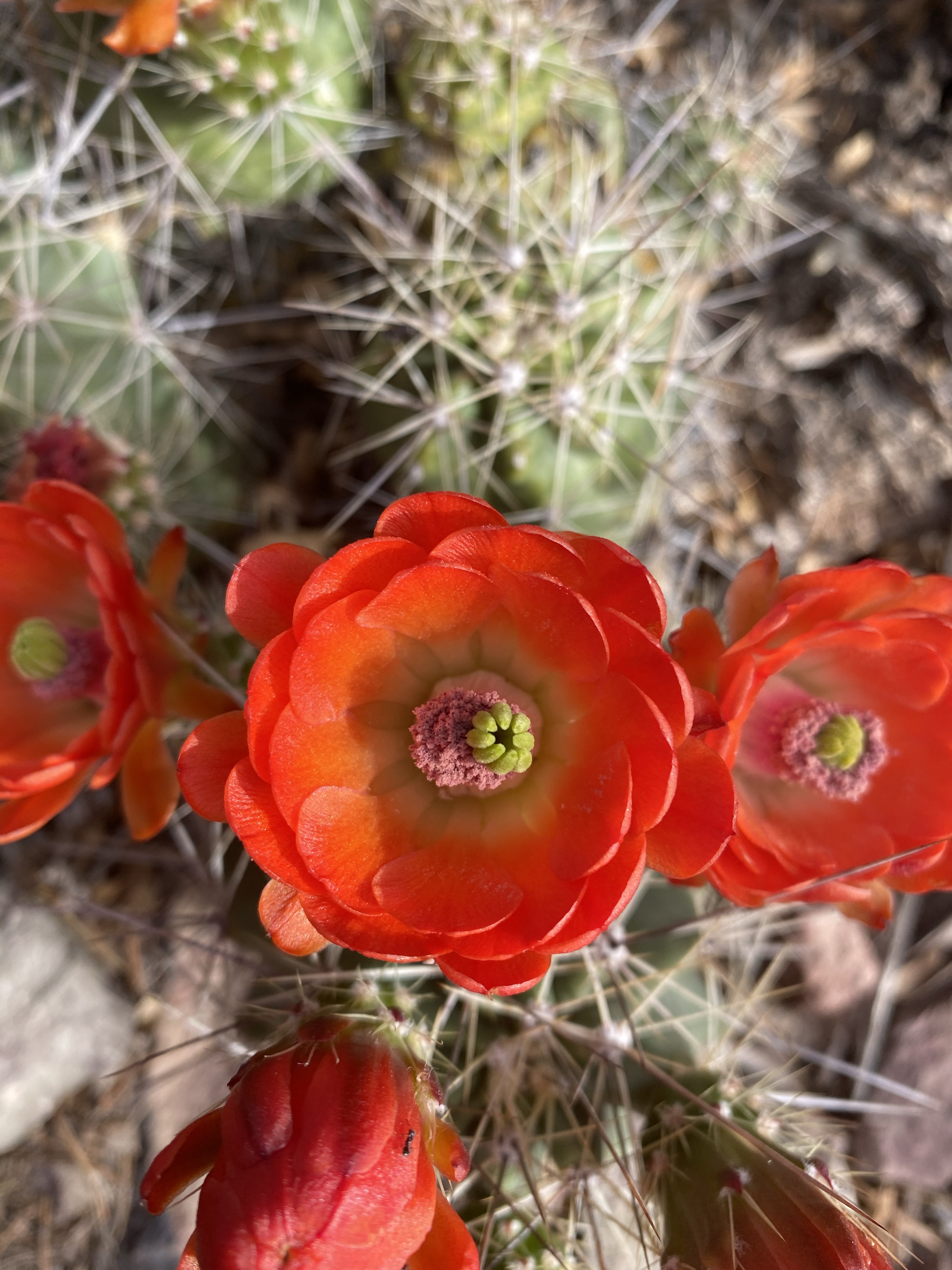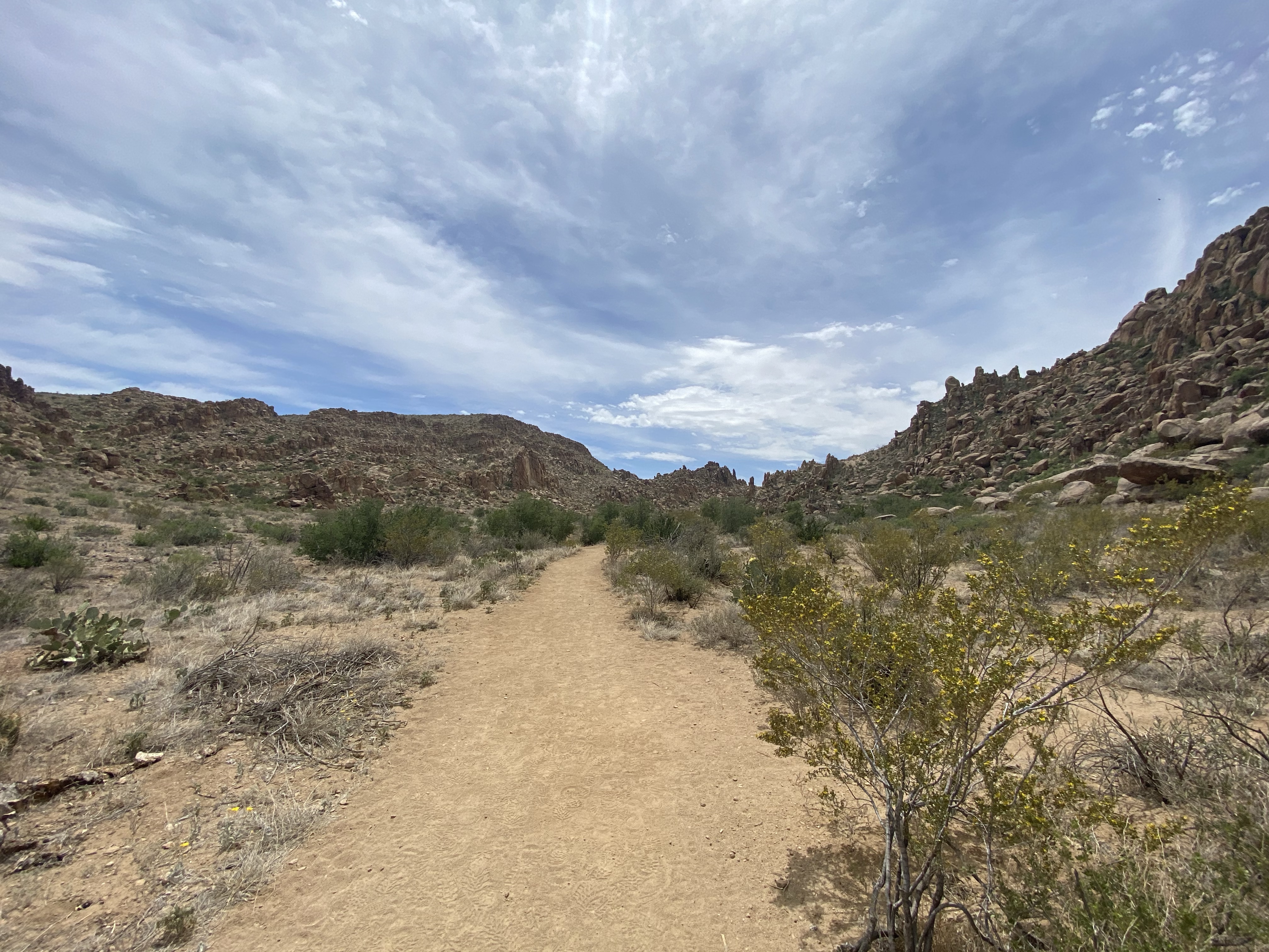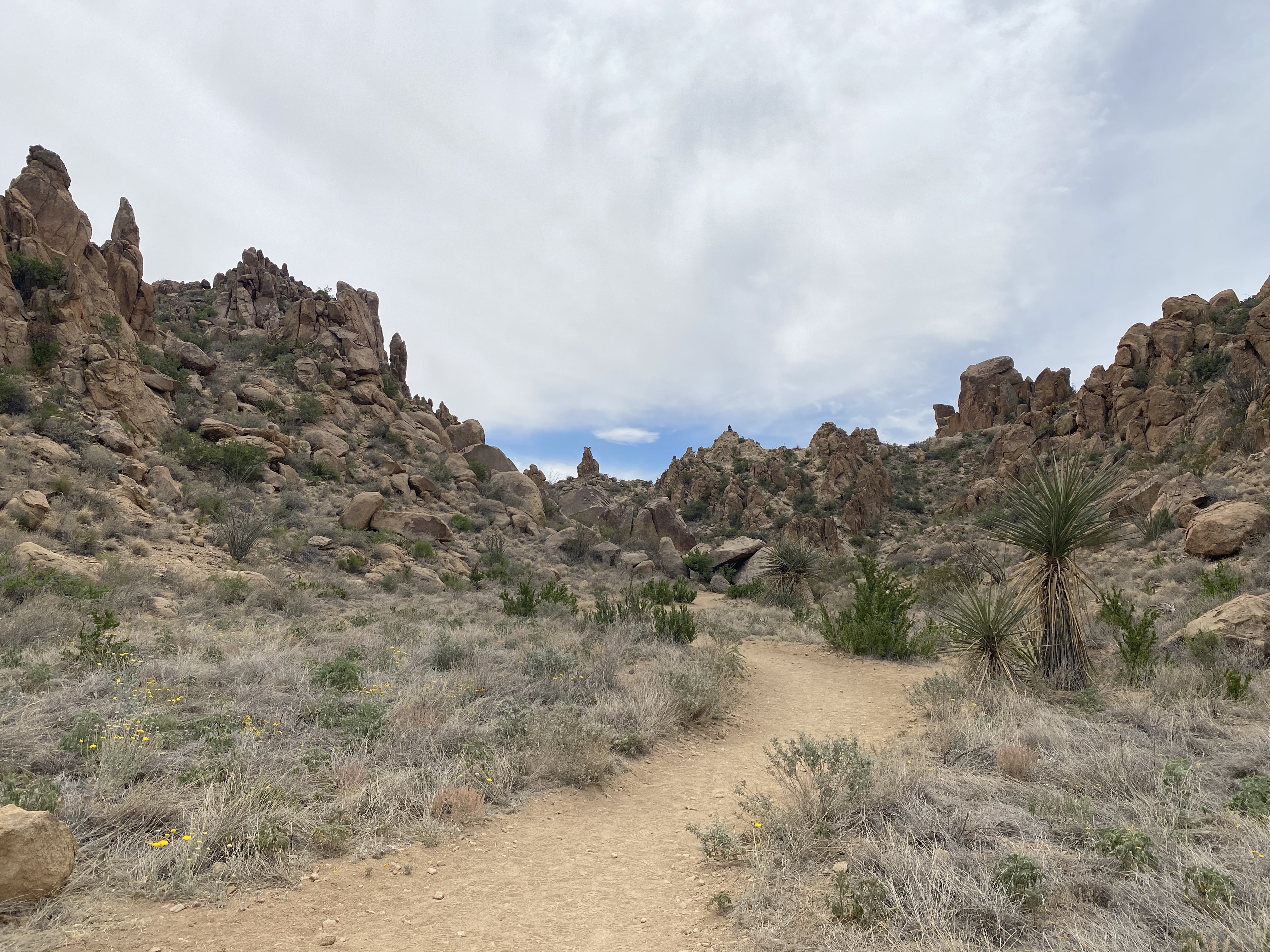 The trail carries you into a red rock forest. In all directions boulders cover the hills, mixed in with green brush here and there. Prickly pear, with their spiny needles and soft blooms, lined the path along with delicate yellow flowers.