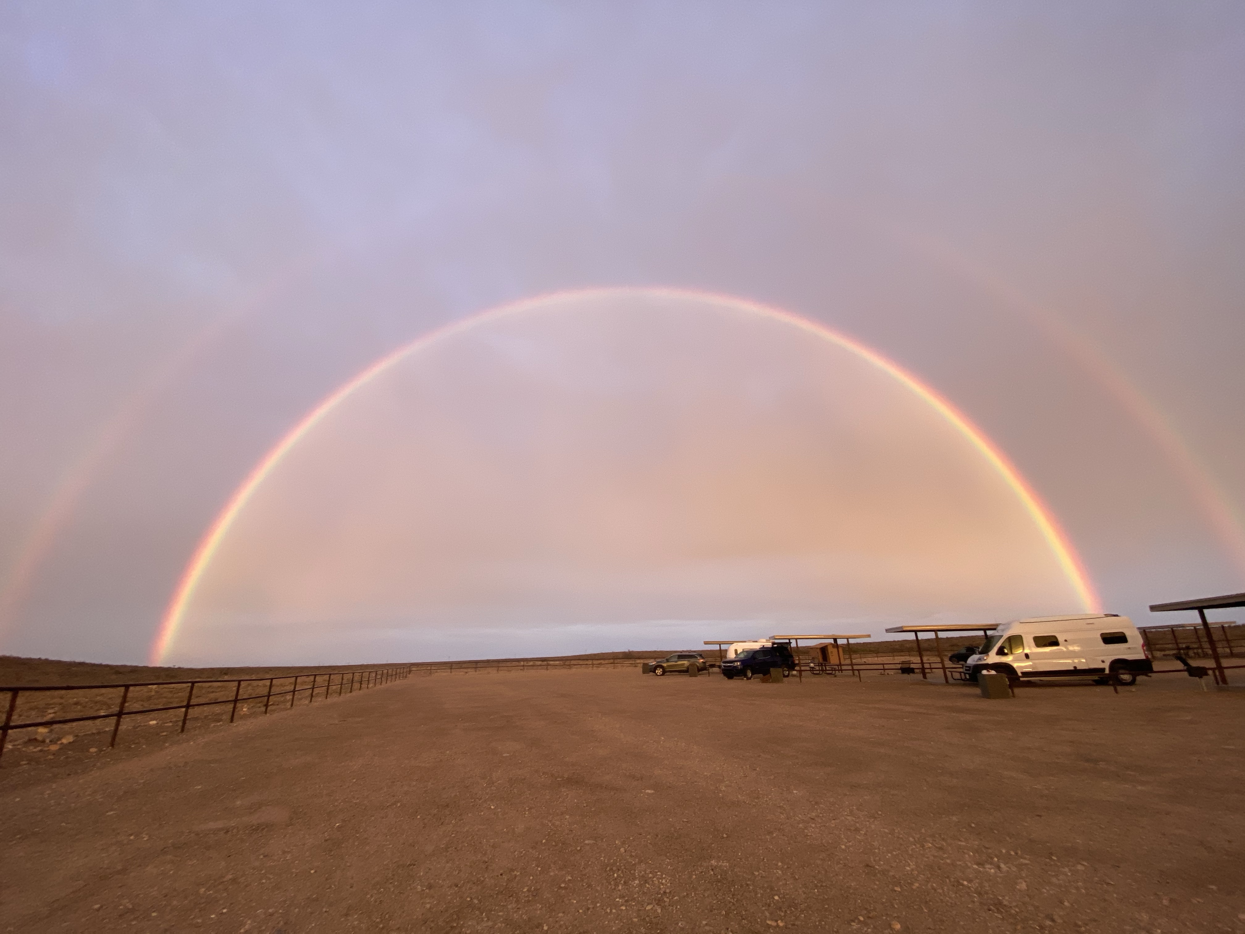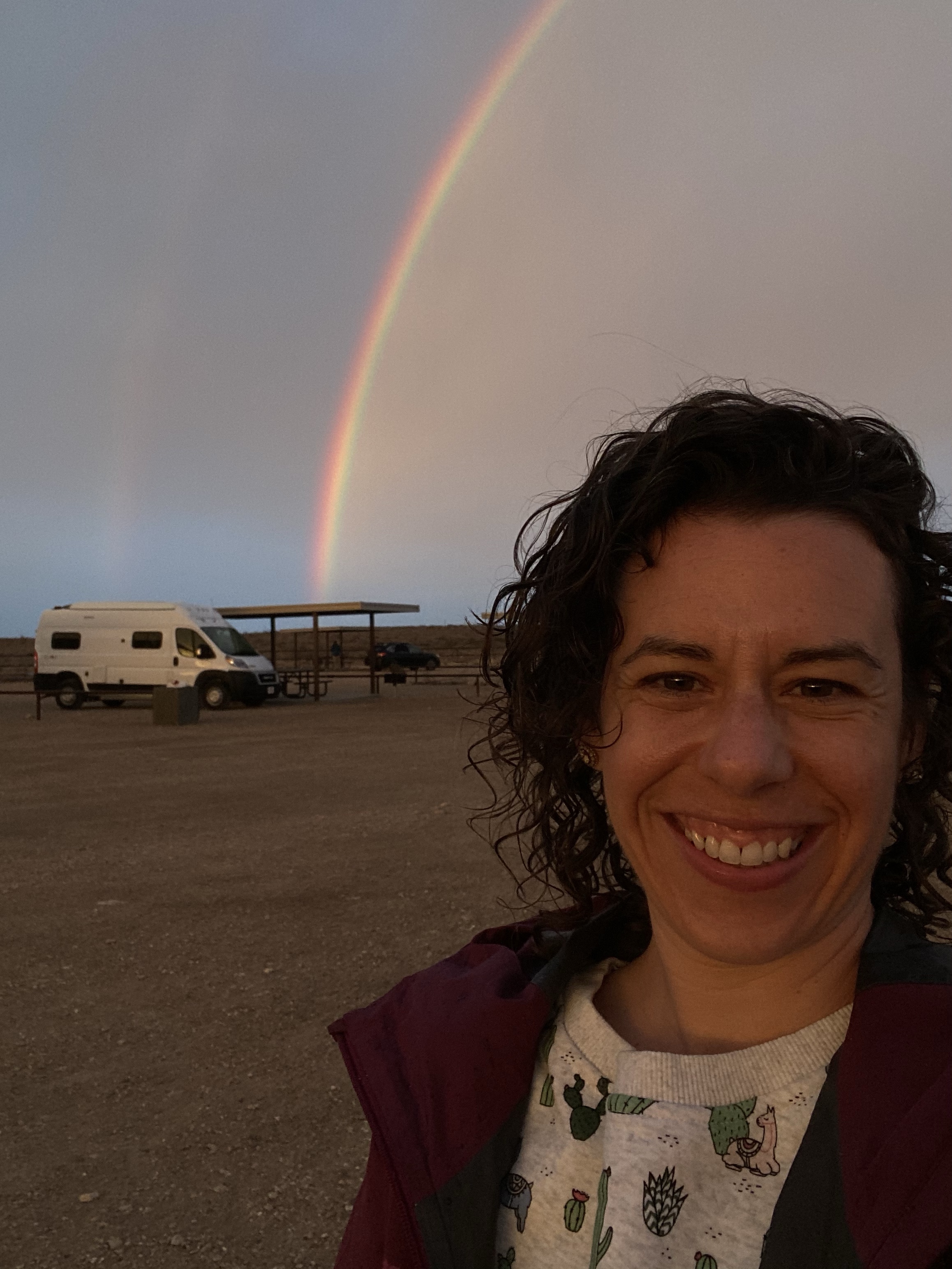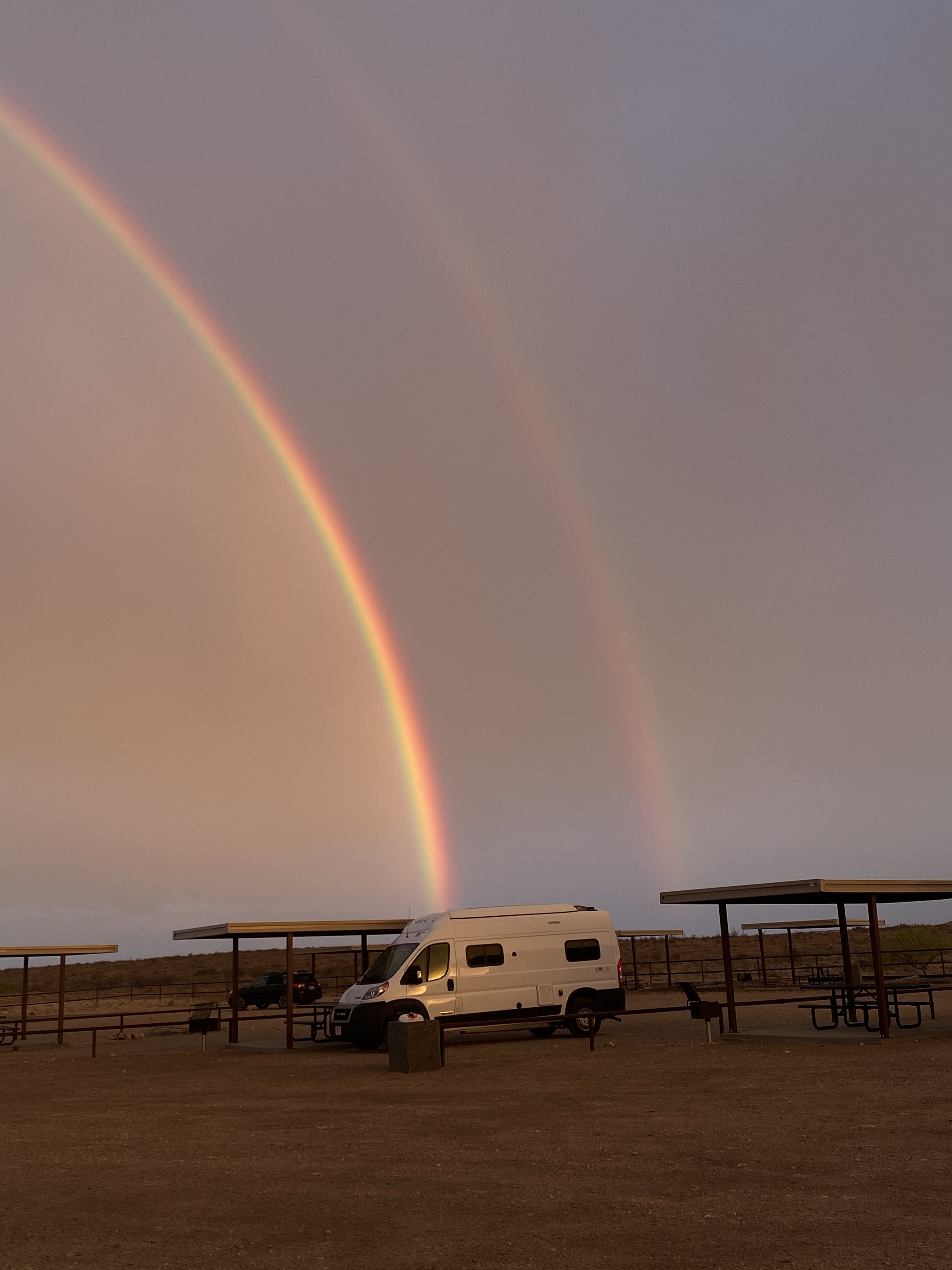 I never did use that picnic table though. It was much cooler than at Big Bend, thank goodness, and rainy. I switched into my sweatpants and sweatshirt and ate some dinner inside. I was preoccupied planning my next few days when I heard my neighbors shriek. I looked out my windshield and saw what had their attention, a full double rainbow after the rain! I grabbed my camera and ran outside before it disappeared. What a wonderful treat!