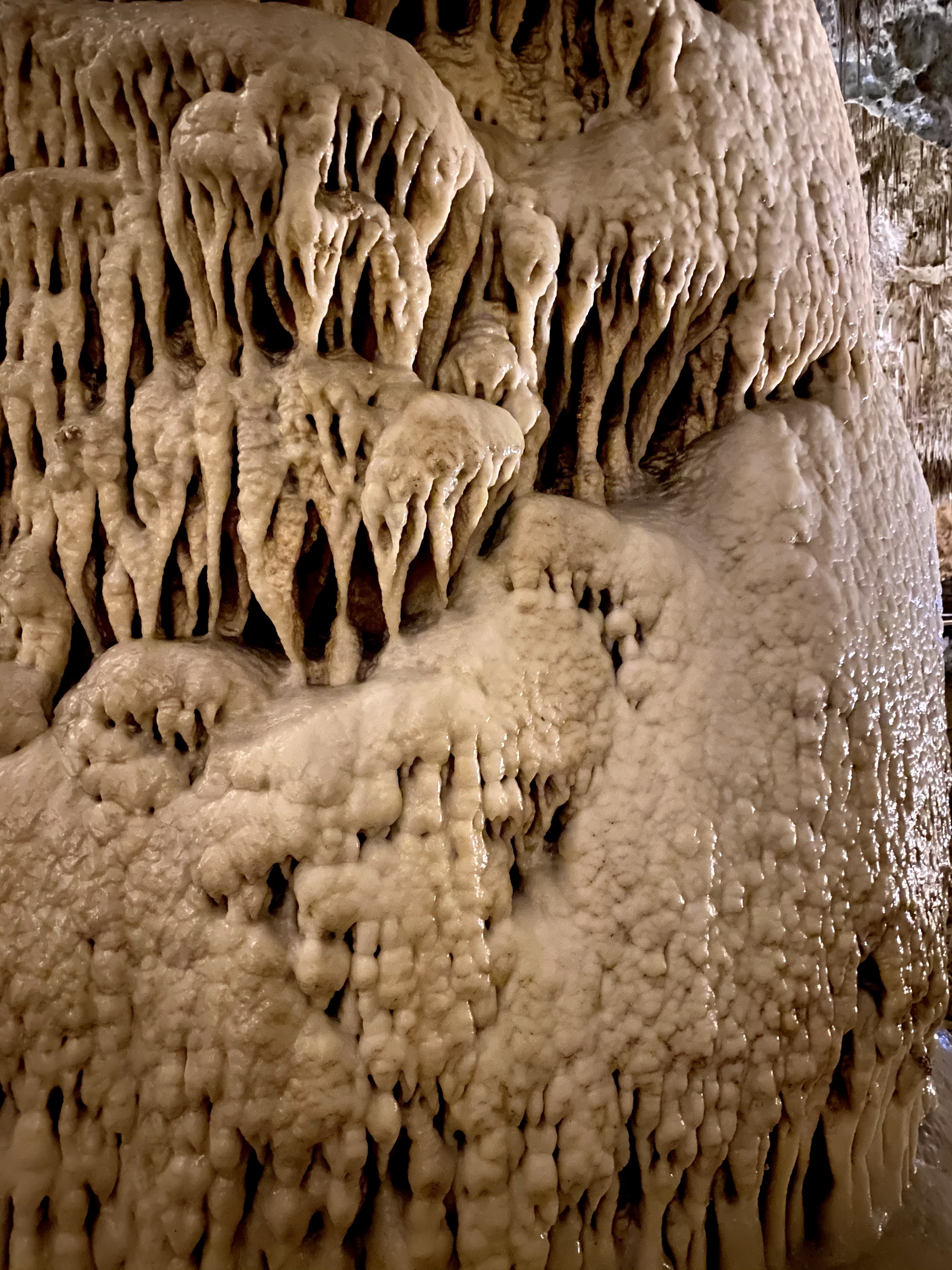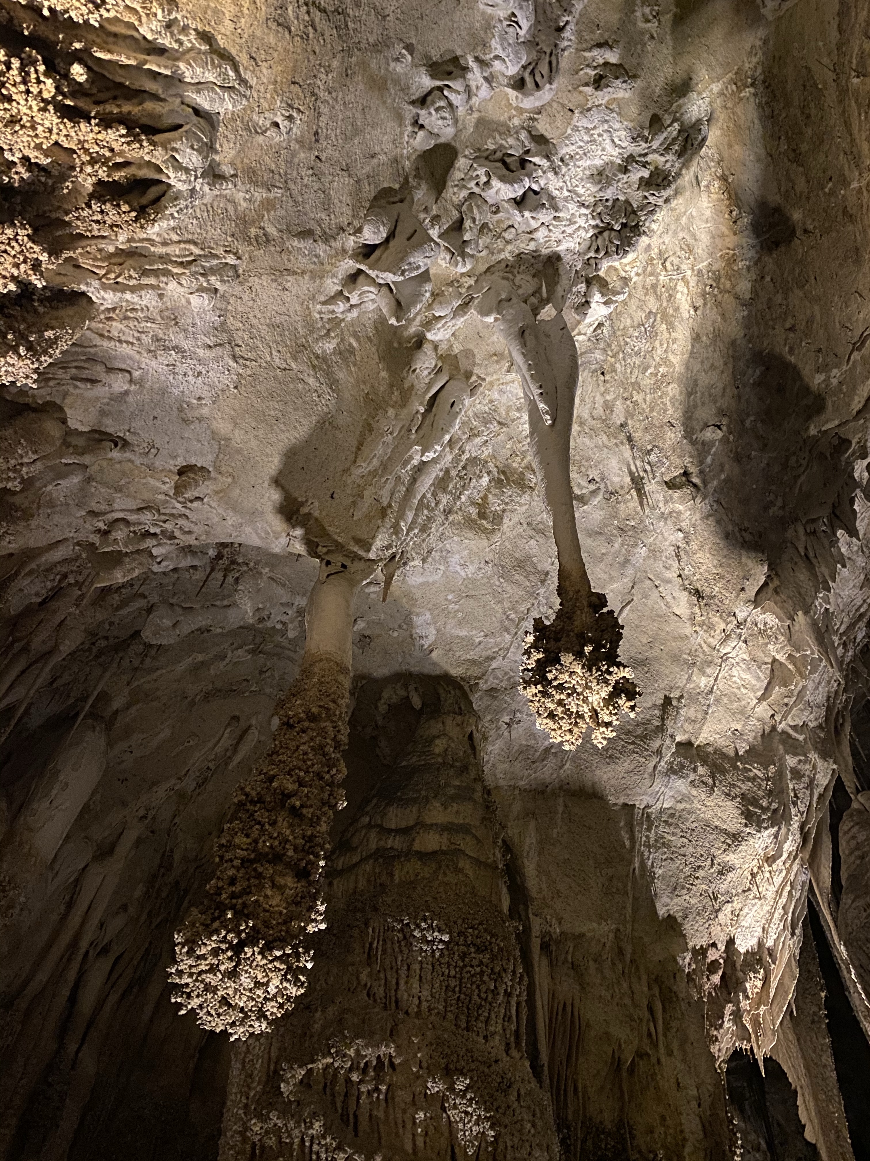 I spent hours wandering around the paths, from room to room, staring up, down and all around. All around strange masterpieces hung from the ceiling, crept along the walls, and sprouted from the floors. Skinny straws, thick columns, flowing ribbons, bumpy popcorn nodules. The cave formed millions of years ago but continues to grow each day, slowly morphing drop by drop as water trickles down from above.