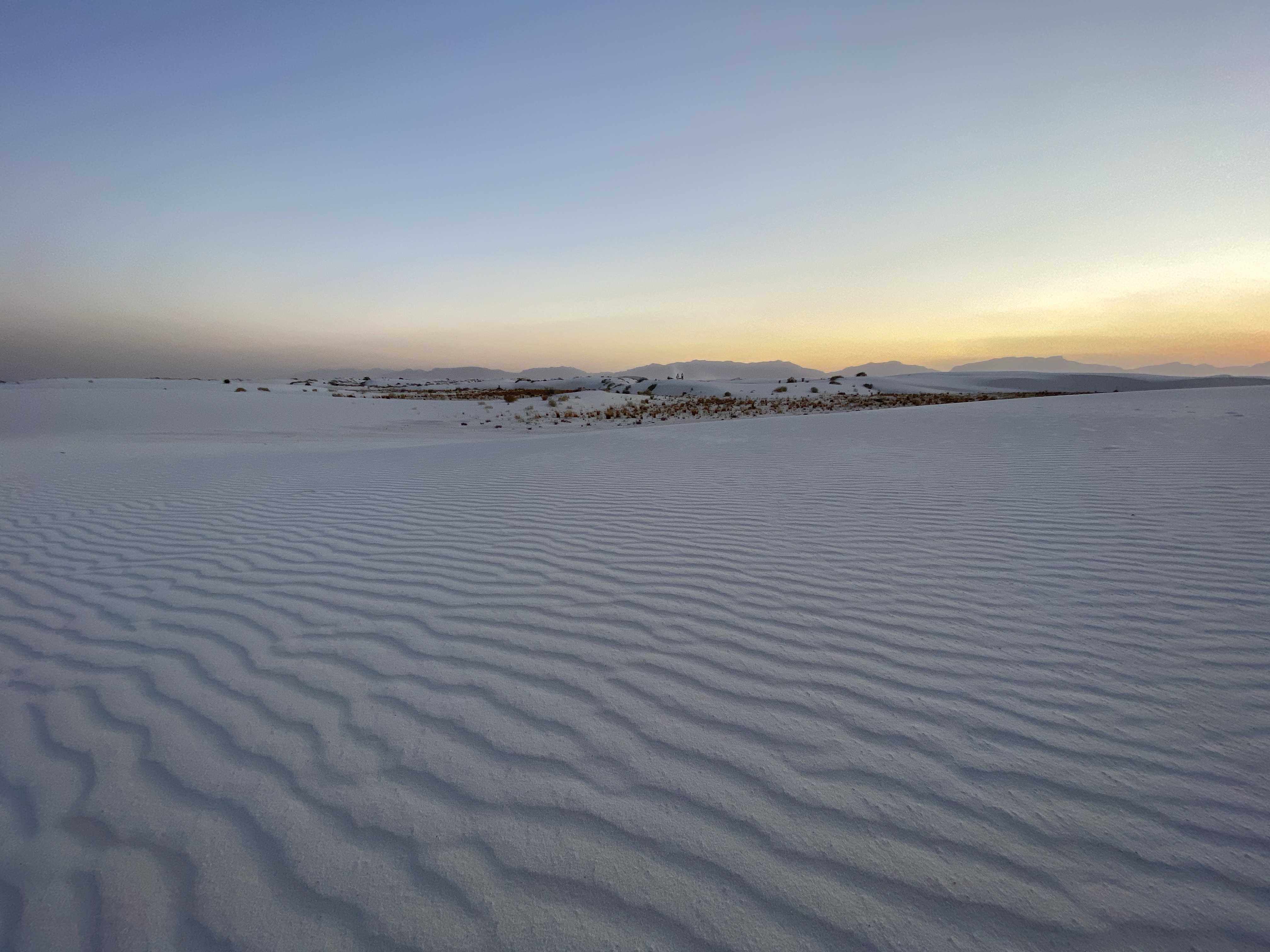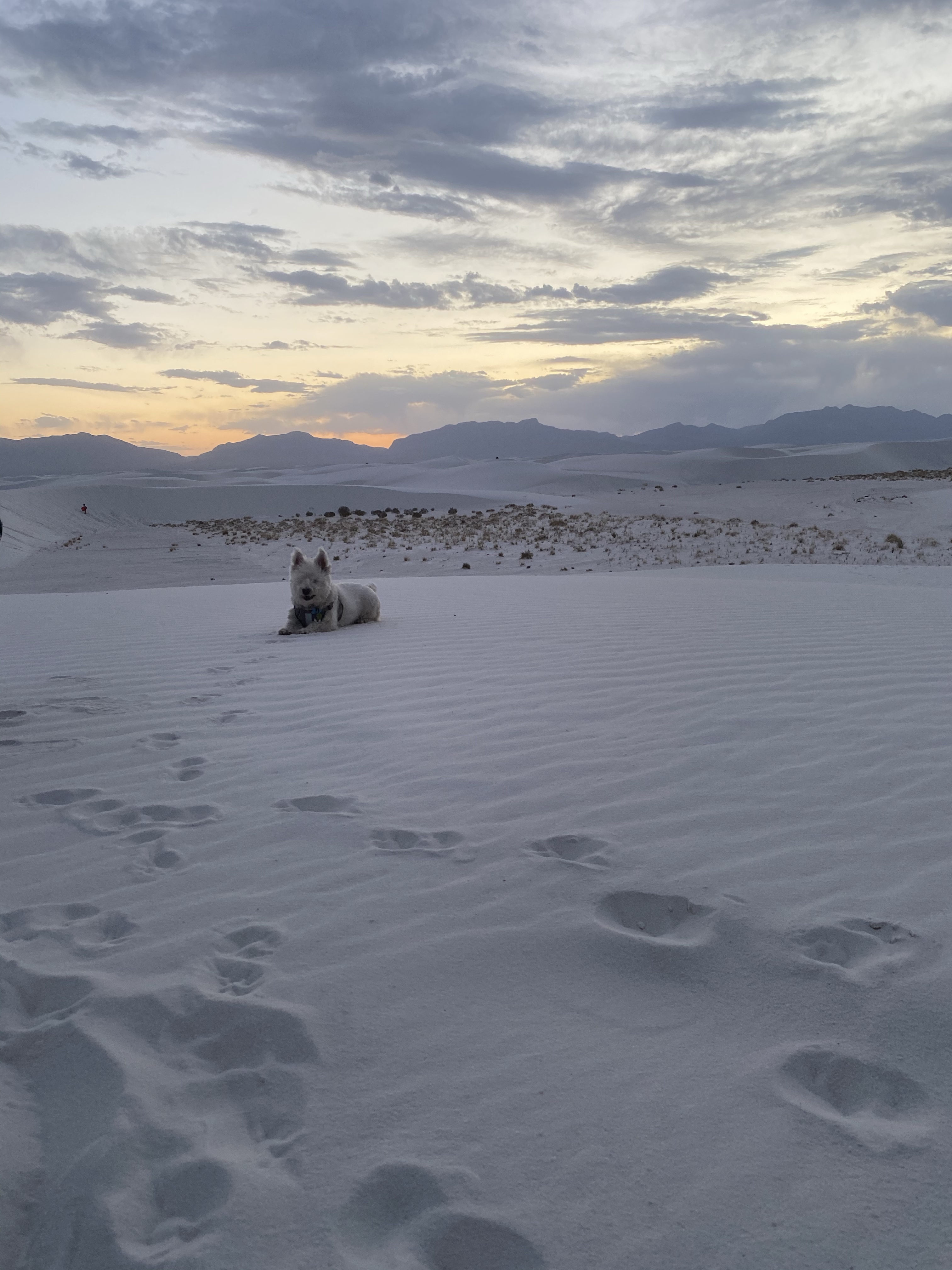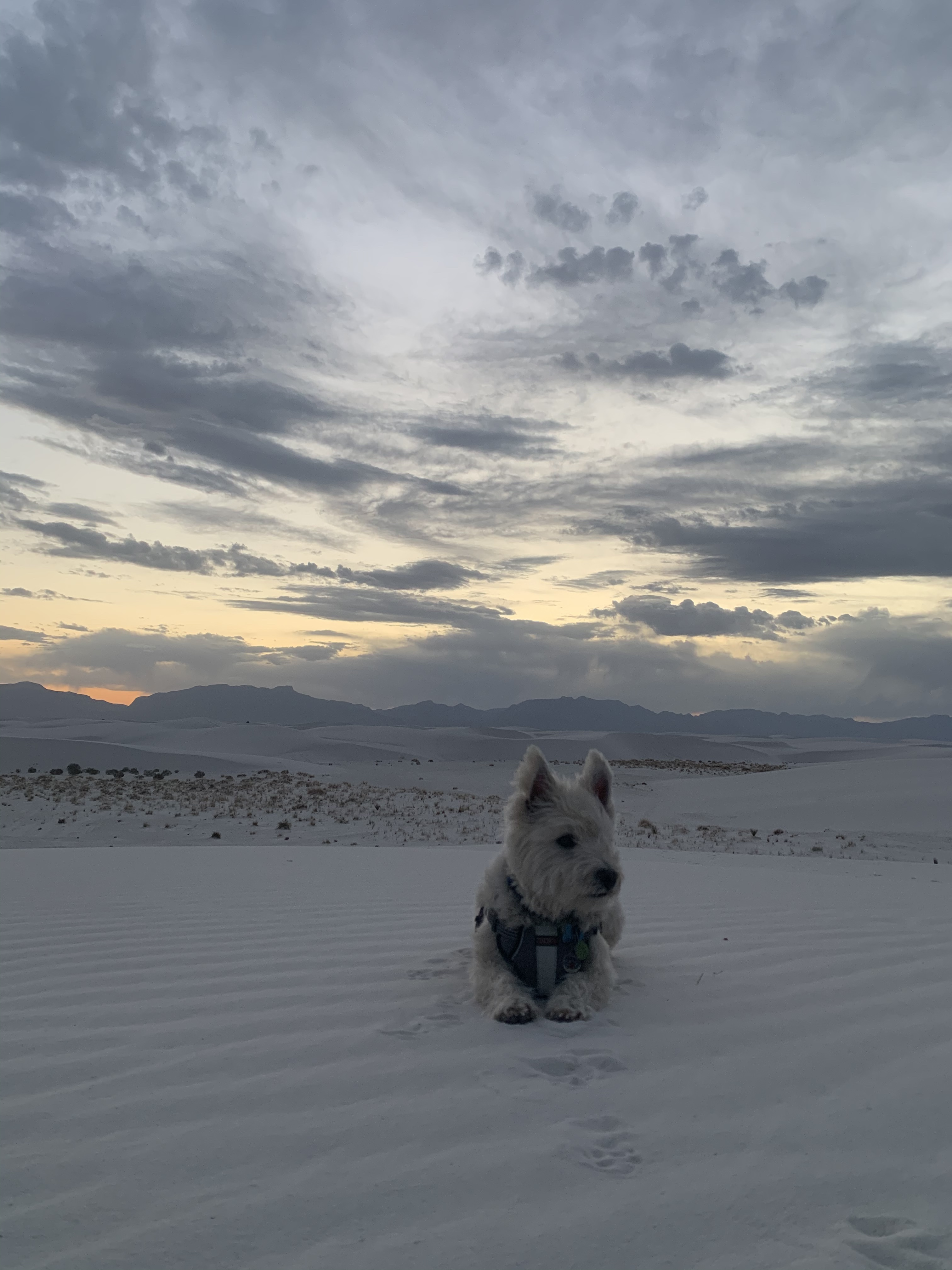 The rest of that day, with Max in tow, Crystal and I walked the trails at White Sands. The tiny crystals that disintegrate to create this beautiful space are magical. That’s the only word that fits! And someone how, in the middle of this desert, life persists. Trees grow, shrubs flower, lizards skitter about. We stayed and read and watched until the sun was high and hot. Then we departed for lunch and rest, but promised to return for one more sunset.