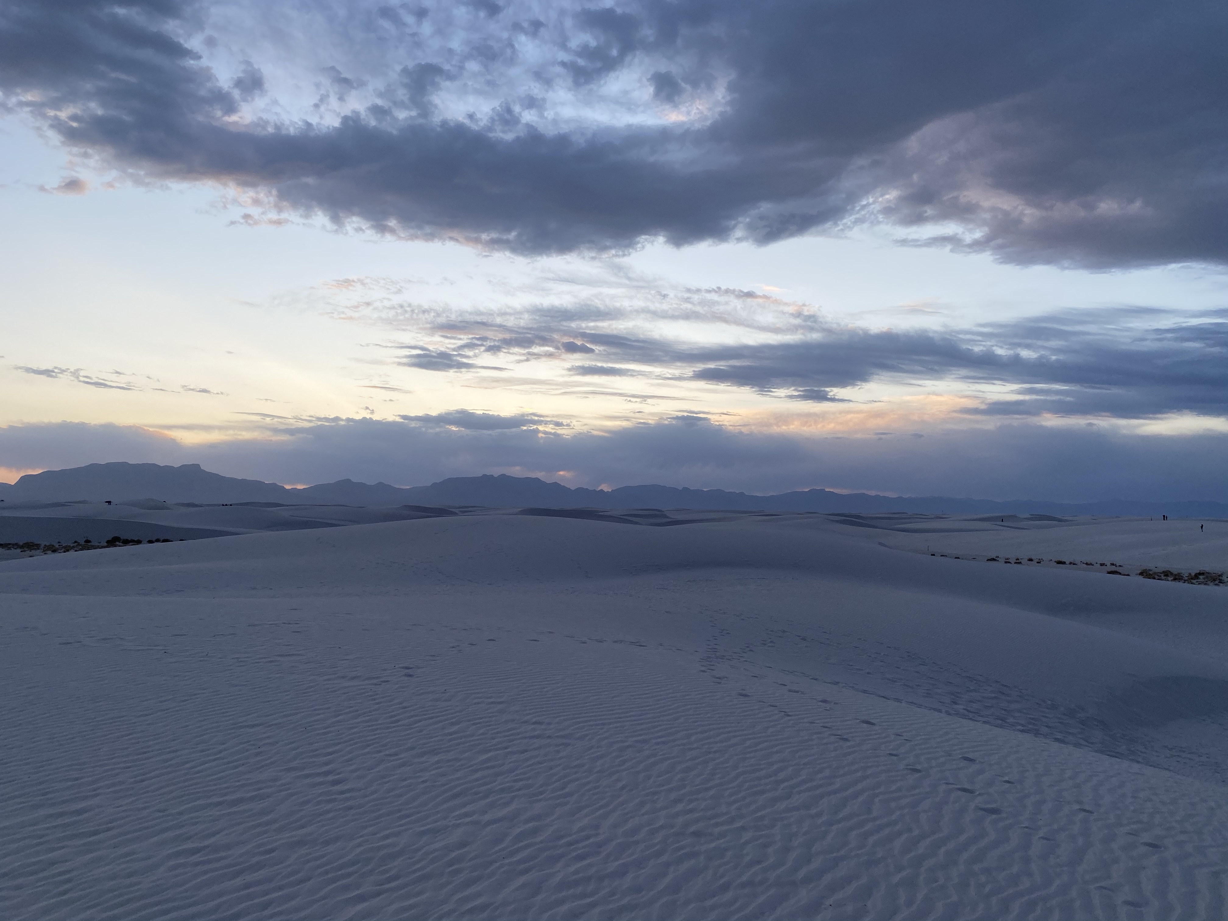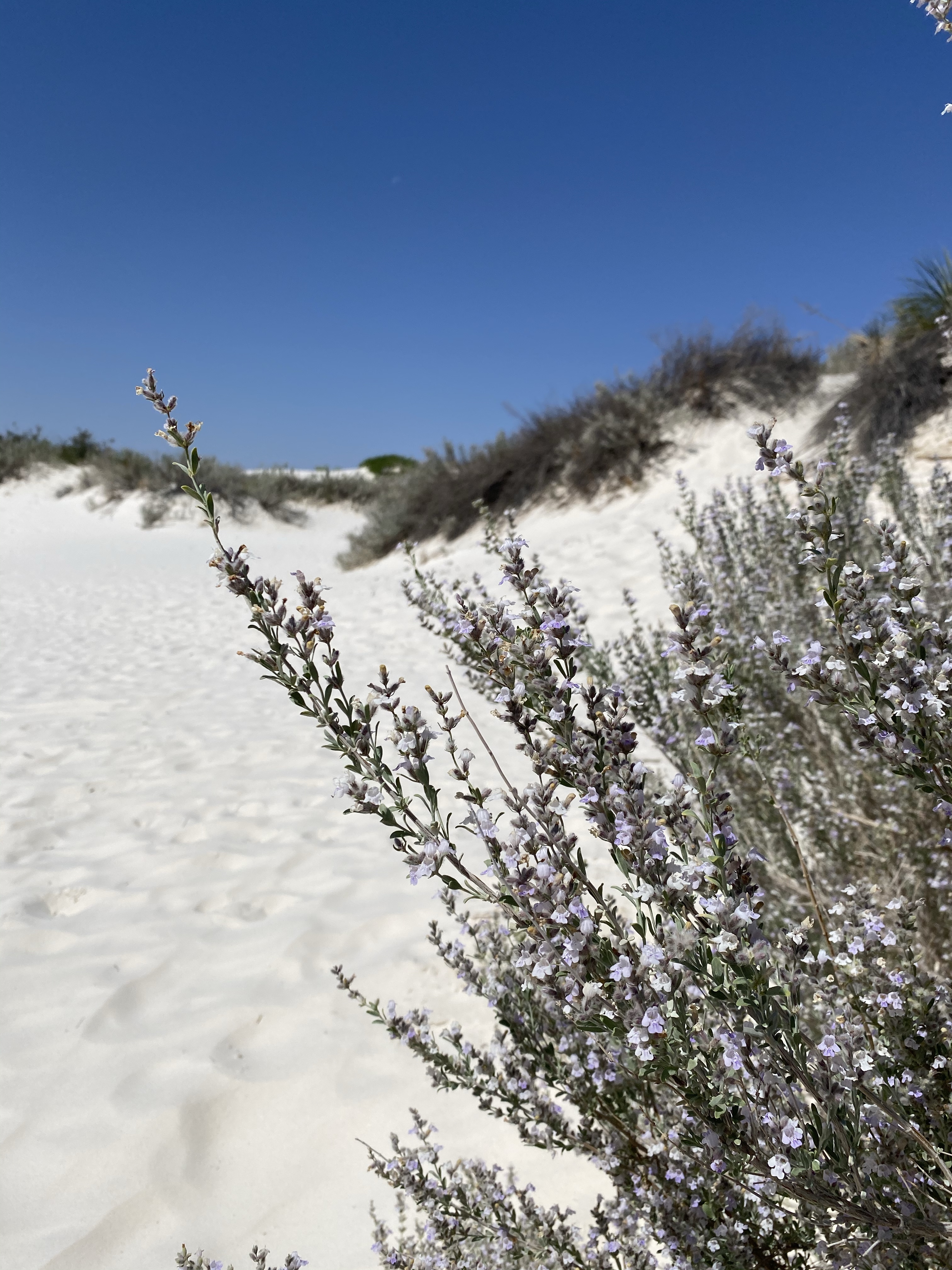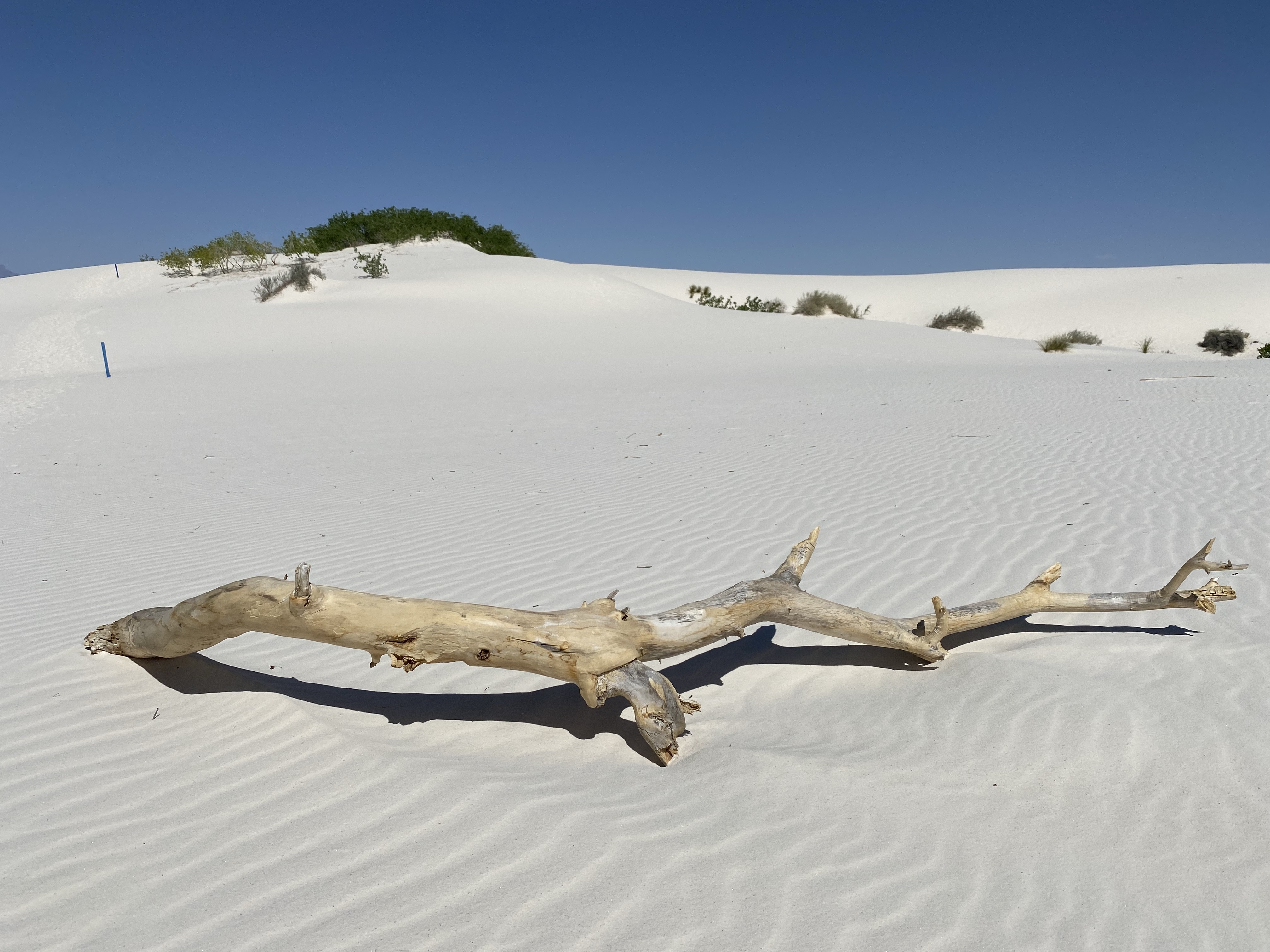 The rest of that day, with Max in tow, Crystal and I walked the trails at White Sands. The tiny crystals that disintegrate to create this beautiful space are magical. That’s the only word that fits! And someone how, in the middle of this desert, life persists. Trees grow, shrubs flower, lizards skitter about. We stayed and read and watched until the sun was high and hot. Then we departed for lunch and rest, but promised to return for one more sunset.