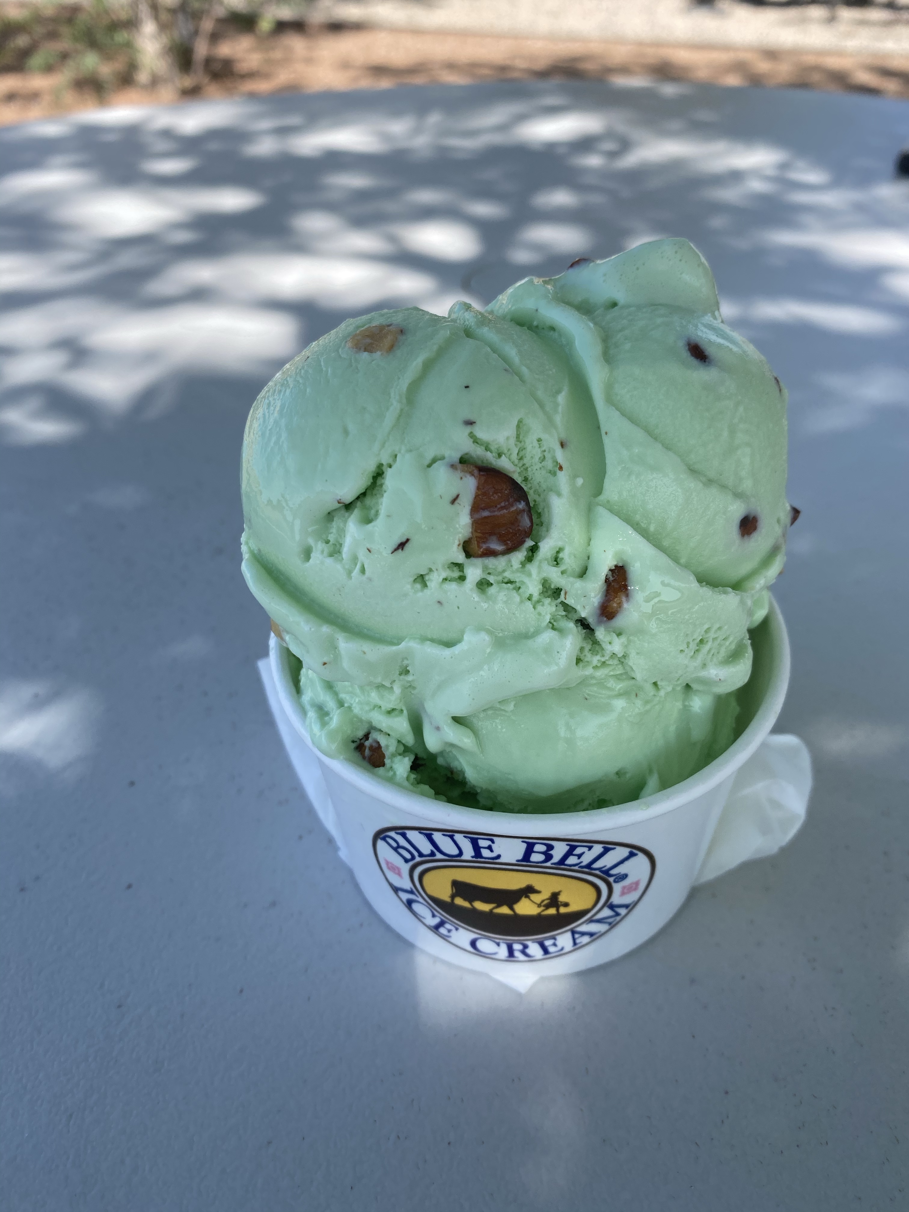 Classic photo with the pistachio, a favorite nut enhanced with ice cream!!! Glad you have met some travel buddies. Sand sledding looks fun.