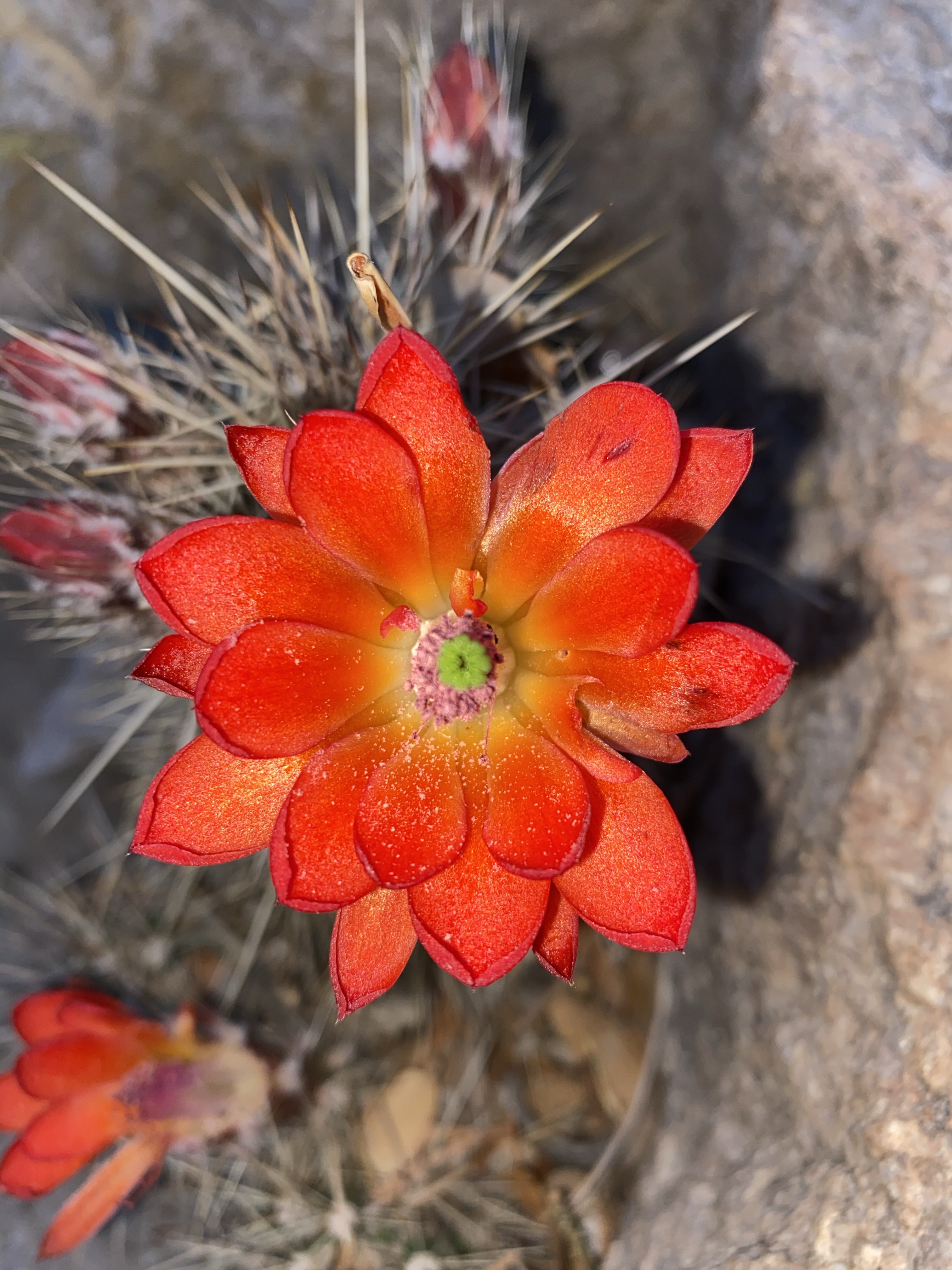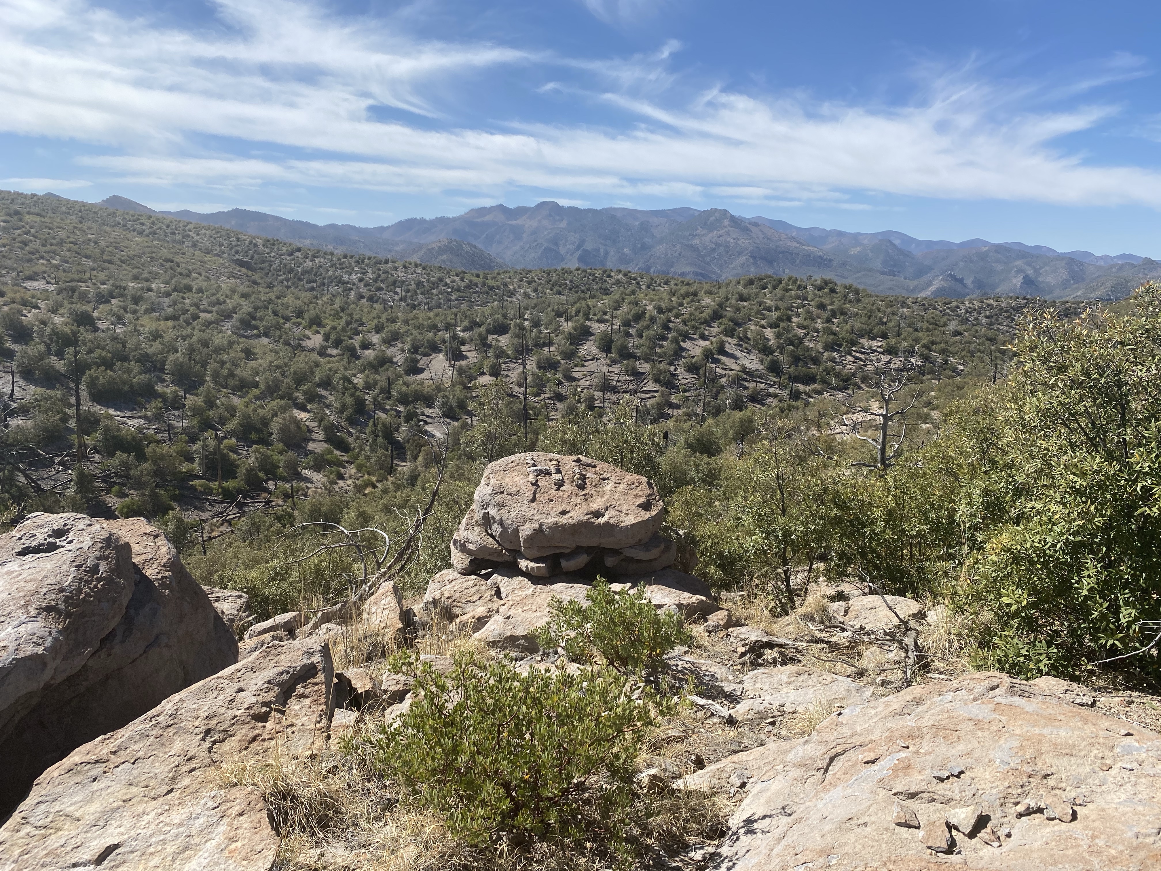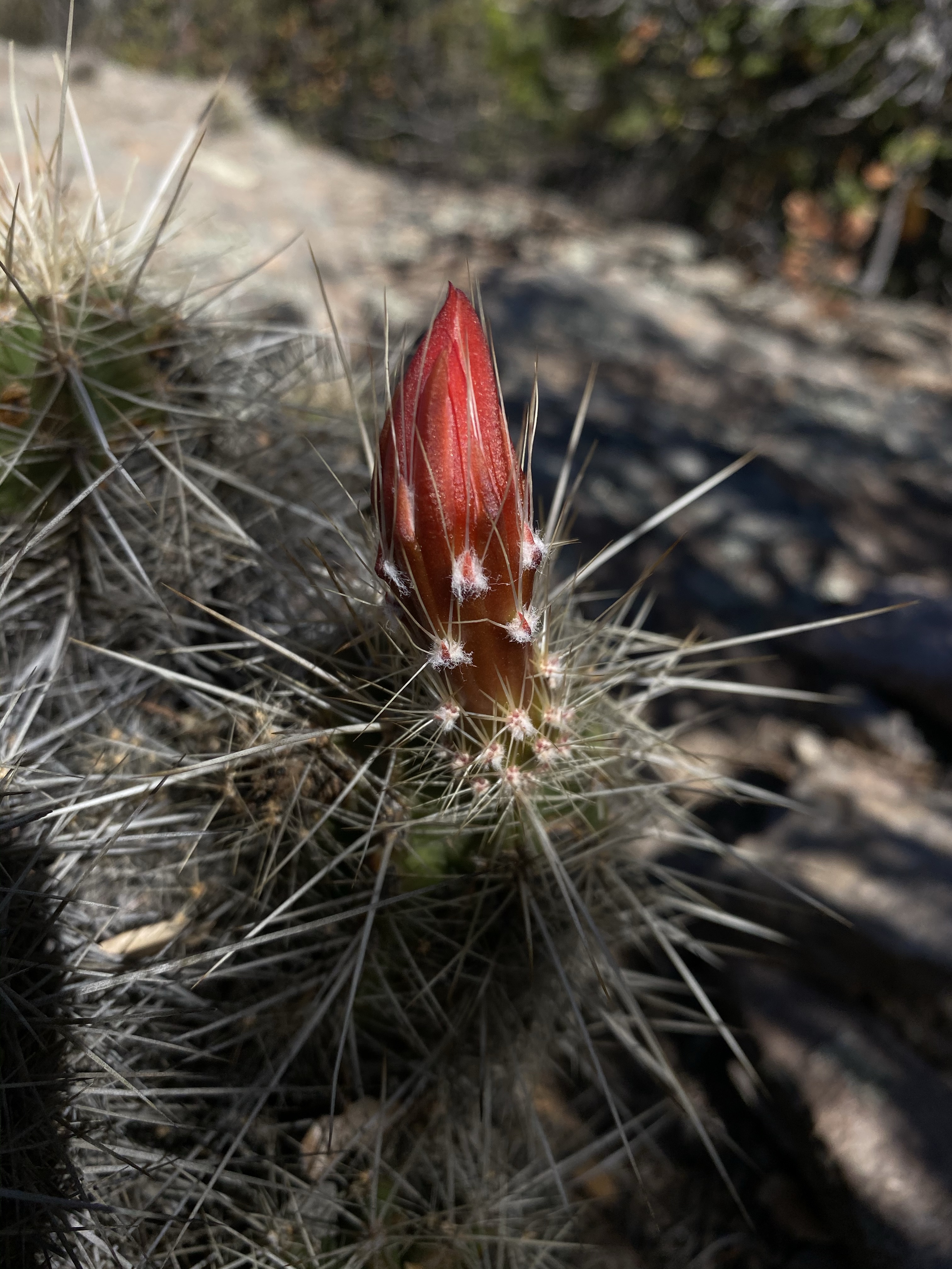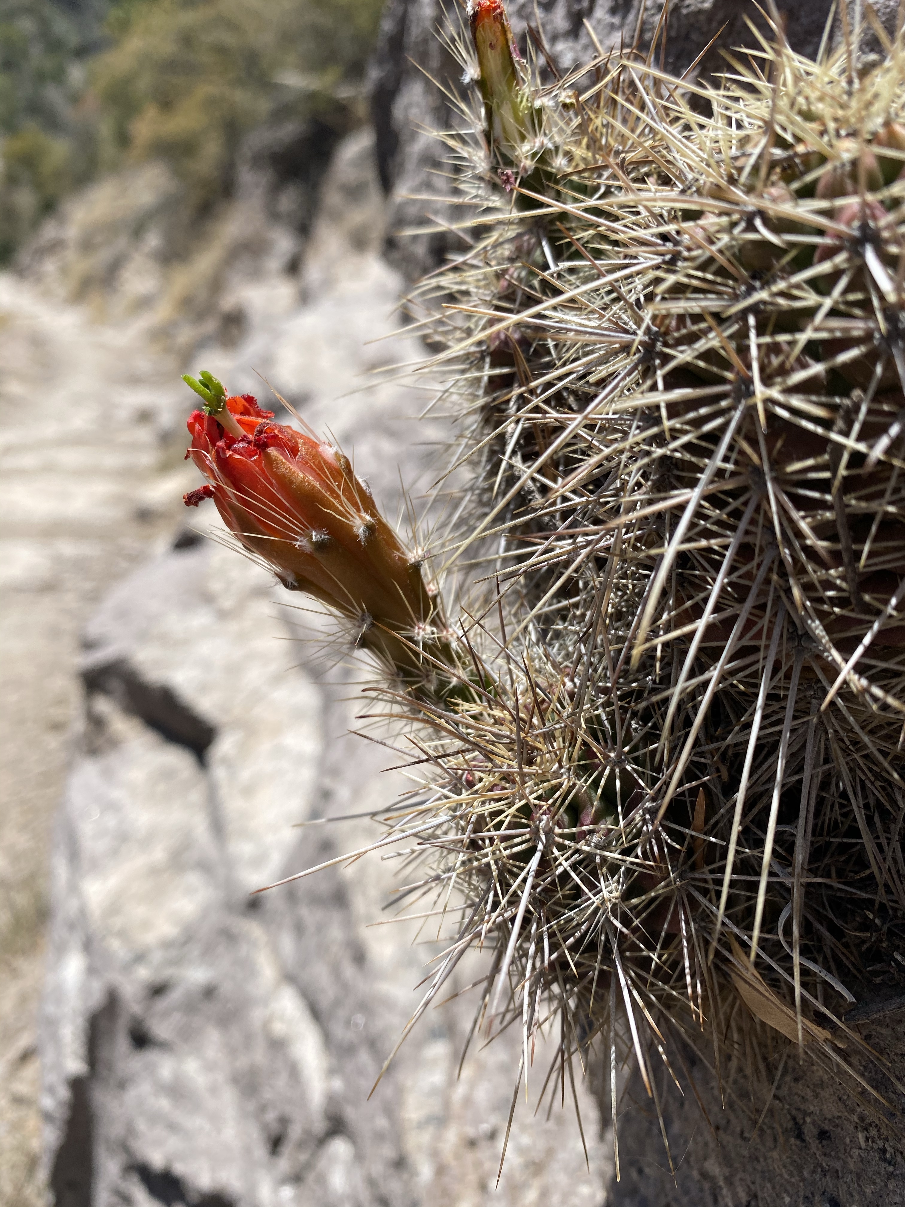 Eventually I began to climb, up into the pine forest and along the ridge. Panoramic mountains stretched before me, blue and green and brown in the distance. Vast expanses of uninterrupted nature. Fiery red blooming cacti greeted me along the path, adding dashes of color to the palette.