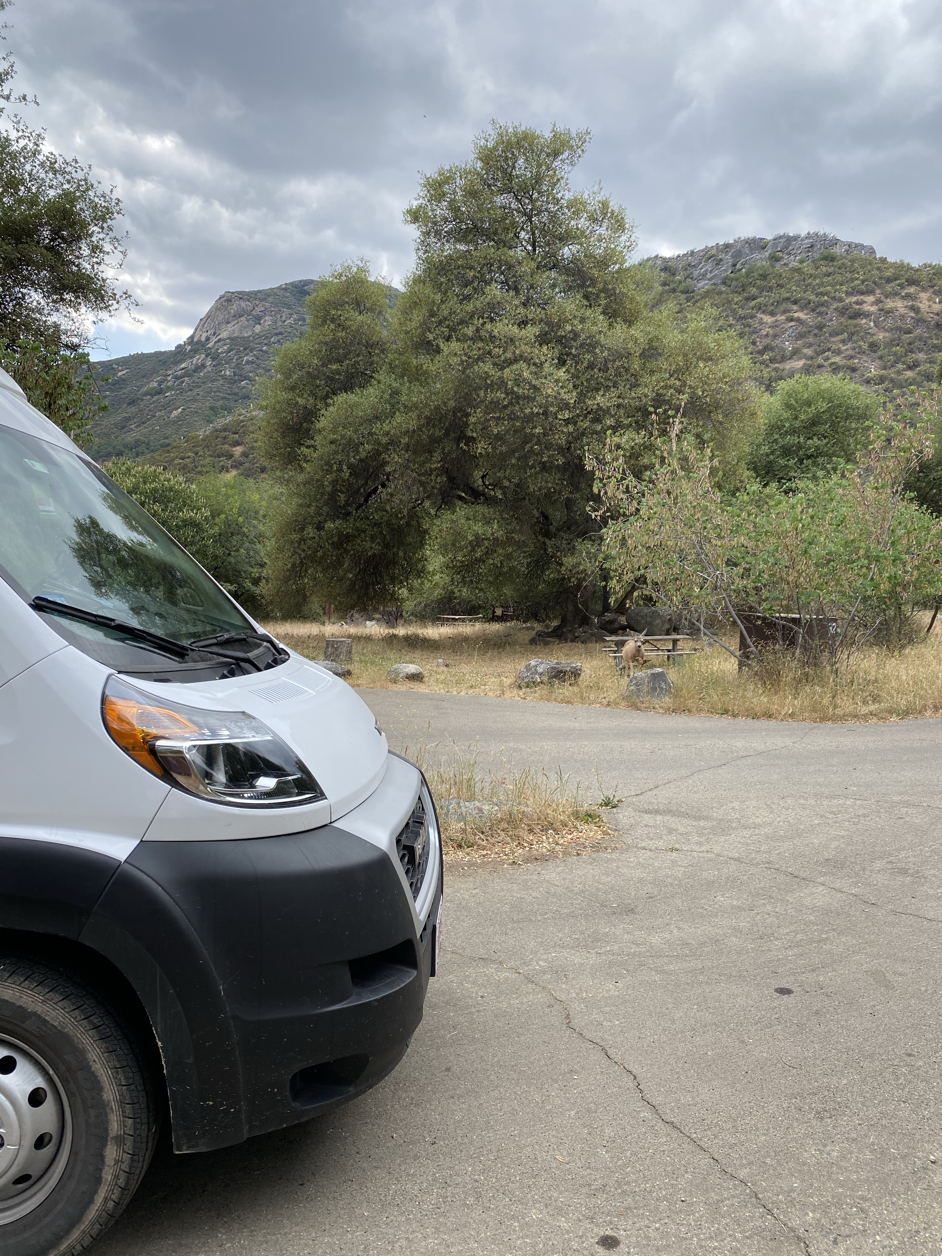 Well, gosh, was I wrong! I left my side door open, with the screen panel down and zipped like I typically do when camping, and walked away to find better cell service. When I came back ten minutes later and distractedly stepped inside, I was abruptly called to attention by skittering and scratching in the cab! A marmot, inside! In the driver’s seat, staring at me! I shrieked and quickly jumped out and pulled open the side door. The marmot hopped down and slide out, under the screen panel! It pushed it up and jumped out. The little devil! And not only that, it had left three lovey little droppings for me to clean up. That door will not stay open again until I leave Sequoia. A very unwelcome, uninvited guest!