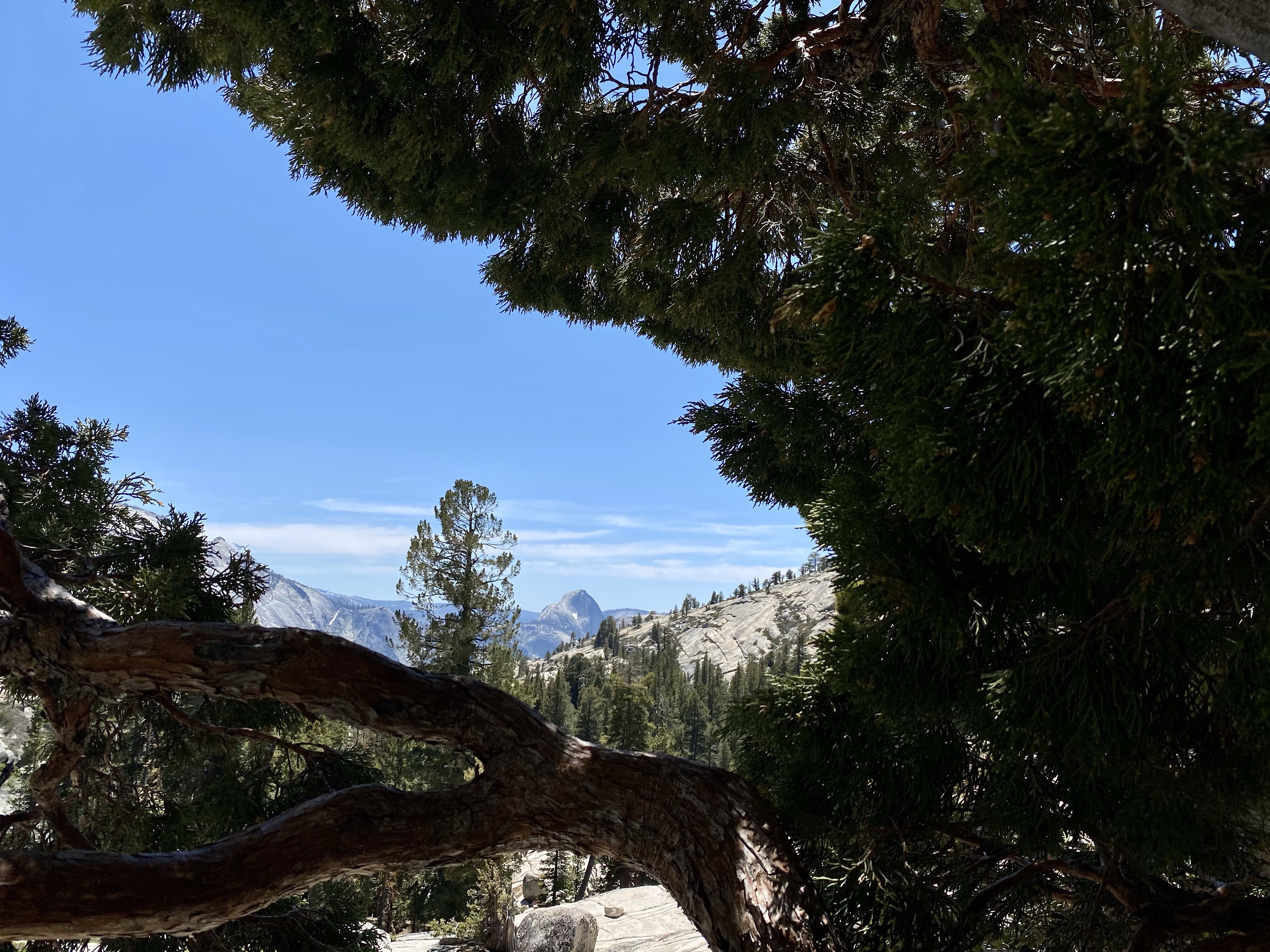 Tioga Road quickly climbs the mountainside on the far side and temperatures became much more pleasant quickly. I wound up the mountain, only a few cars around, and enjoyed the treed view. A viewpoint called my name and I stopped to take one last look at Half Dome, nestled between two cliff walls. The bright shone shined down on the granite, which glowed a steel blue.