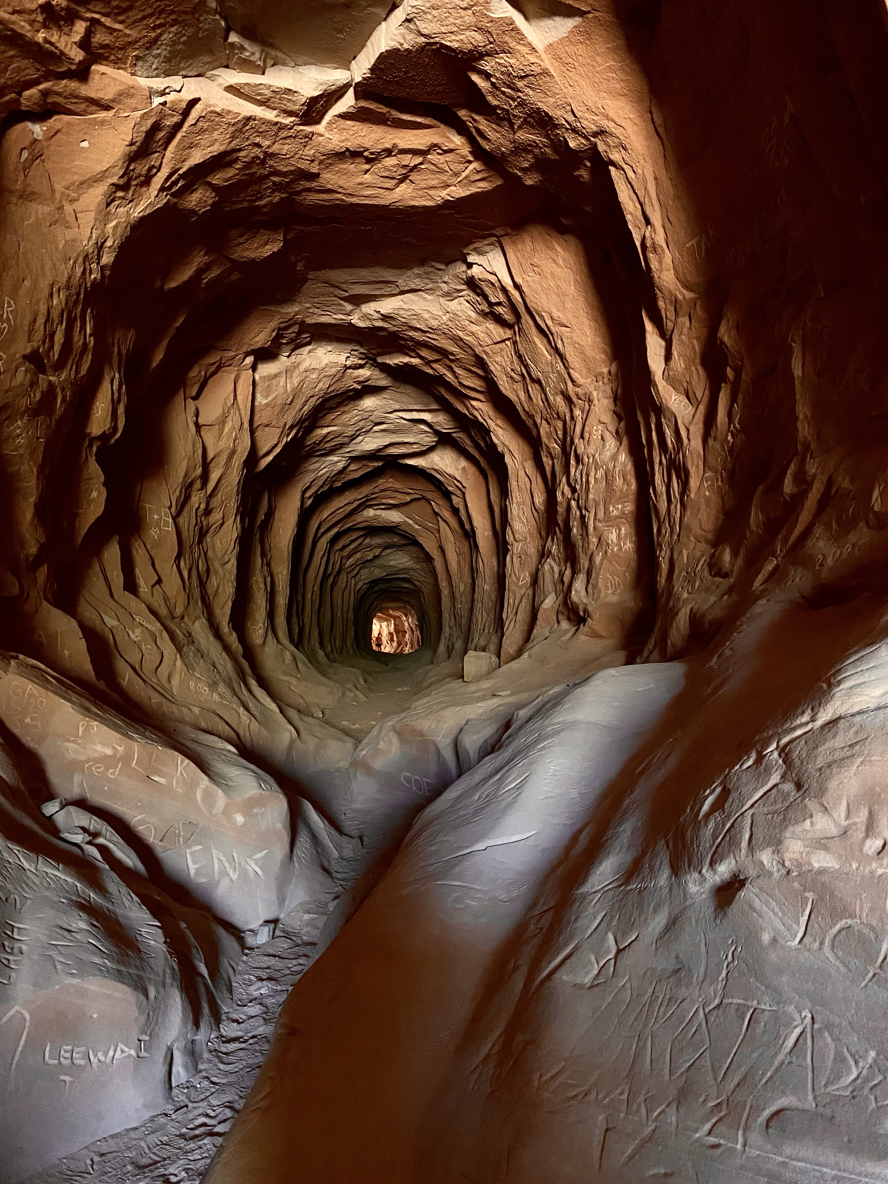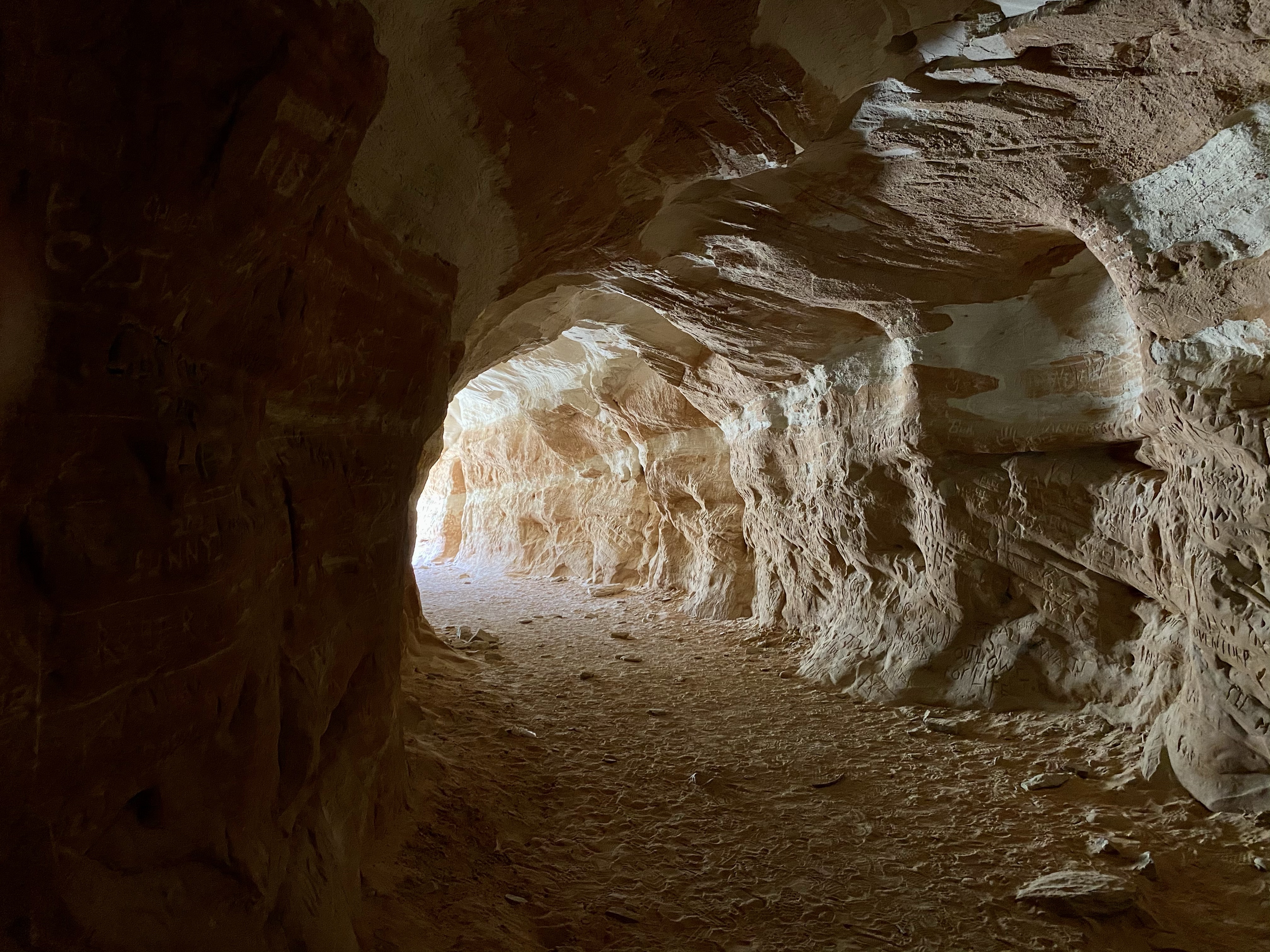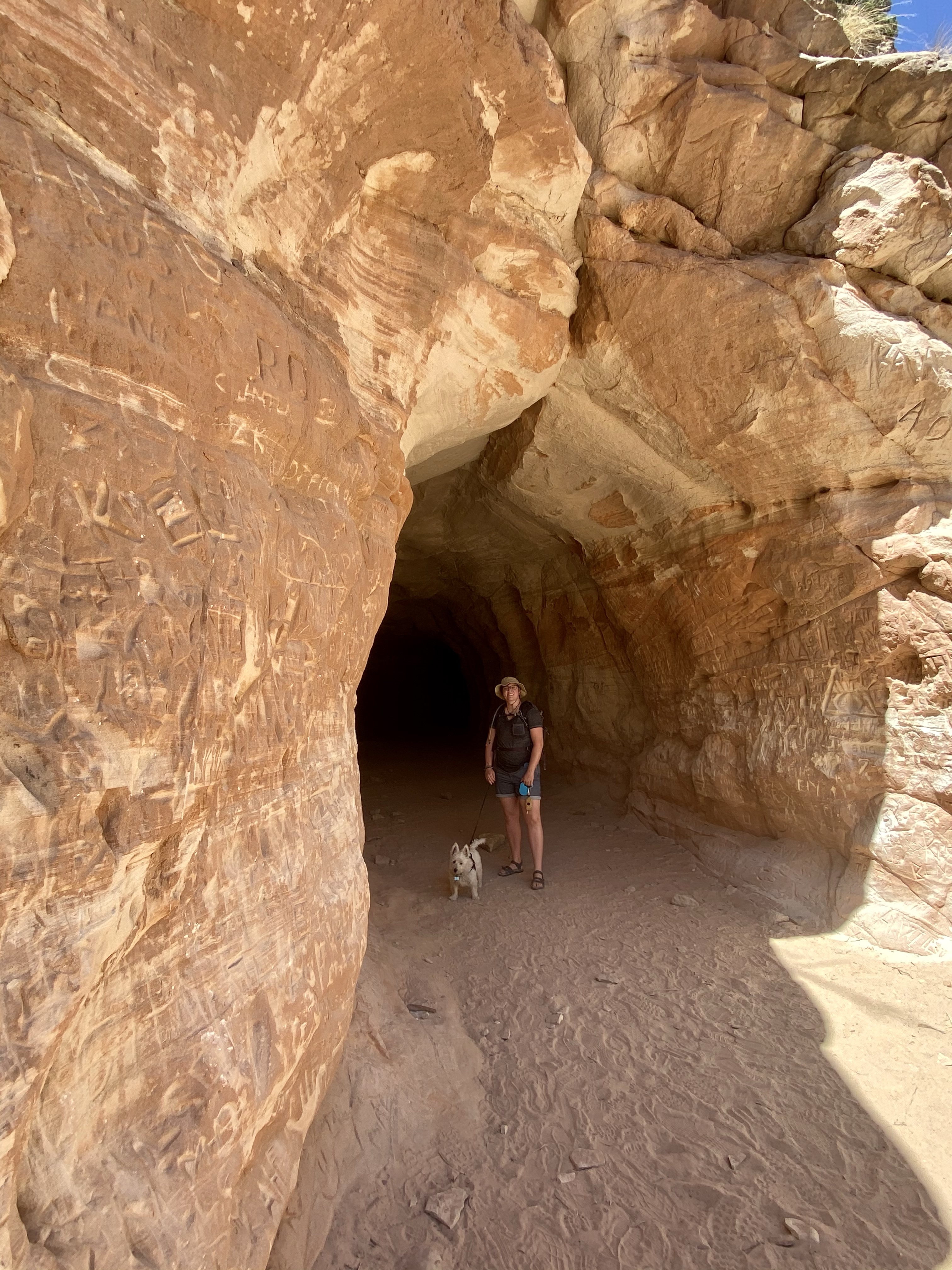 Our first stop upon arrival was Belly of the Dragon. A man made cave dug into the sandstone, Belly of the Dragon creeps under the highway and exits in the blazing sun on the far side. You climb down a steep embankment to enter, and the slowly meander through as the path is narrow and winding with shelves to climb up on both sides. People have carved their names and symbols into the soft walls, leaving their mark. While not a historic site, it still bothered me and I chose not to partake. But as you meander deeper, the light fades and a flashlight is handy, until you escape into the bright light and sand of the wash on the far side.