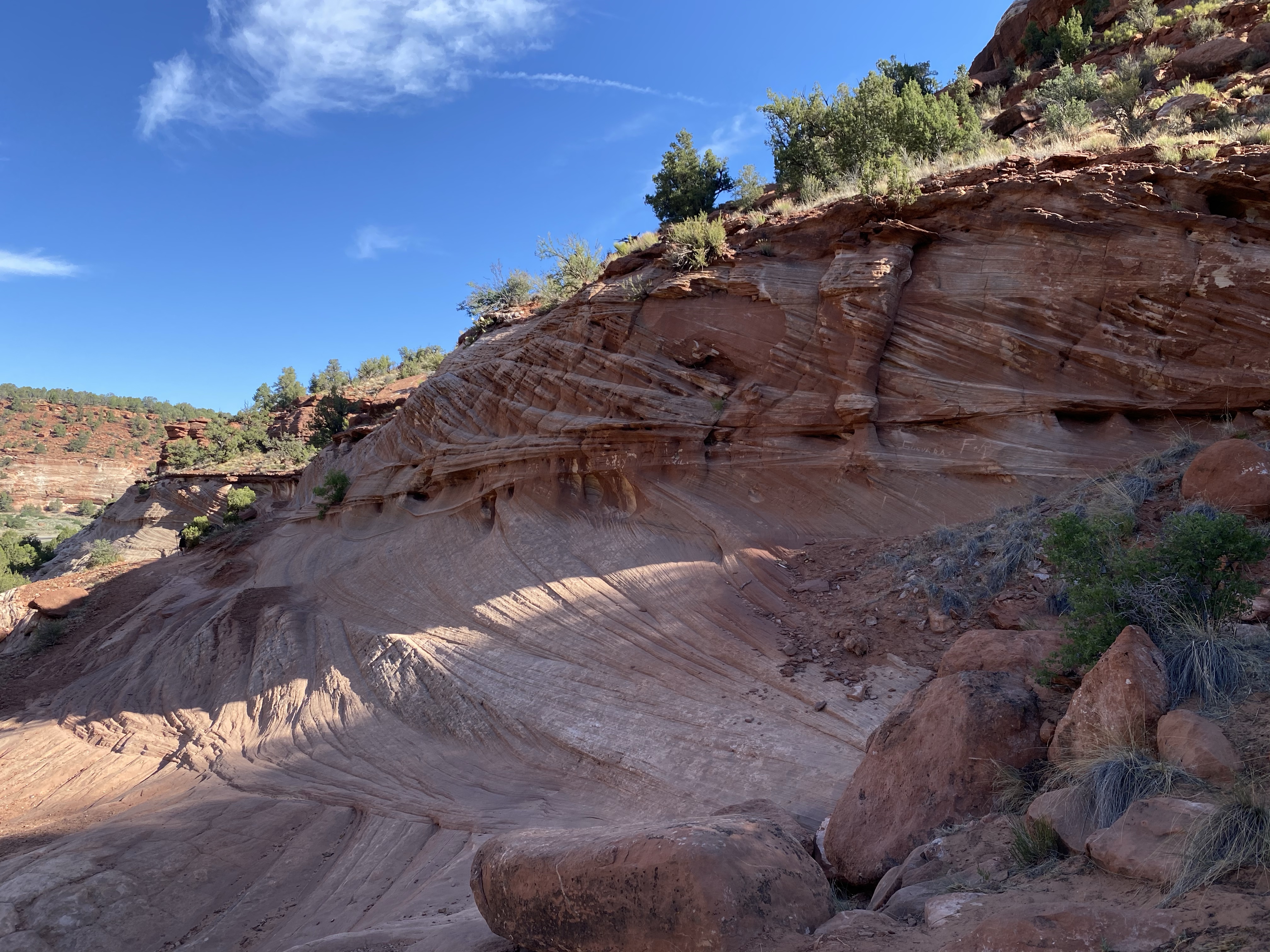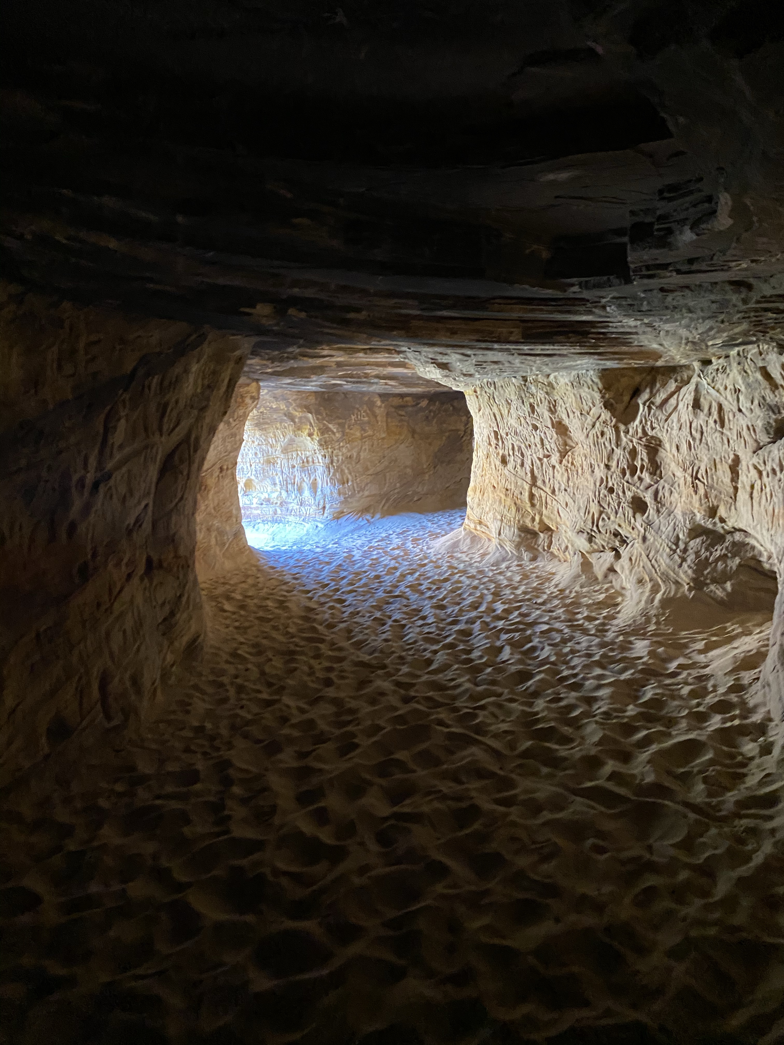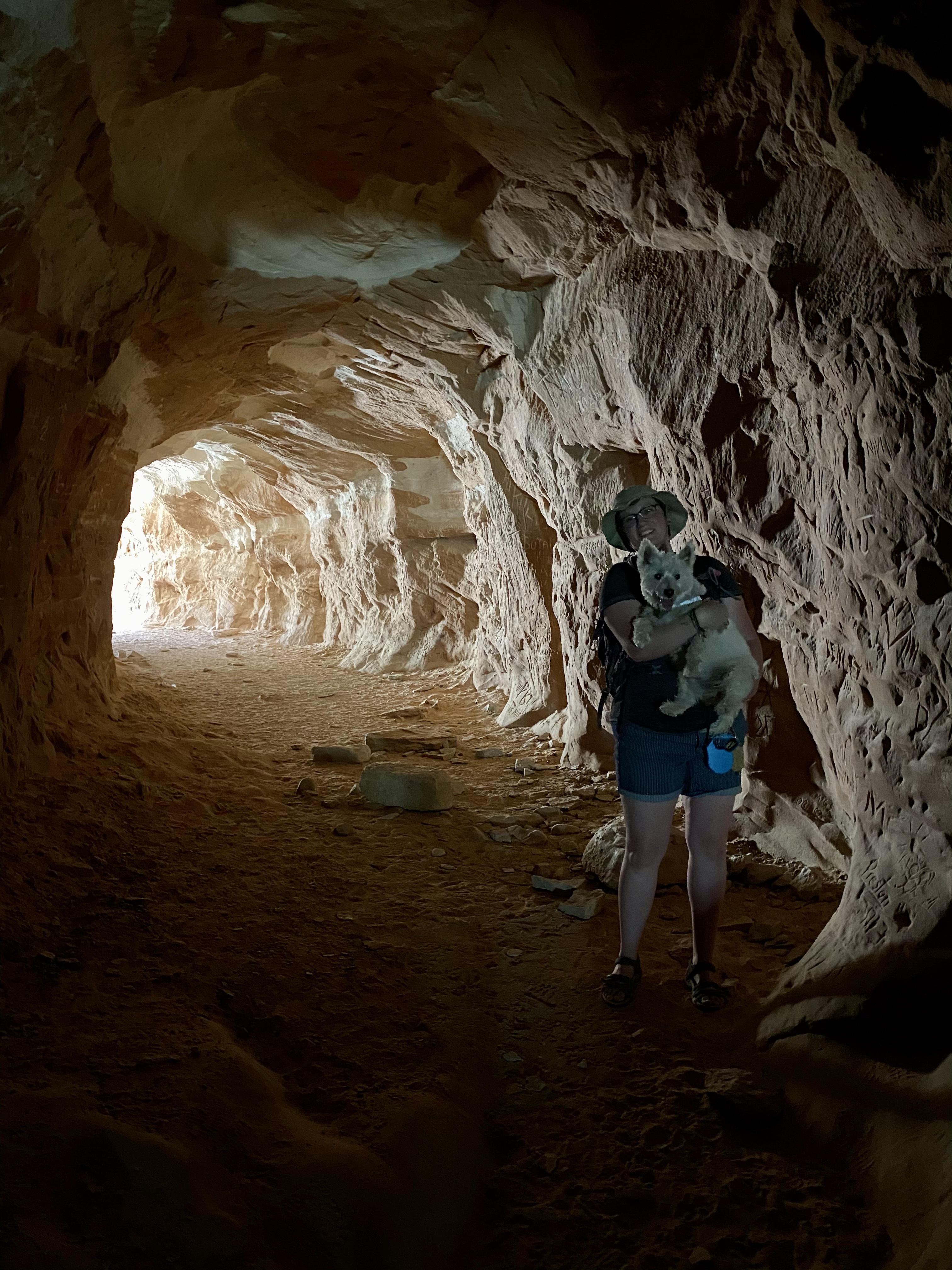 Our first stop upon arrival was Belly of the Dragon. A man made cave dug into the sandstone, Belly of the Dragon creeps under the highway and exits in the blazing sun on the far side. You climb down a steep embankment to enter, and the slowly meander through as the path is narrow and winding with shelves to climb up on both sides. People have carved their names and symbols into the soft walls, leaving their mark. While not a historic site, it still bothered me and I chose not to partake. But as you meander deeper, the light fades and a flashlight is handy, until you escape into the bright light and sand of the wash on the far side.