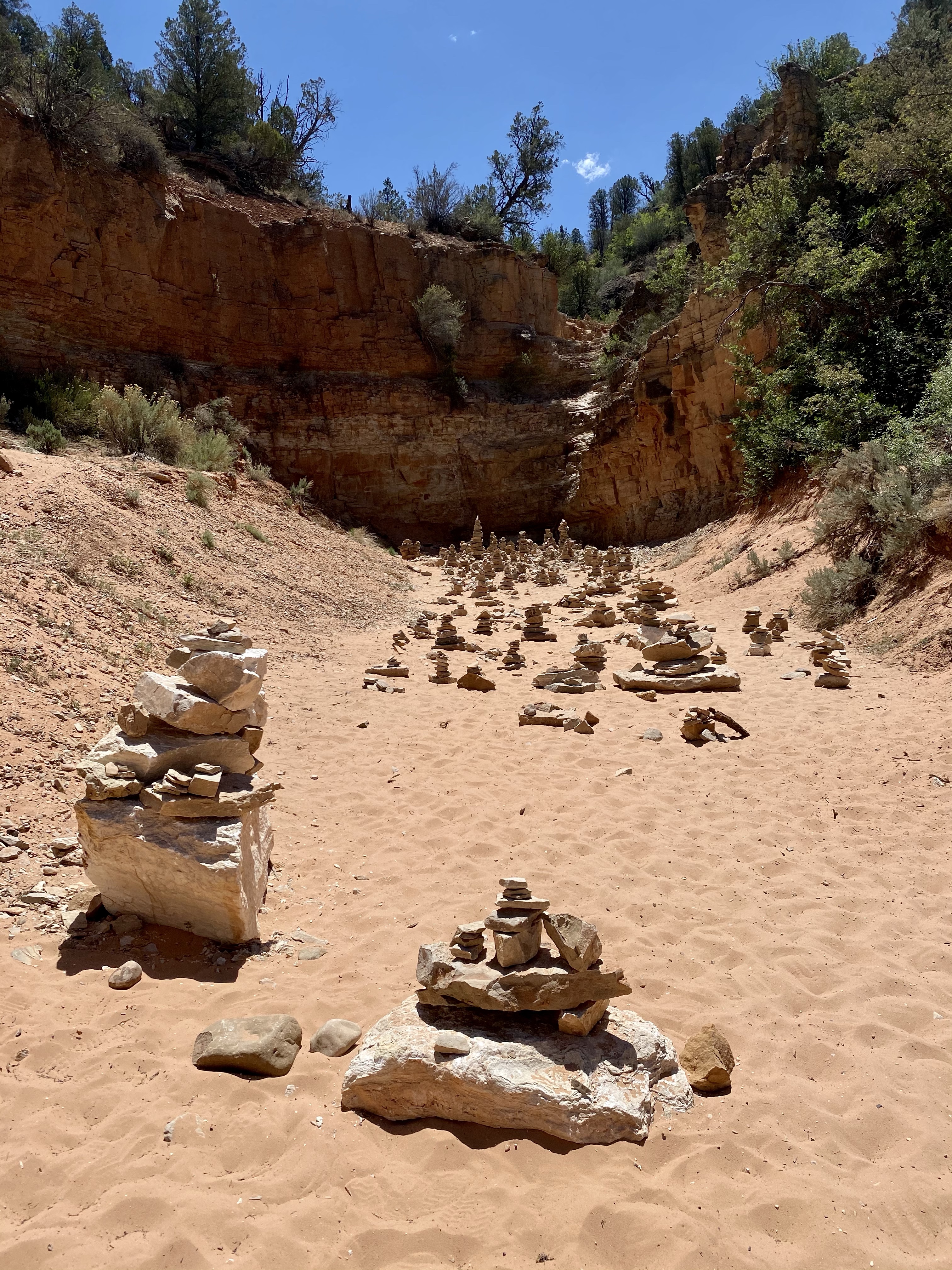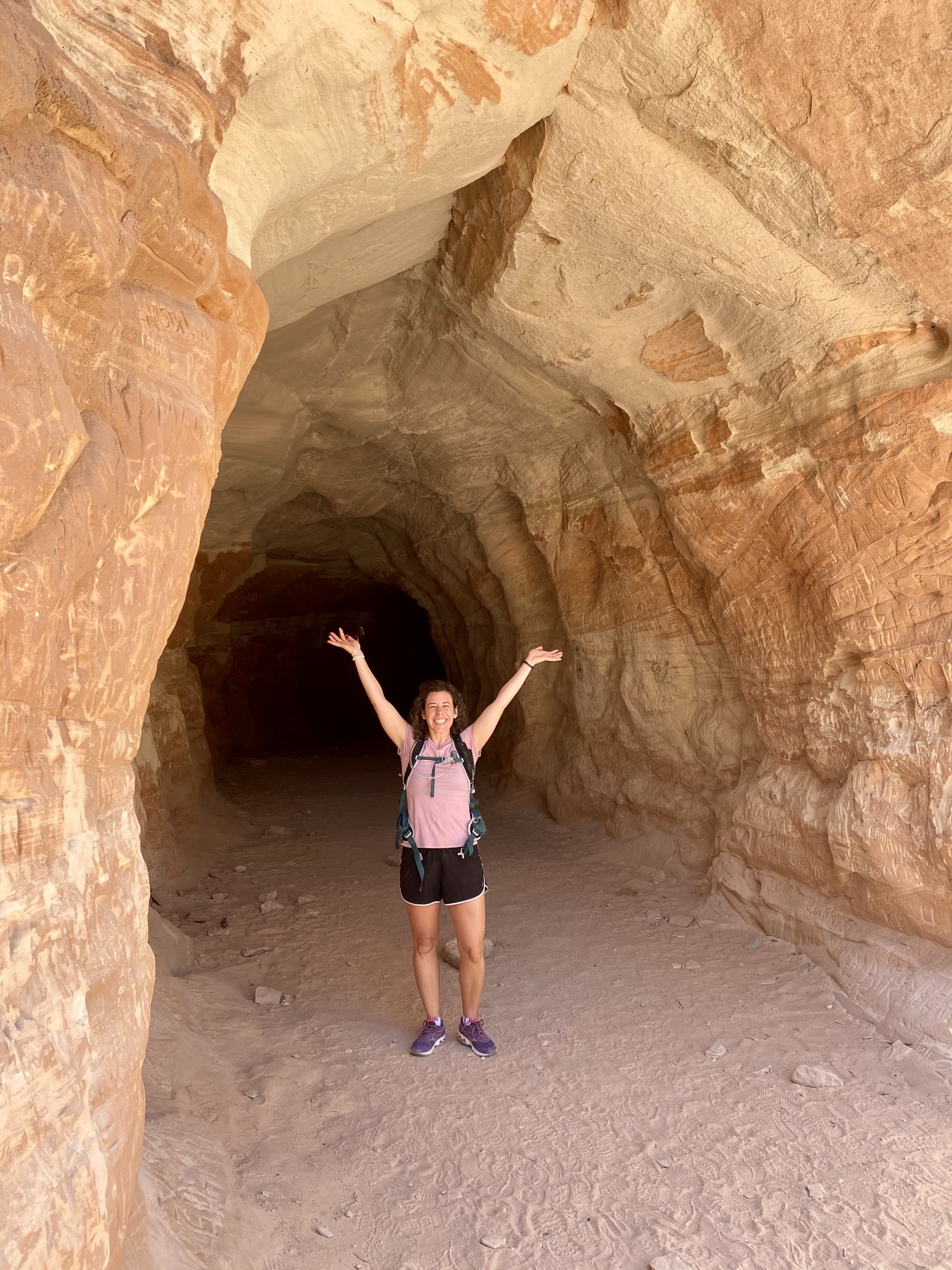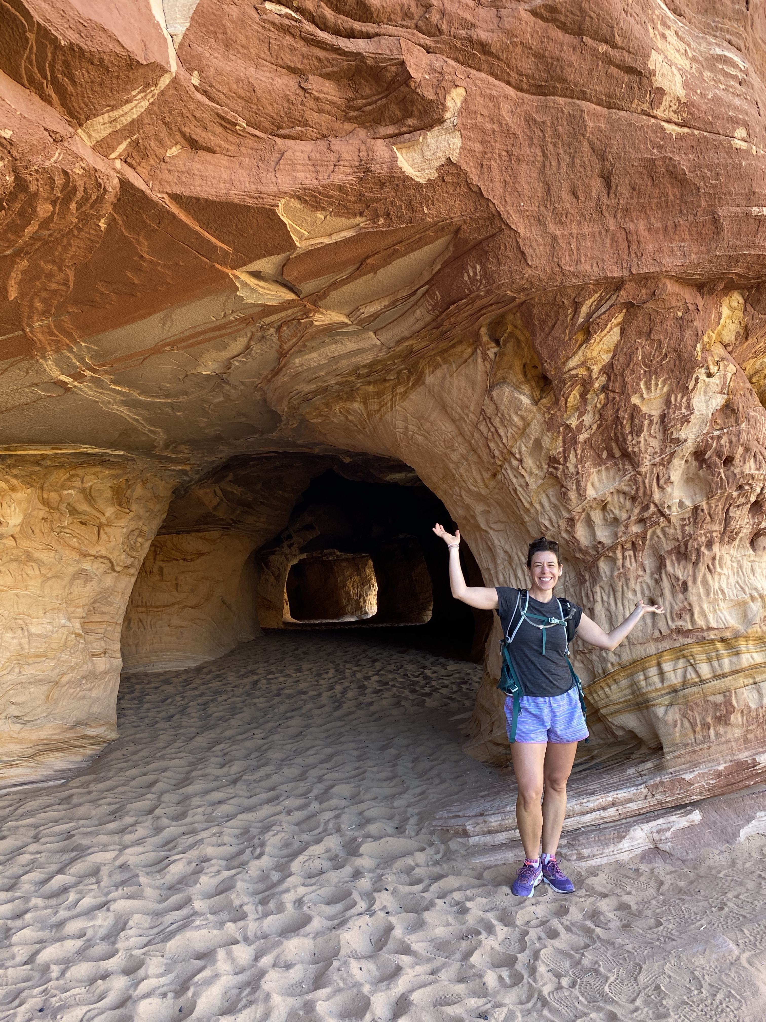 We walked a little farther, around the bend in the hot, pink sand, until the trail ended at a cairn forest. I climb up above to see if anything interesting existed further along, but not really, so we headed back to the cool shelter of the cave and took our time traveling back. Crystal was searching for our names, believing if she didn’t find them that meant “Crystals” or “Shannons” were good people for not defacing the sandstone. I’m proud to say no Shannon carving was found! (Crystal and Max were not so lucky, haha.)