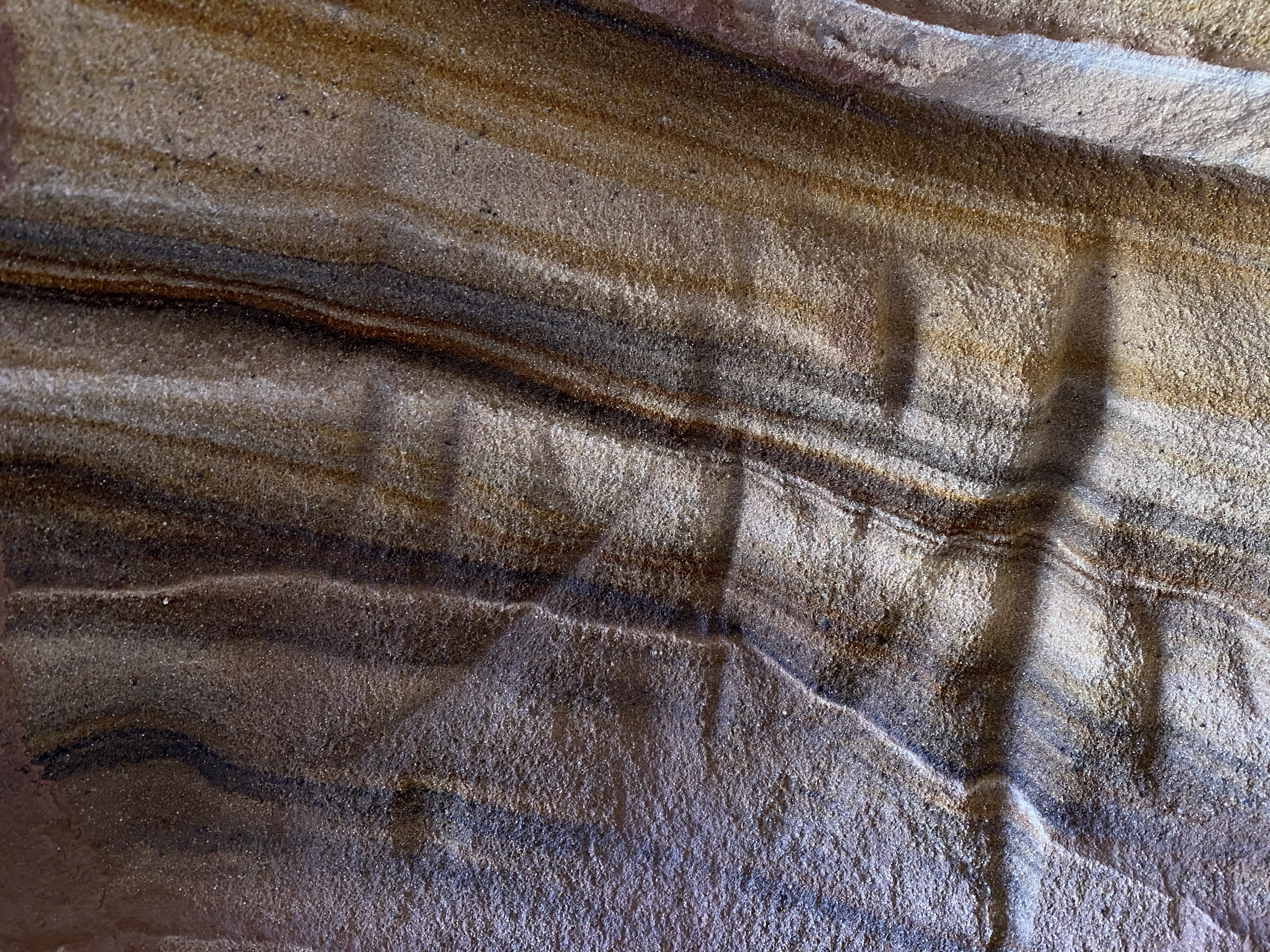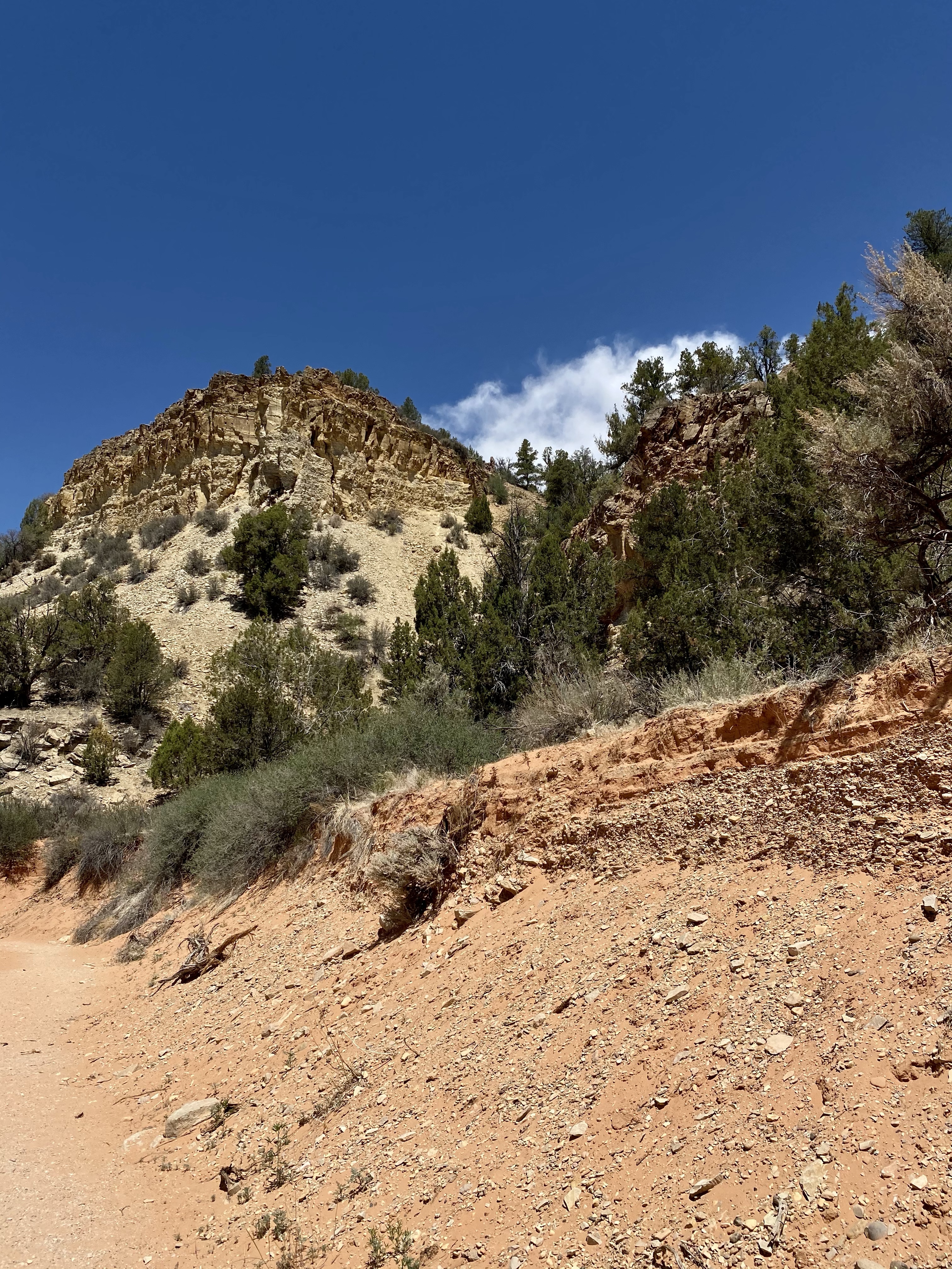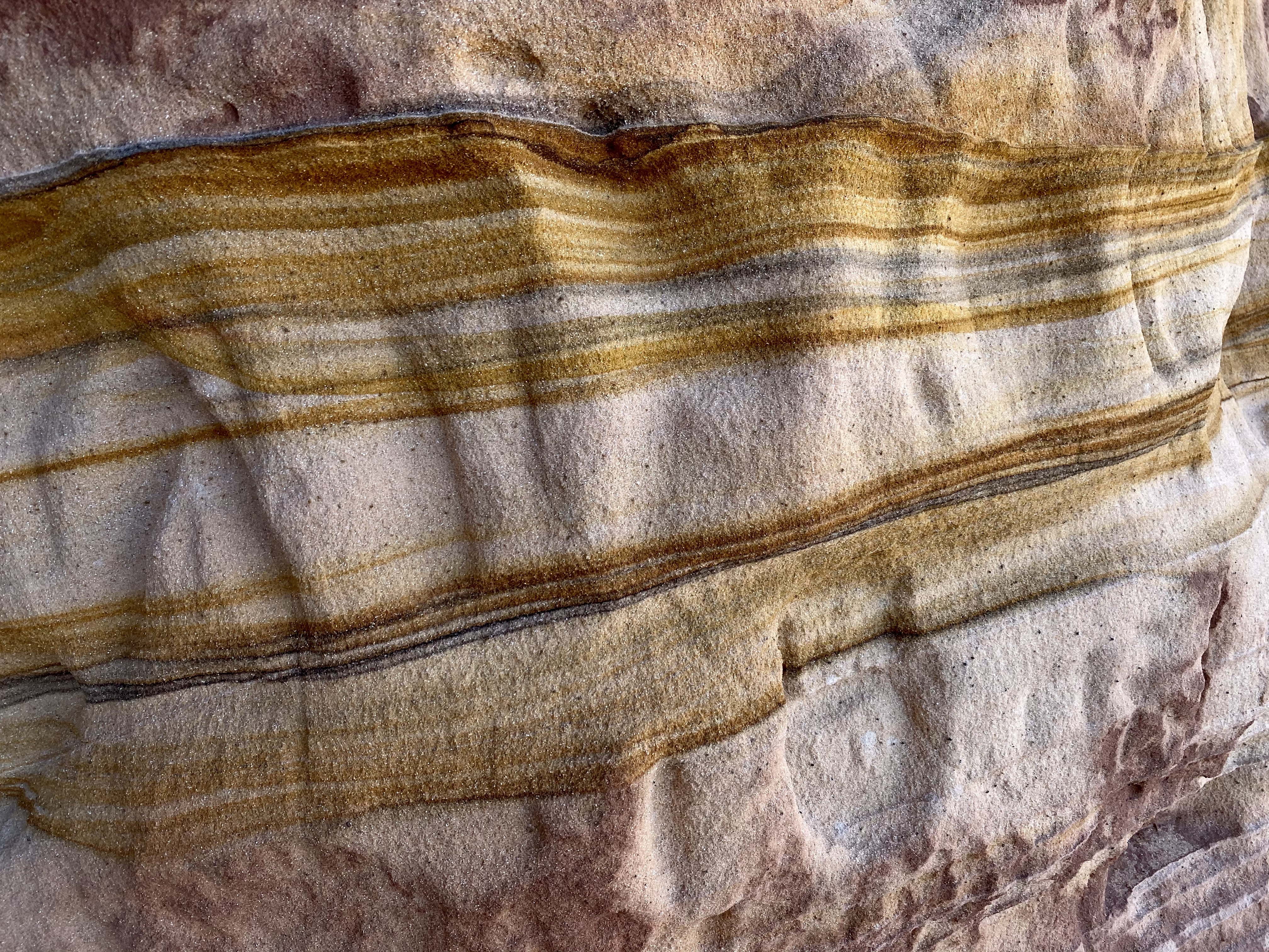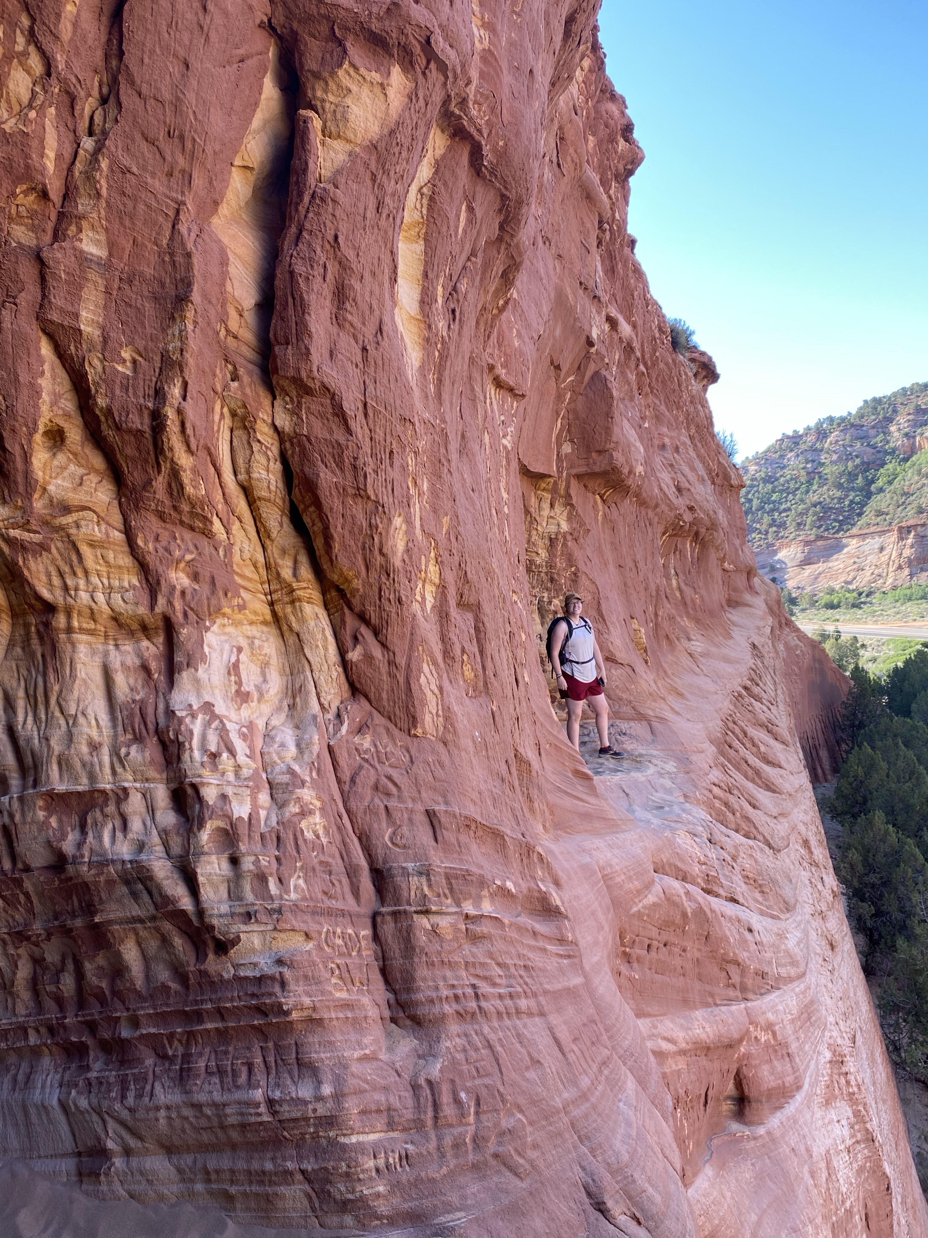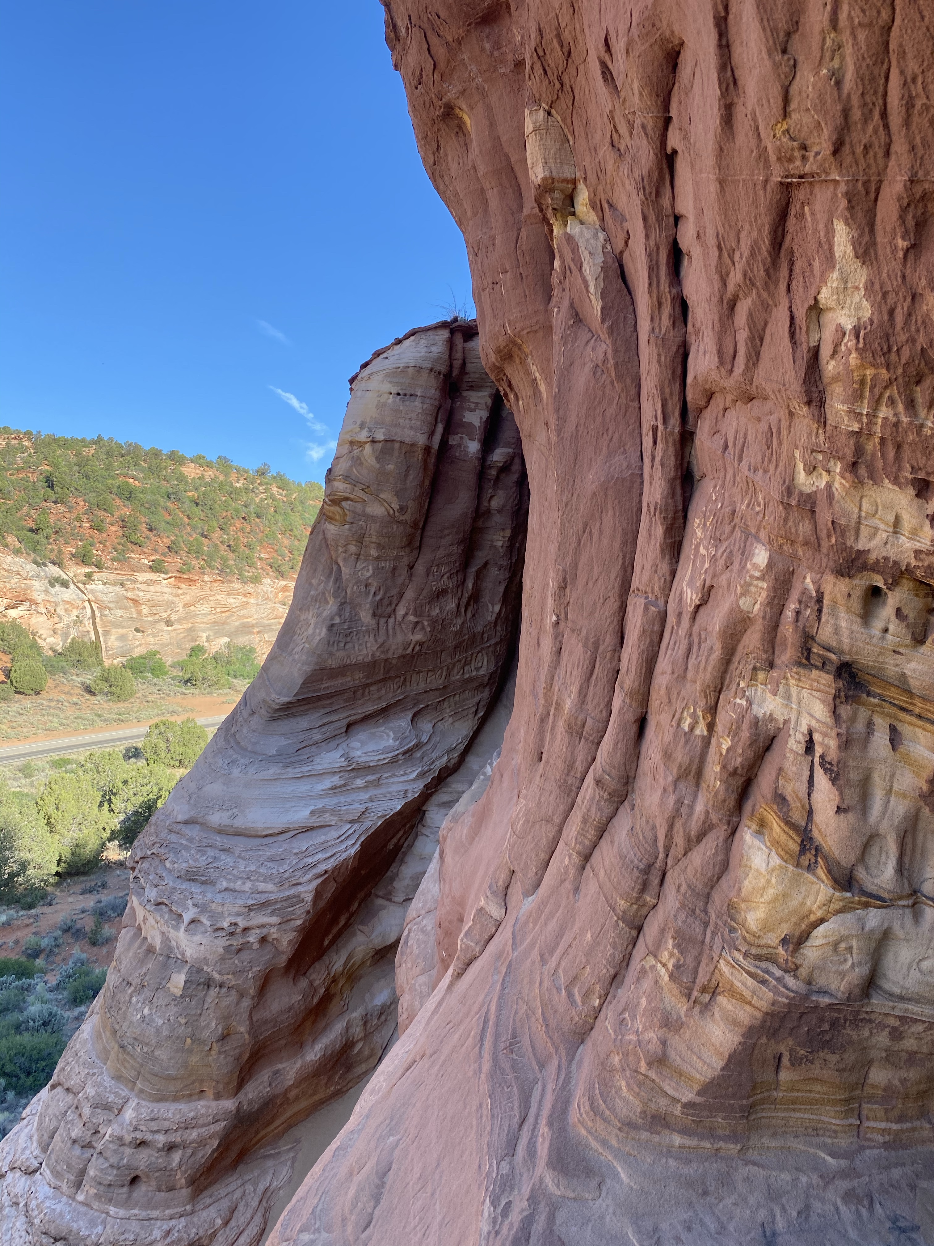 The cave openings face the road, and the tunnels reach back until no light reaches the walls. It’s one long corridor with a few rooms, several openings on the cliff side. We pondered where people might have slept (if the folklore is true), what might have been the kitchen, or bathroom. If families lived here, I have no idea how they managed children up on the ledge! Scary! More likely, if people did live here, it was men sent on missions by the Mormon church. No matter what the use, it was pretty neat! The colors are what captured my attention the most, brilliant streaks of yellow waving and circling over the surface. Large chunks of red and pink streaked with white. A work of art.