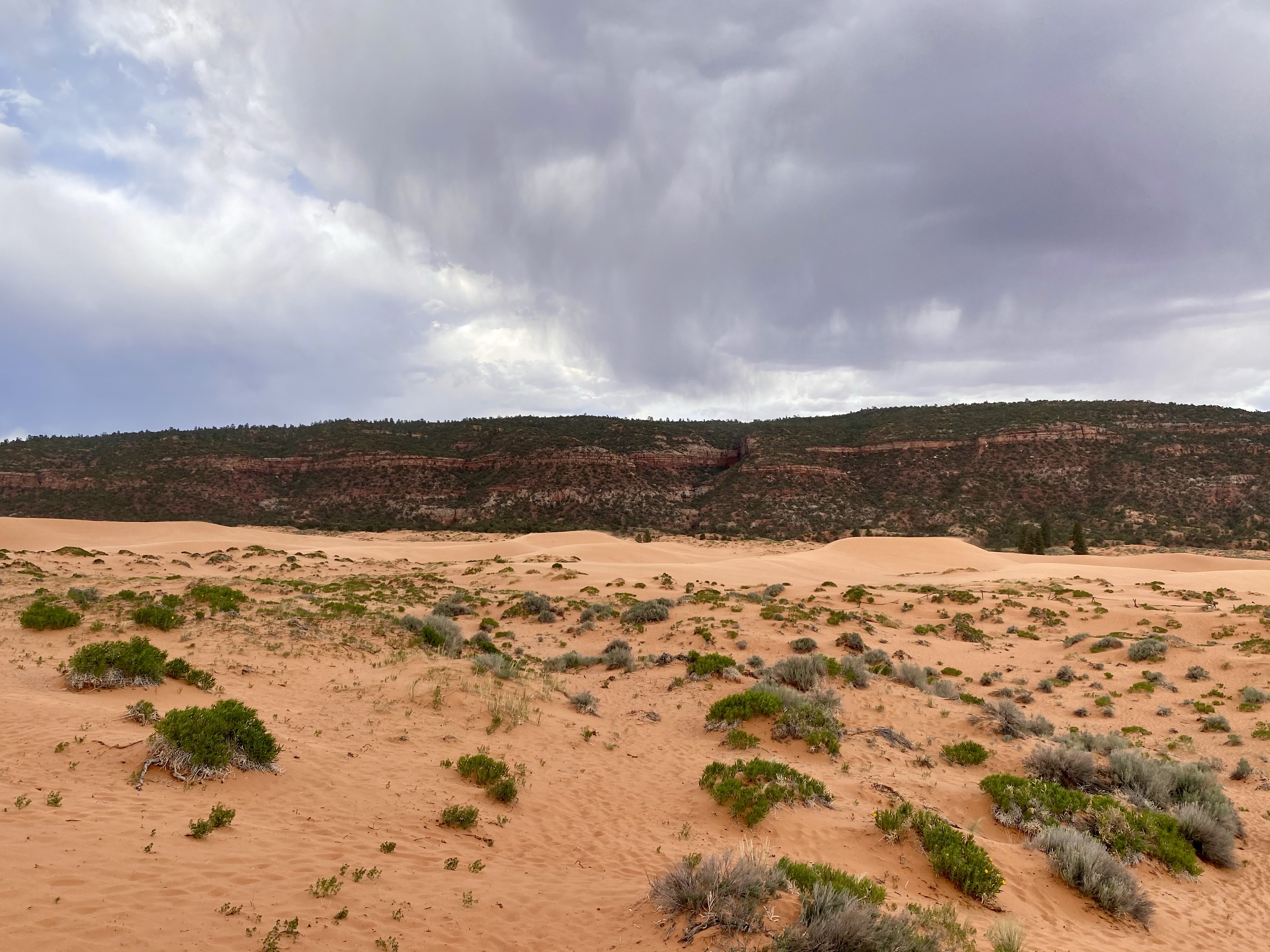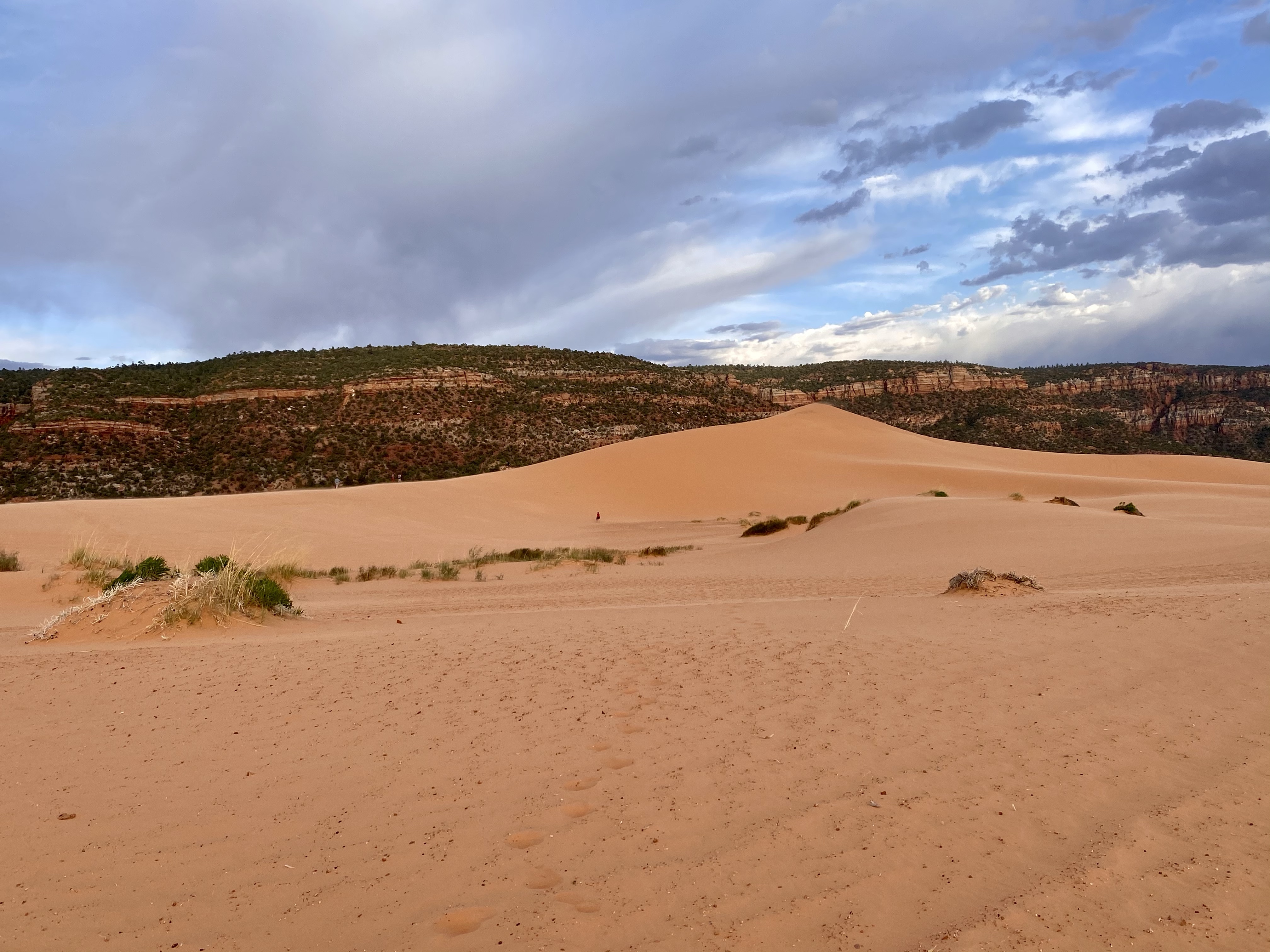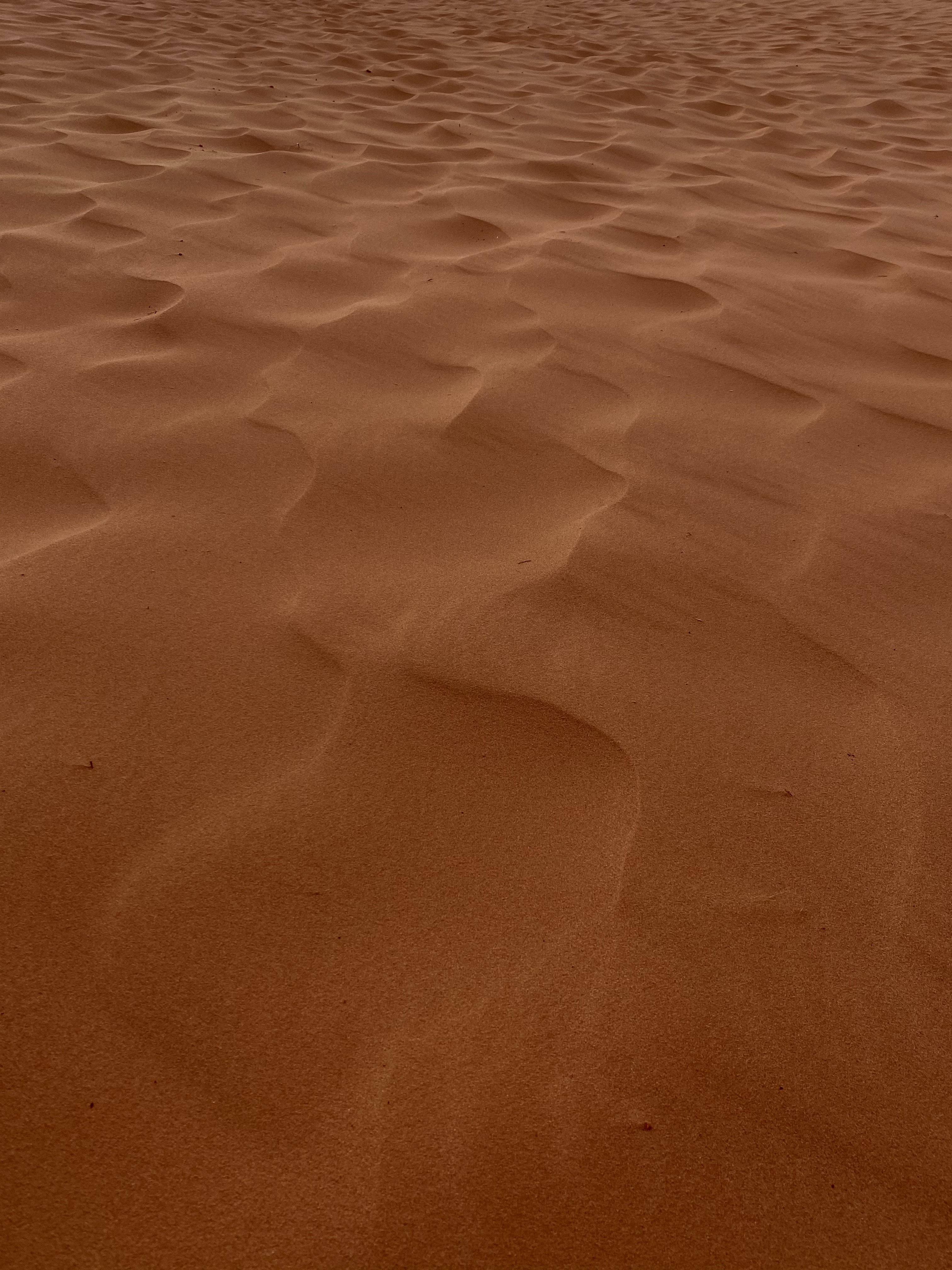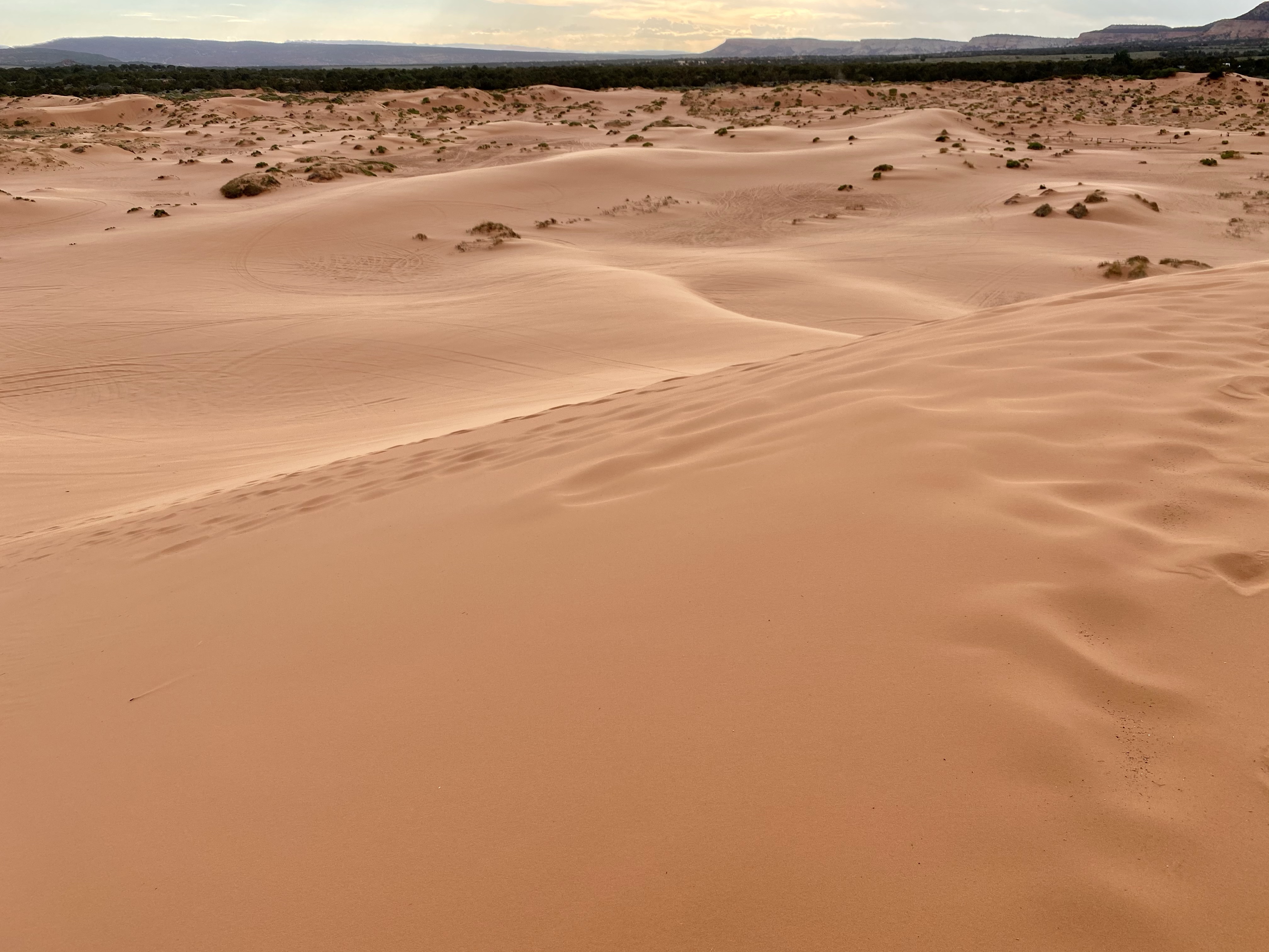 As we drove down the remote roads, the brush lessened and the sand appeared. Coral pink it truly was, as is someone doused the sand in food coloring. The sand originates from the erosion of the Navajo Sandstone beds nearby, the color from a high concentration of iron oxides. The right combination of landscape and winds create the dunes here, the only spot in Utah. Most of the sand moves from saltation, the bouncing of the grains along the dune field, creating uniform ripples on the surface.
