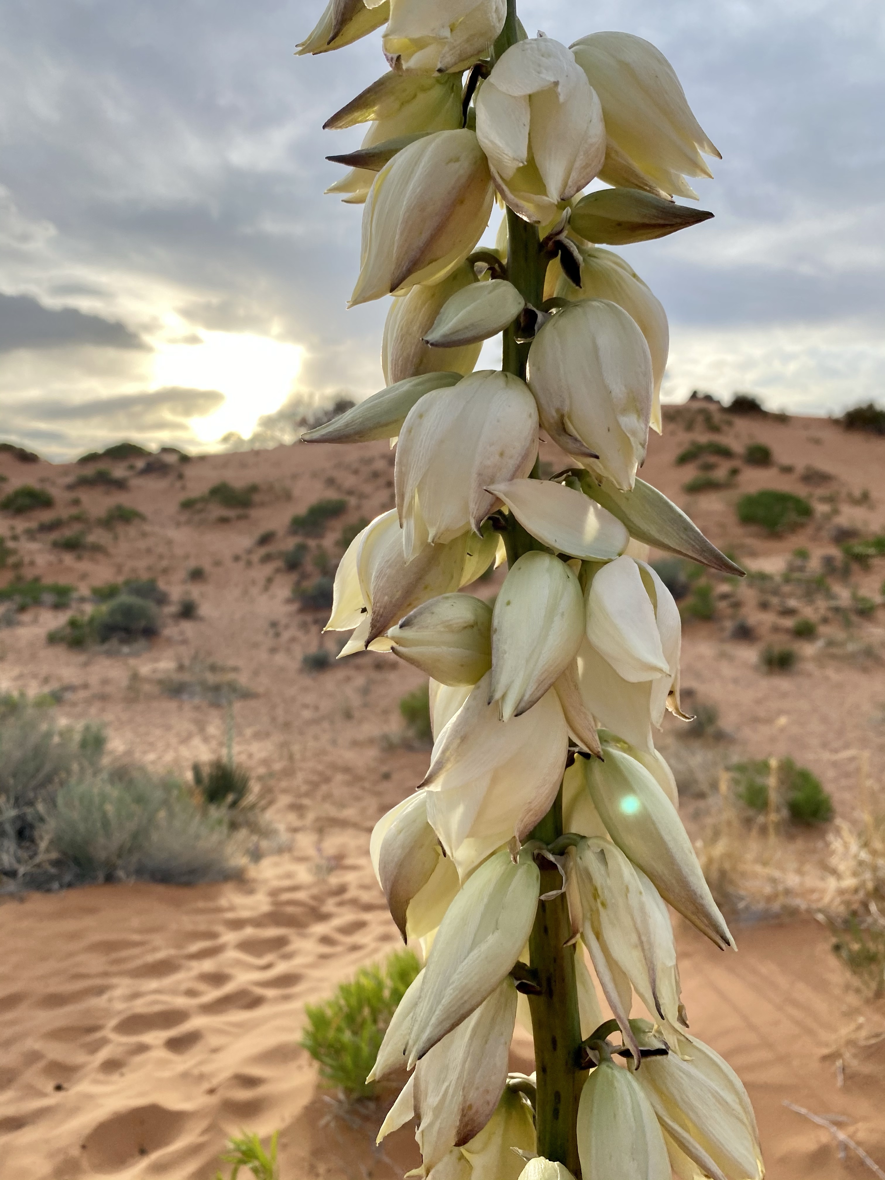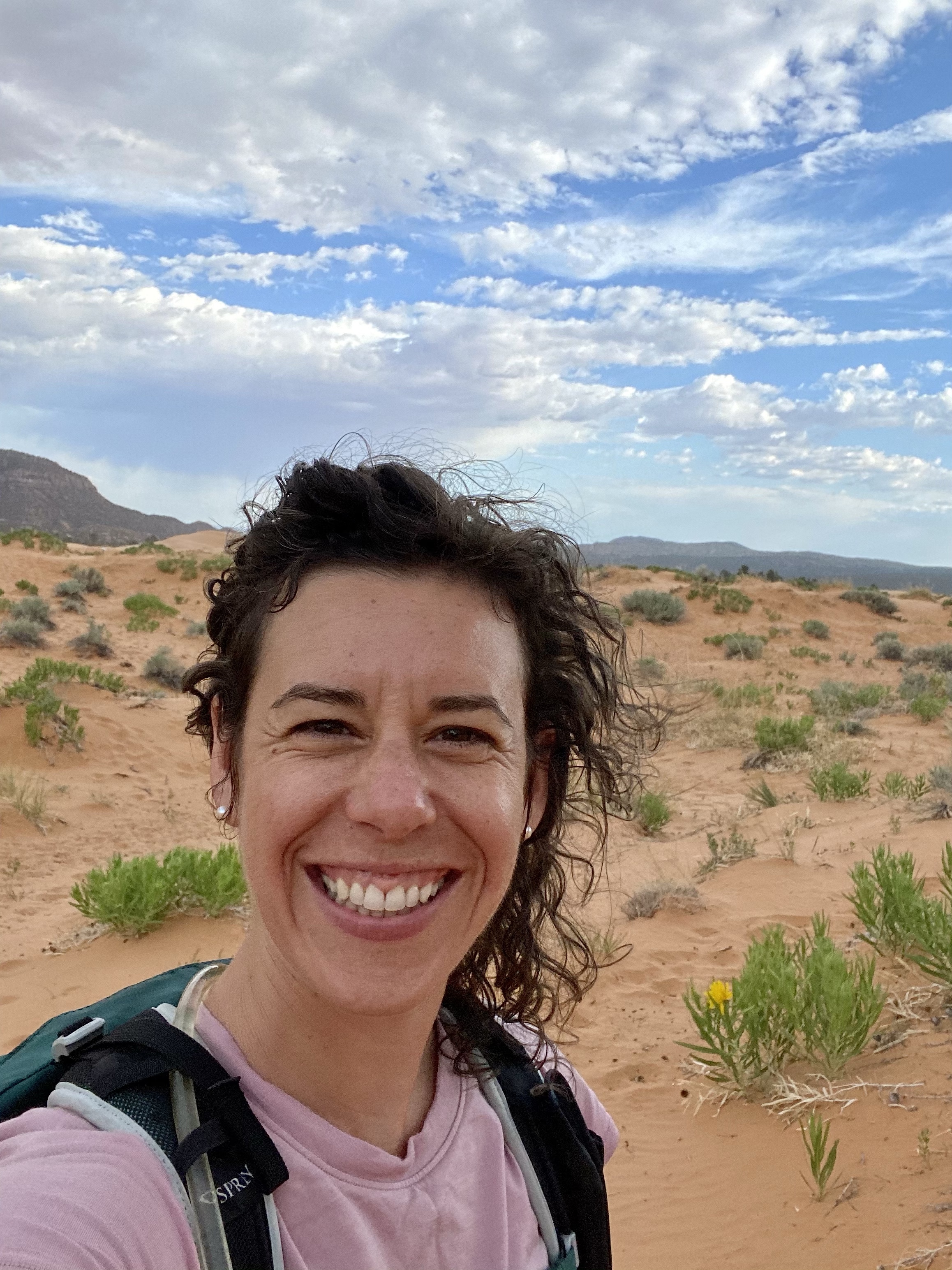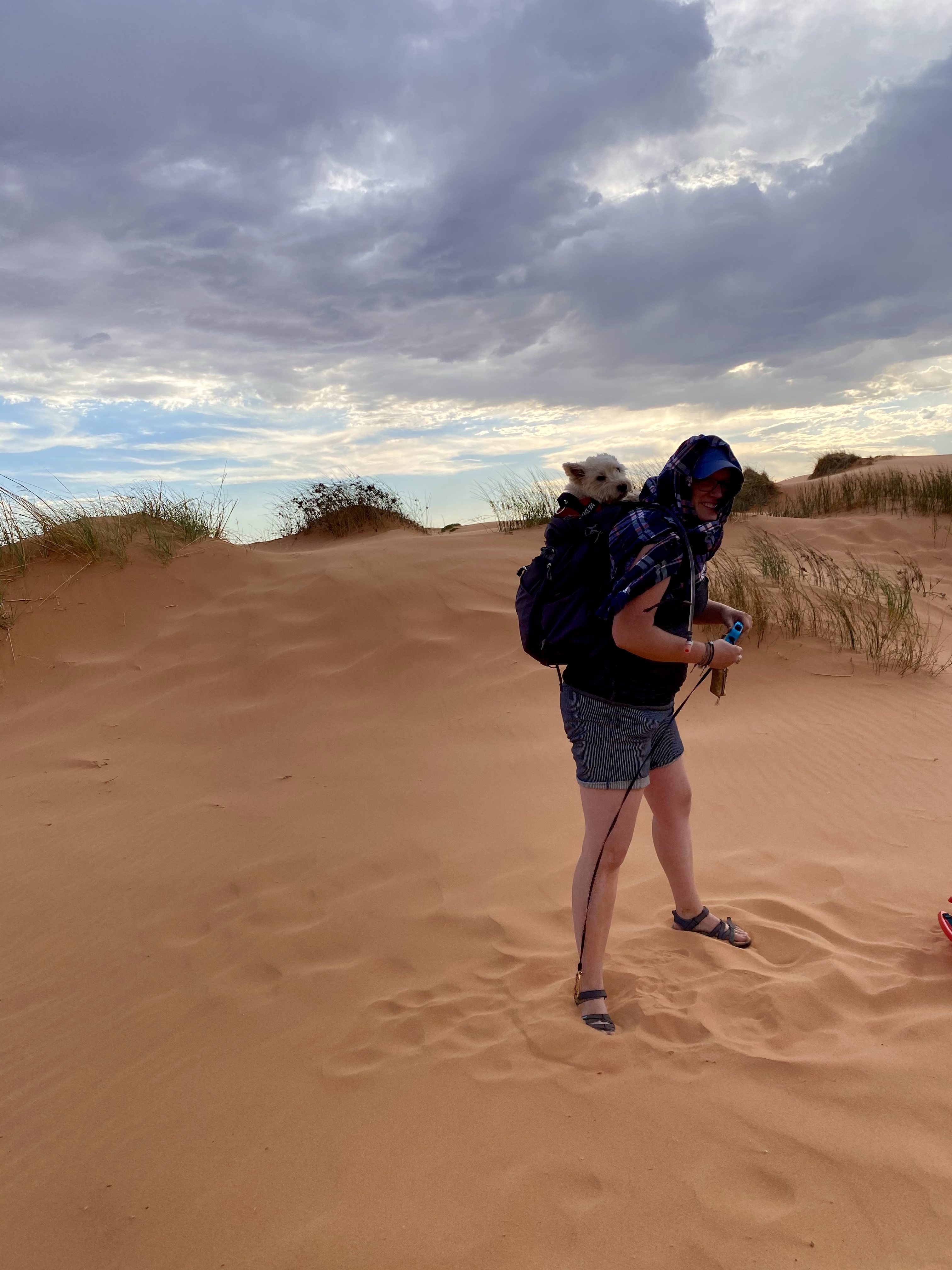 At this point Max and Crystal had had enough. Max was packed up in Crystal’s backpack and Crystal made a makeshift head covering. Anything to try to protect themselves from the blasting sand! But I craved one more trip up for some picture taking. While the OHVs whipped around on the sand beneath me, from the top it was peaceful and gorgeous. Pink sand – I still can’t get over it! But eventually the wind did win out, and I headed back, scouting flowers and chunks of unbroken sandstone on the way.