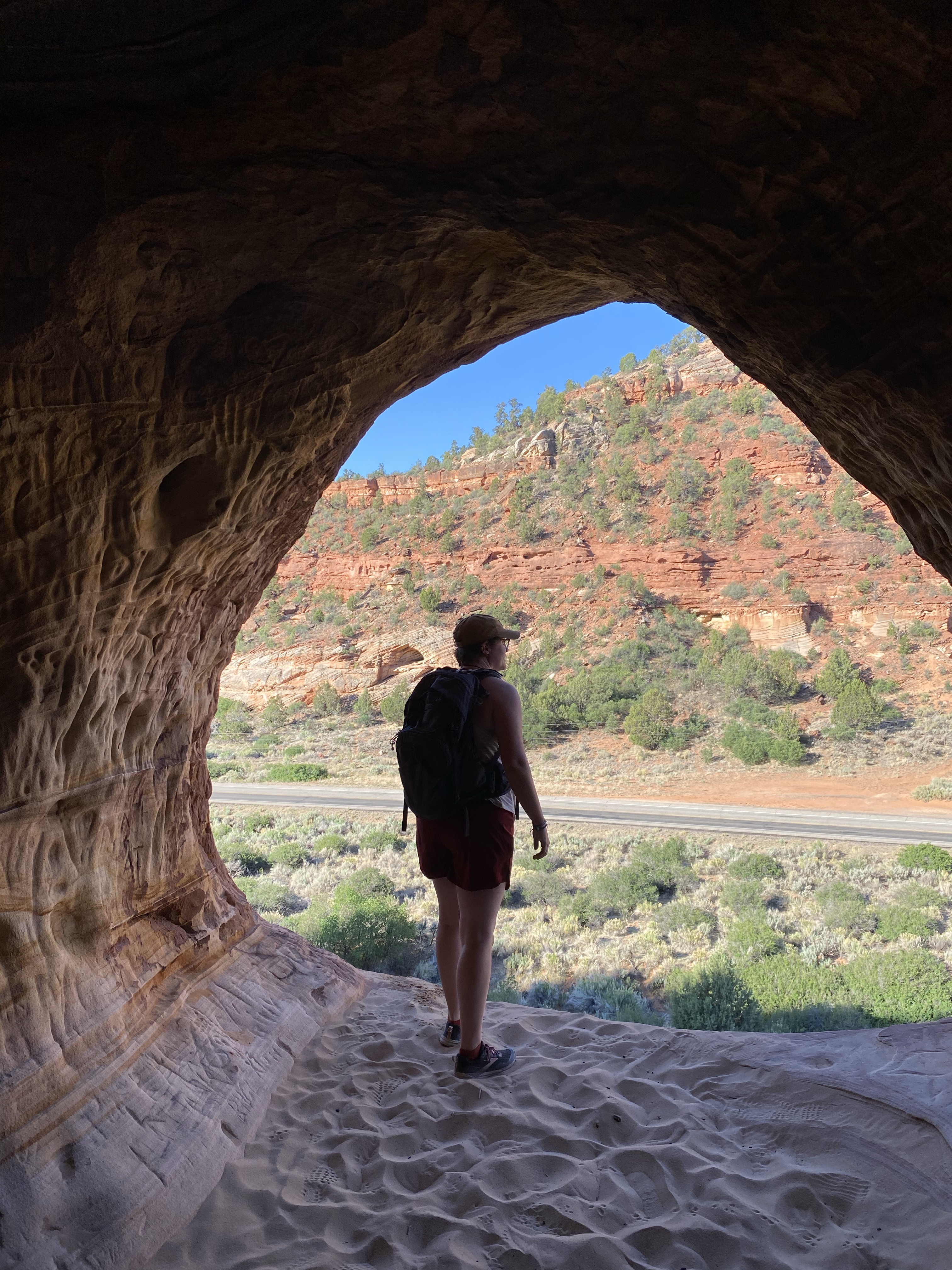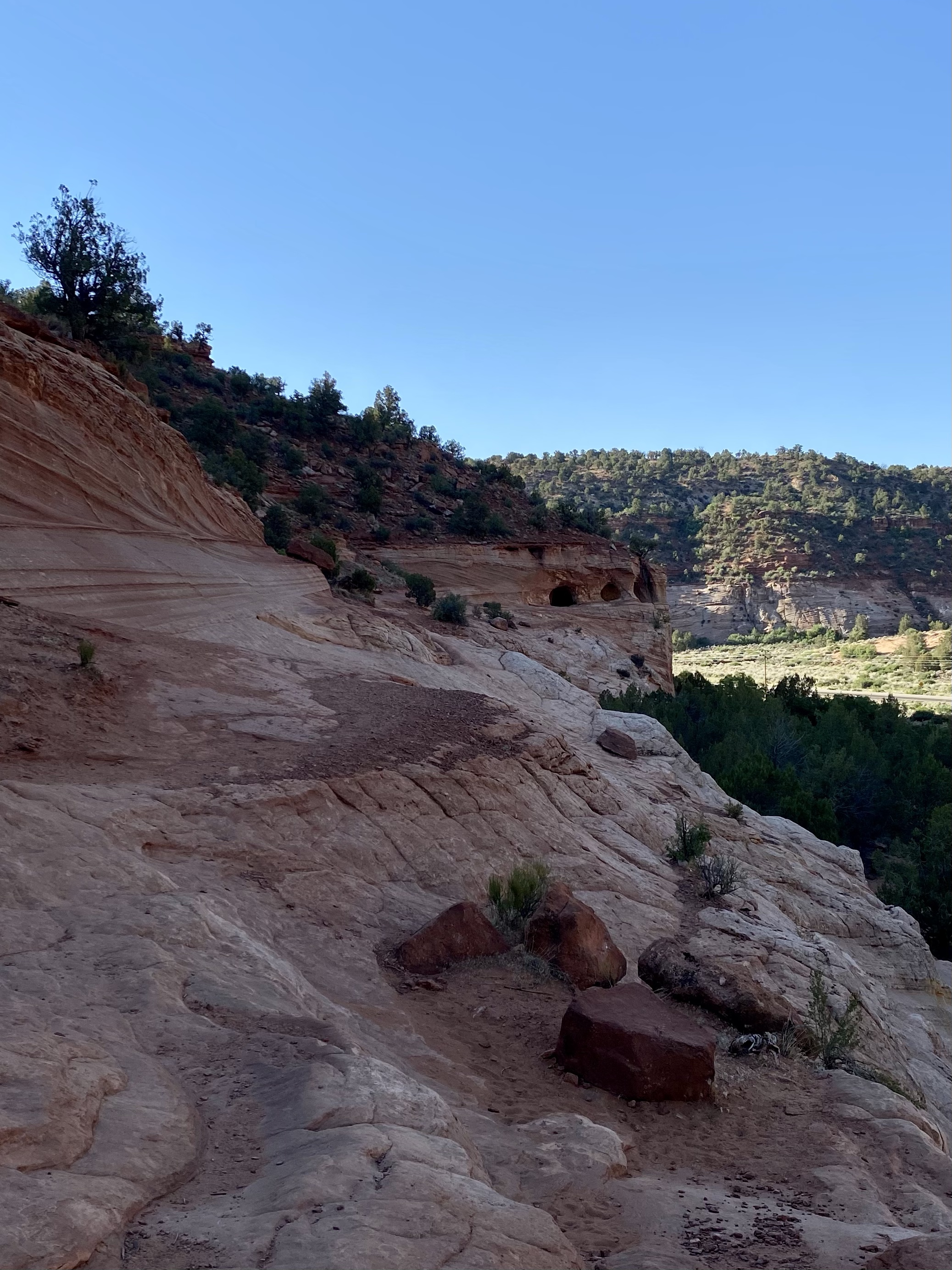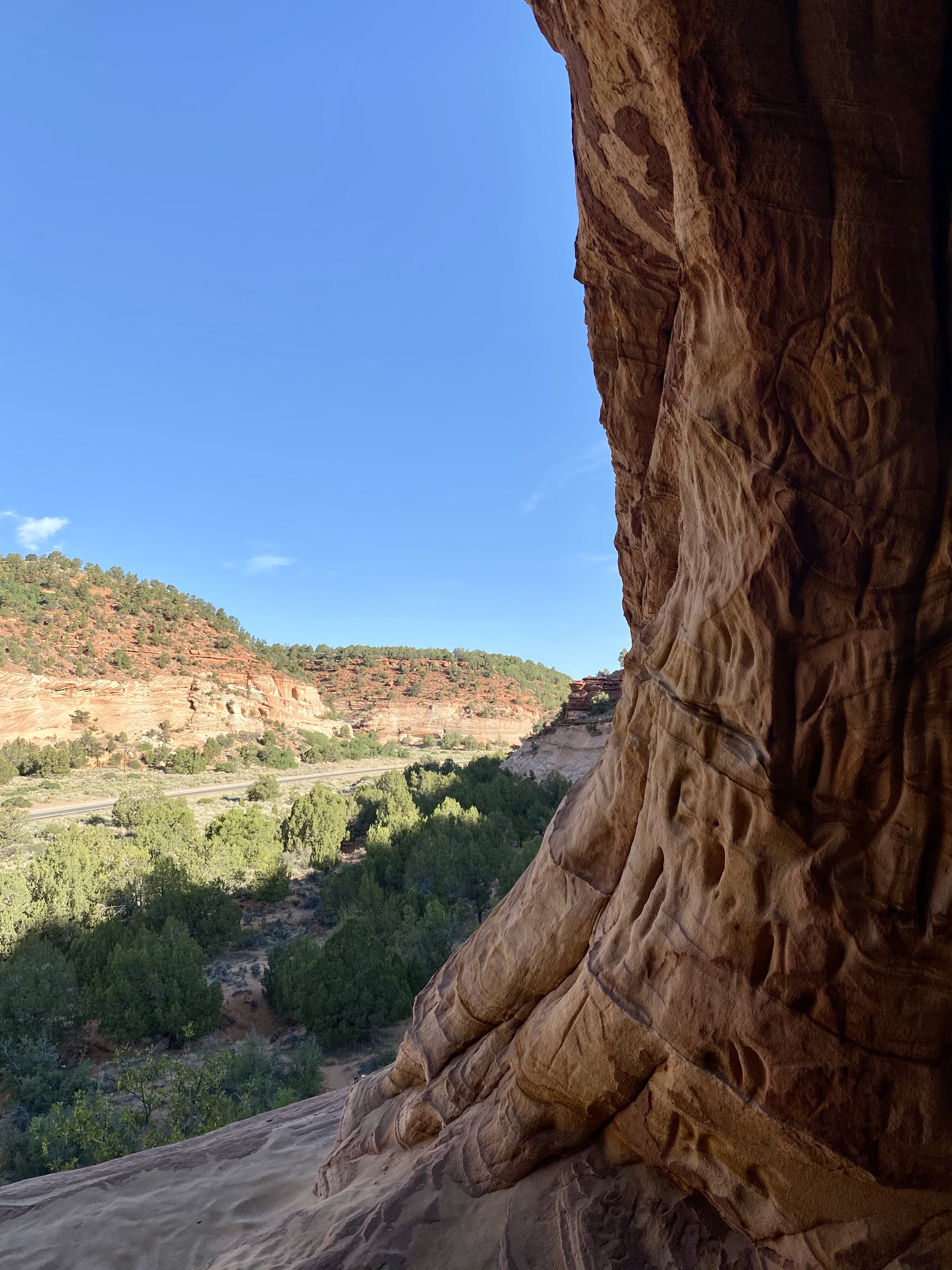 Crystal and I left Max in the car, temps still cool and the time away short, and headed across the street. A well worn path guided us to the cliff, then we slowly bouldered our way up to the ledge. Carefully, staying to the inside, we walked along the smooth sandstone , down and up, to the caves at the far end. When we arrived, we had the whole place to ourselves!