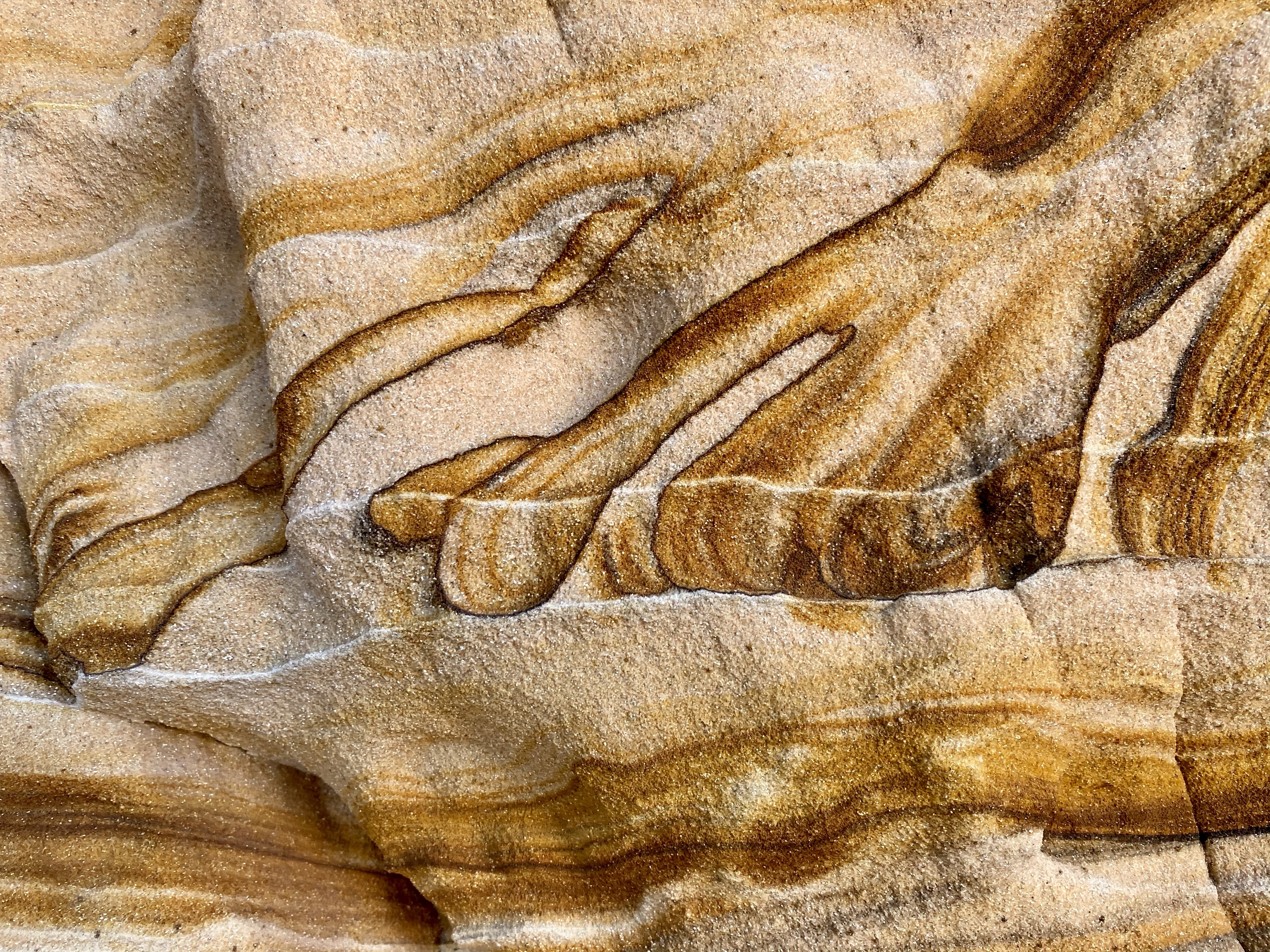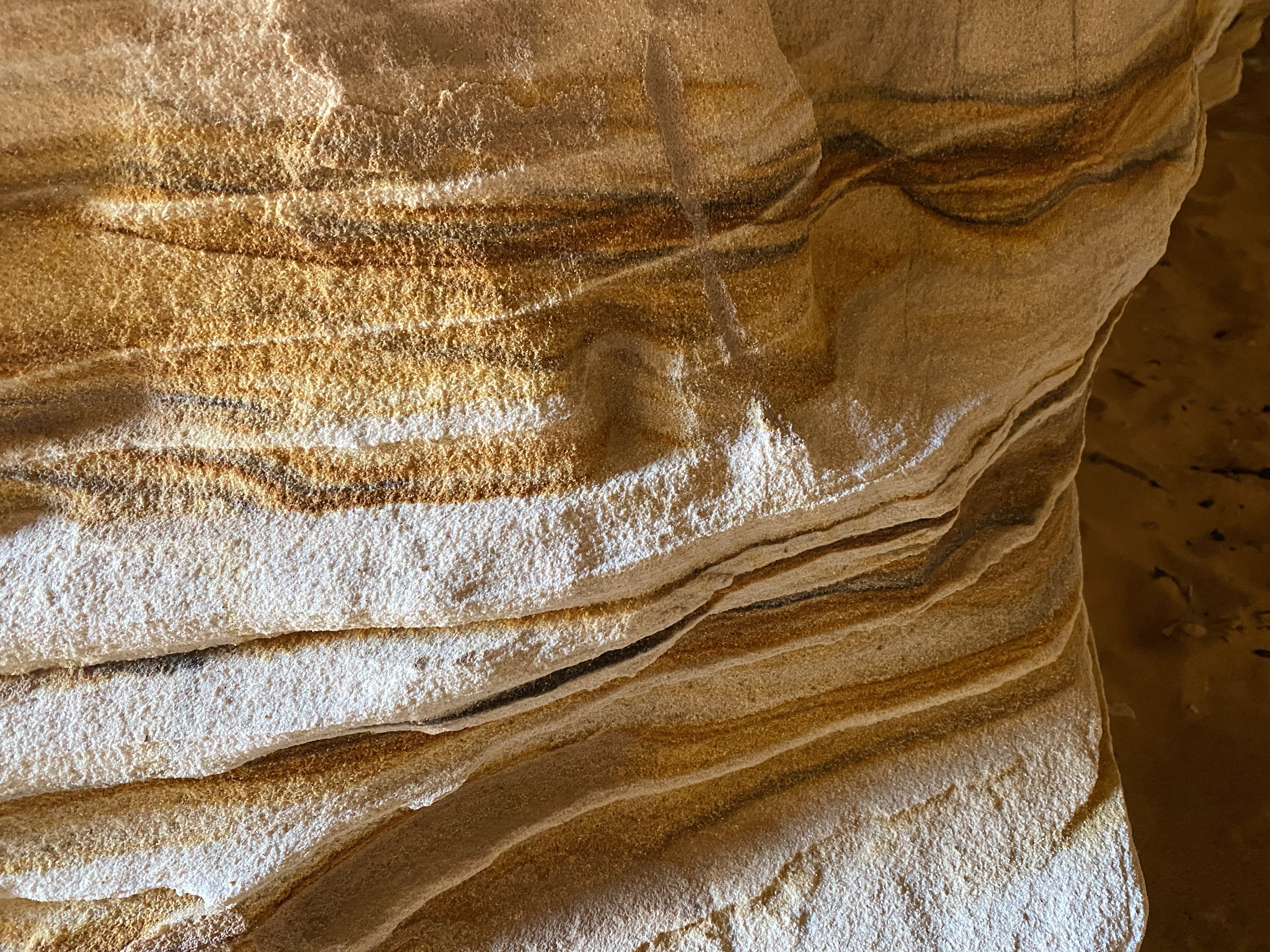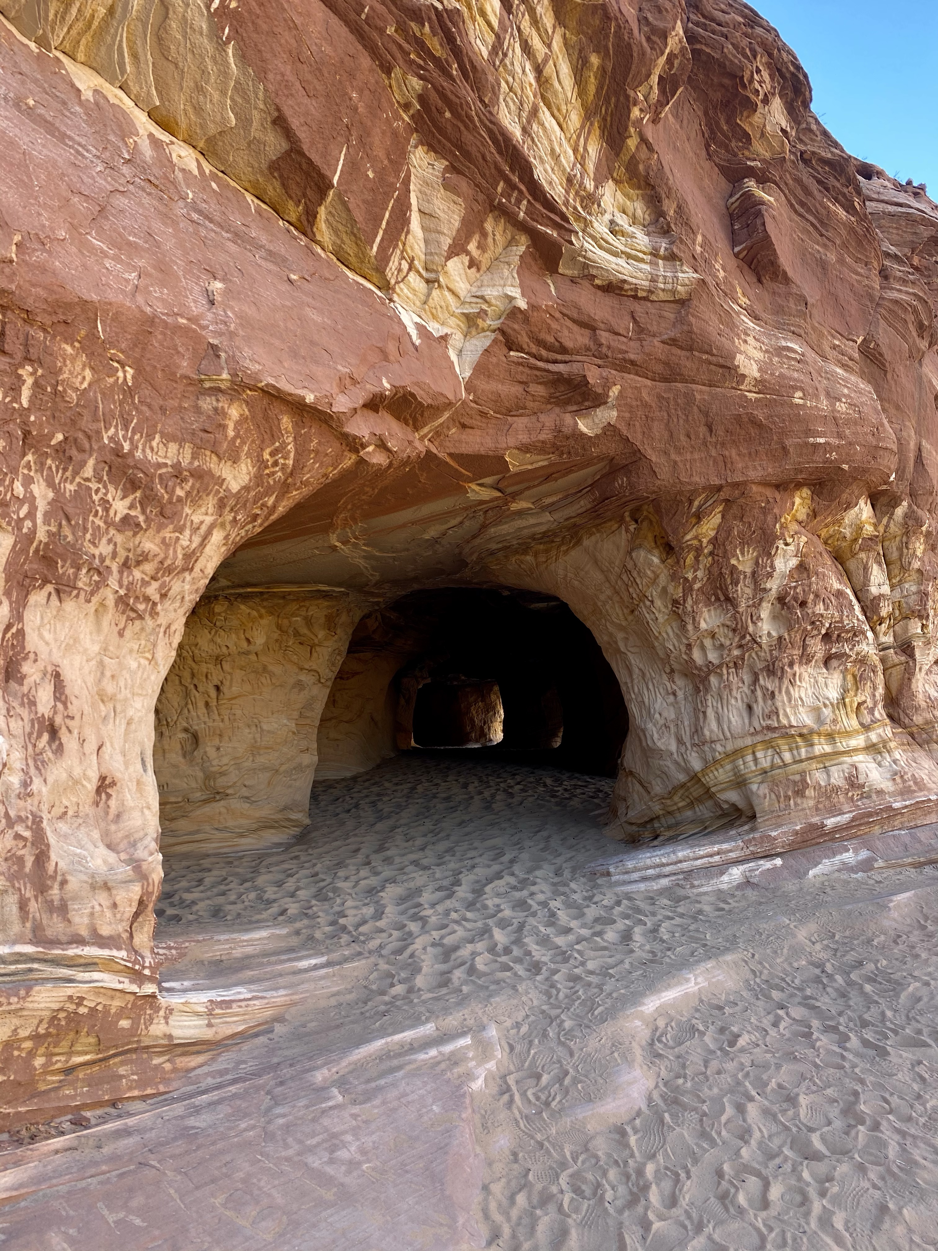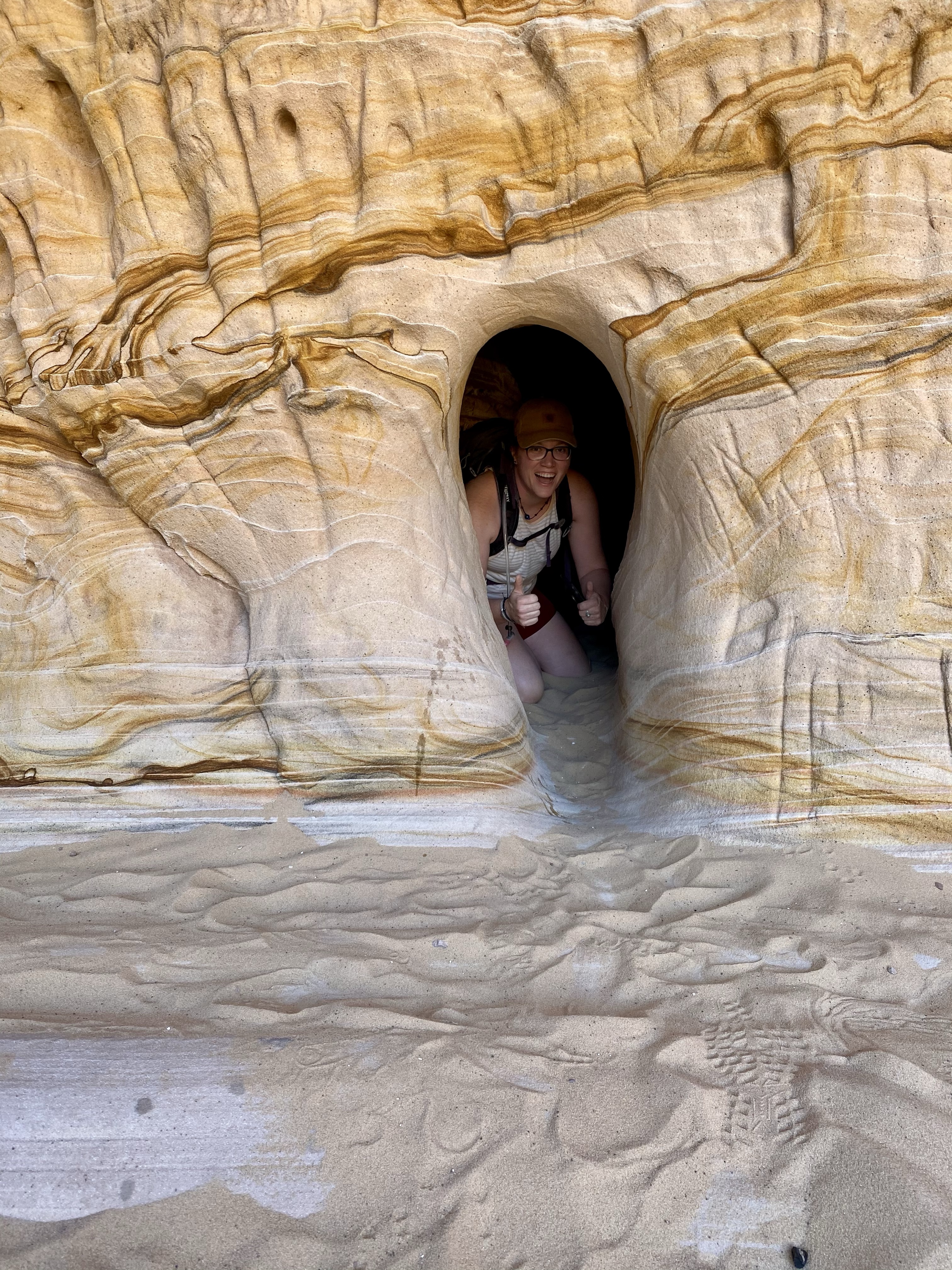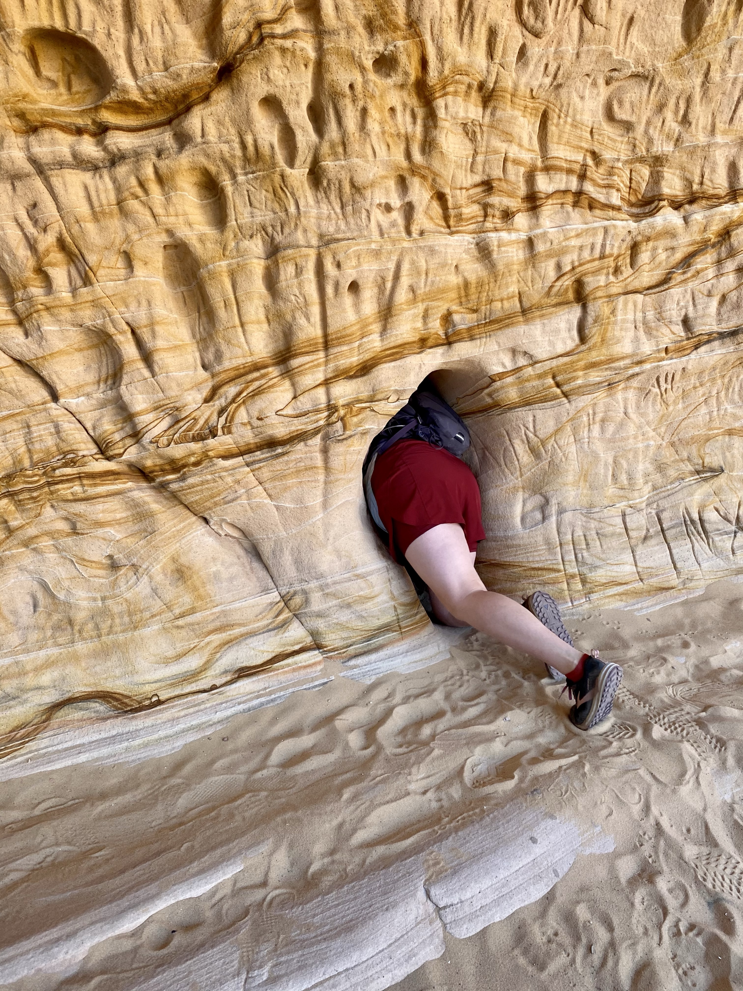 The next morning, we left early and drove to the Sand Caves we had skipped yesterday. Across the street from parking, high up on the cliff, were a series of tunnels carved into the sandstone. I’m not sure of their history, but one local tale says early colonizers used them as shelter.
