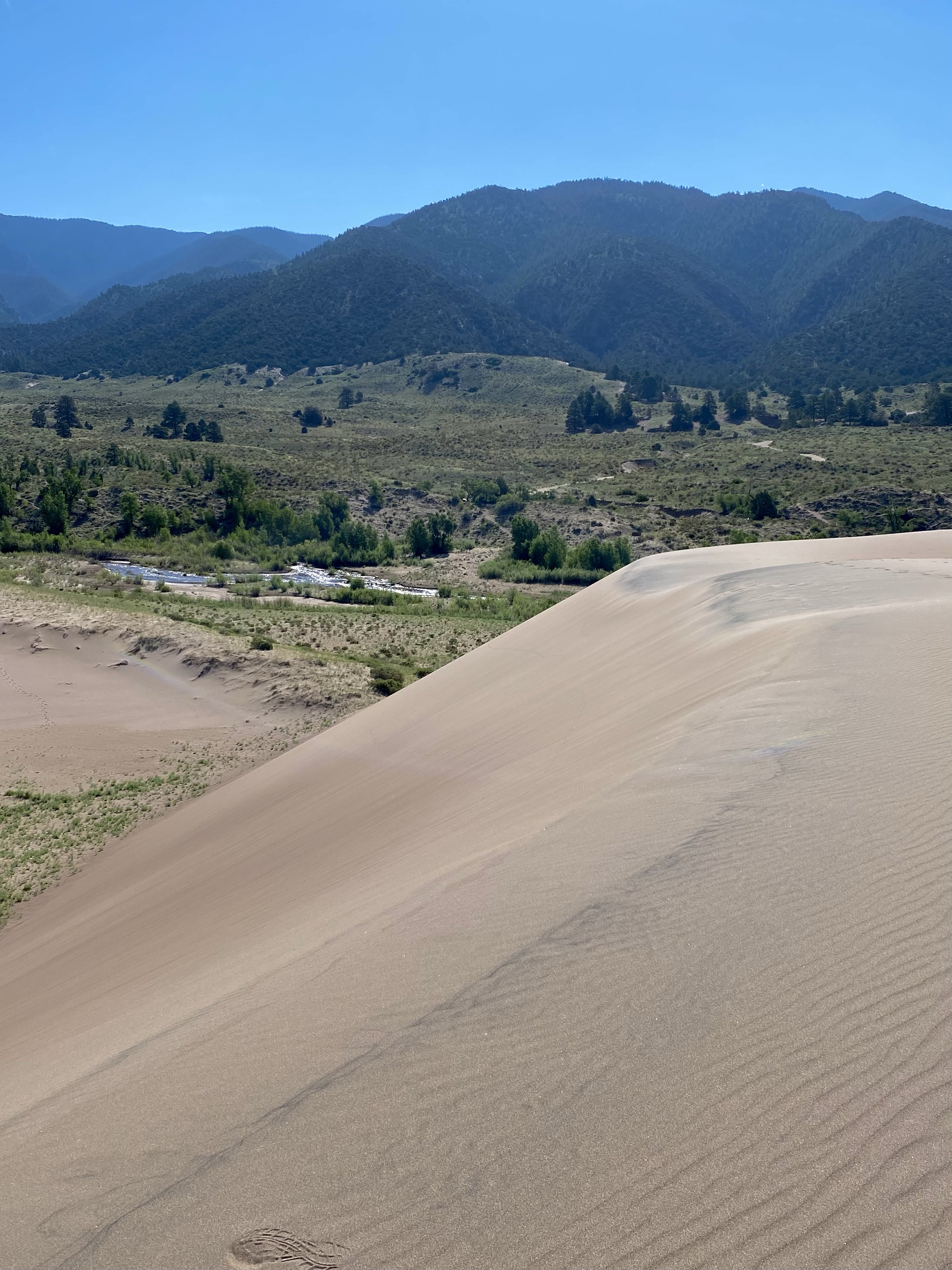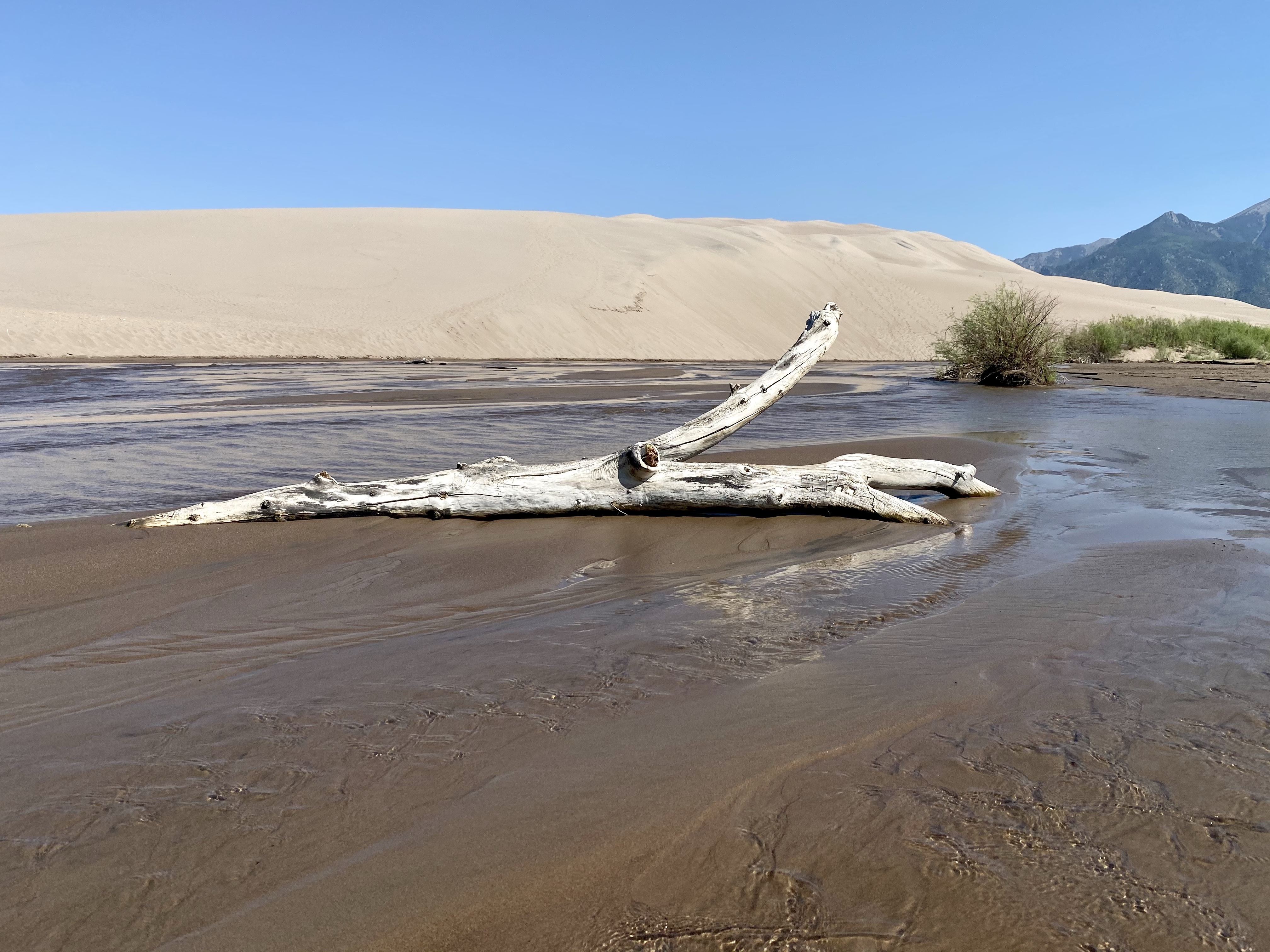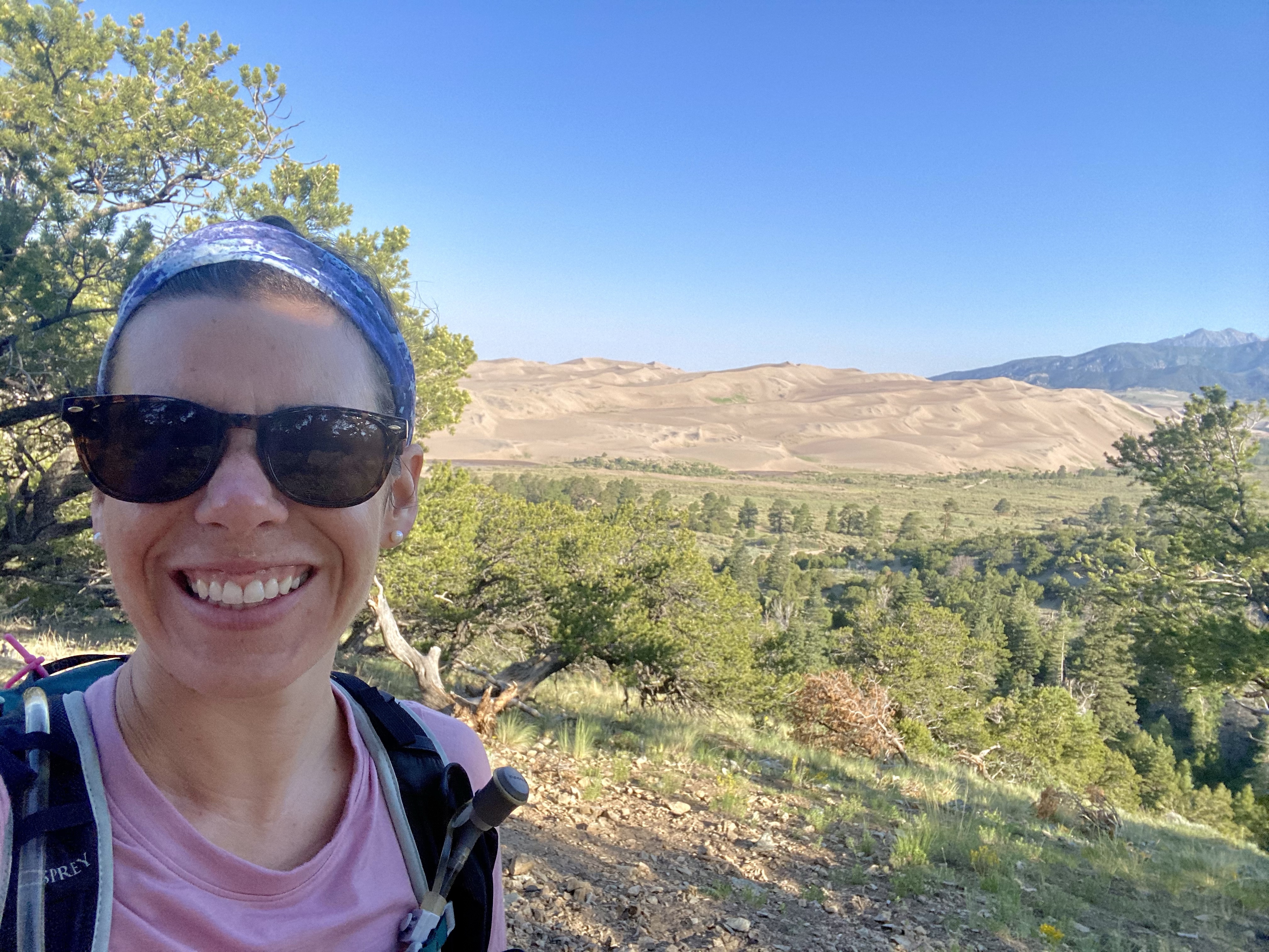 So Day One was really the following day, a Tuesday. I woke early, did yoga, and headed to the Overlook Trail to see the magnitude of this place. On the way up, I was the only one on the trail. Although the sun was rising, it was still cool and I took my time admiring the flora. At the top, a comfy bench awaited me and I sat down to admire the giant sand dunes abutting the gray pointy mountains. This park is really neat, sand dunes, mountains, forest, streams. Who would have thought?