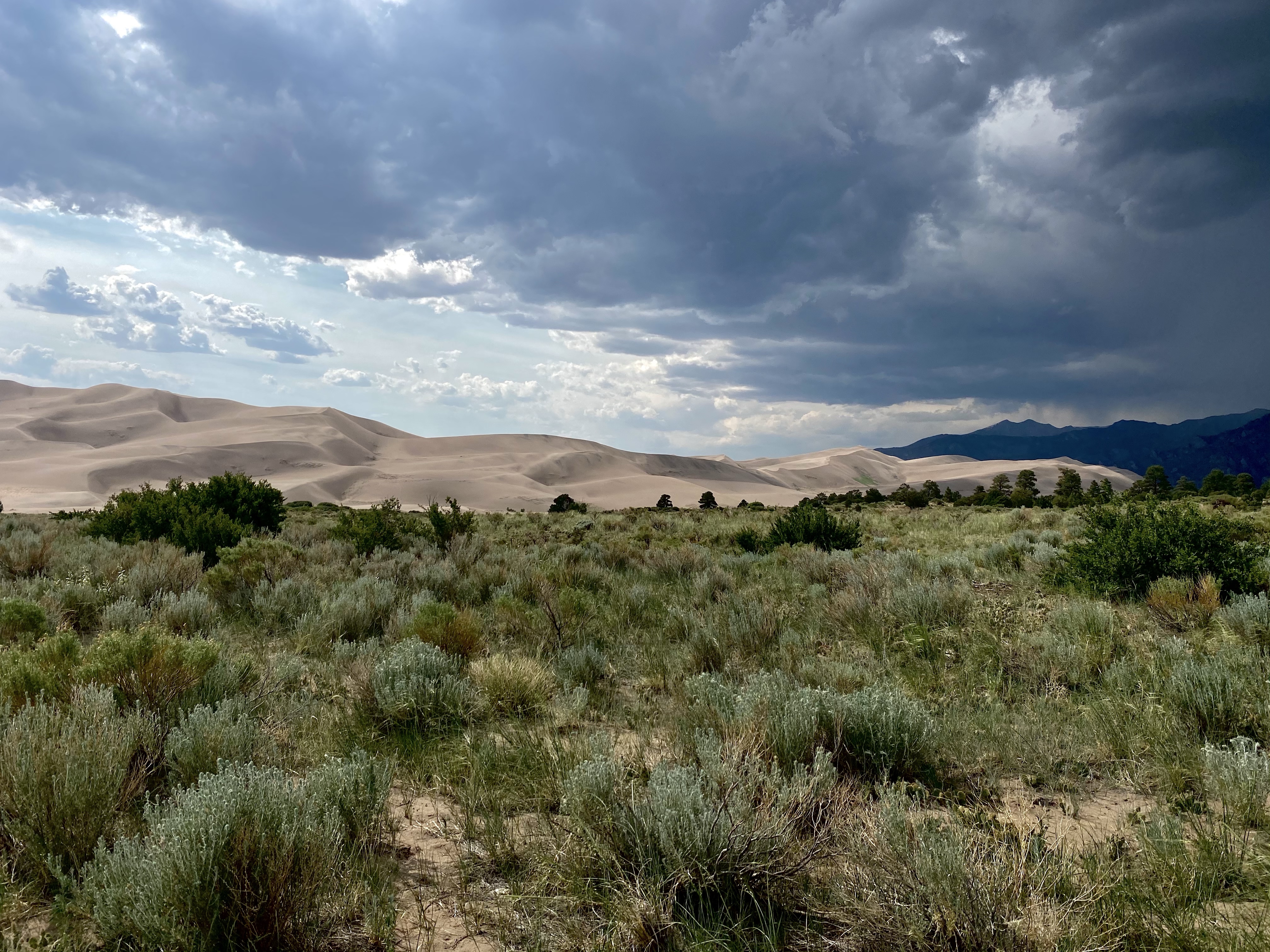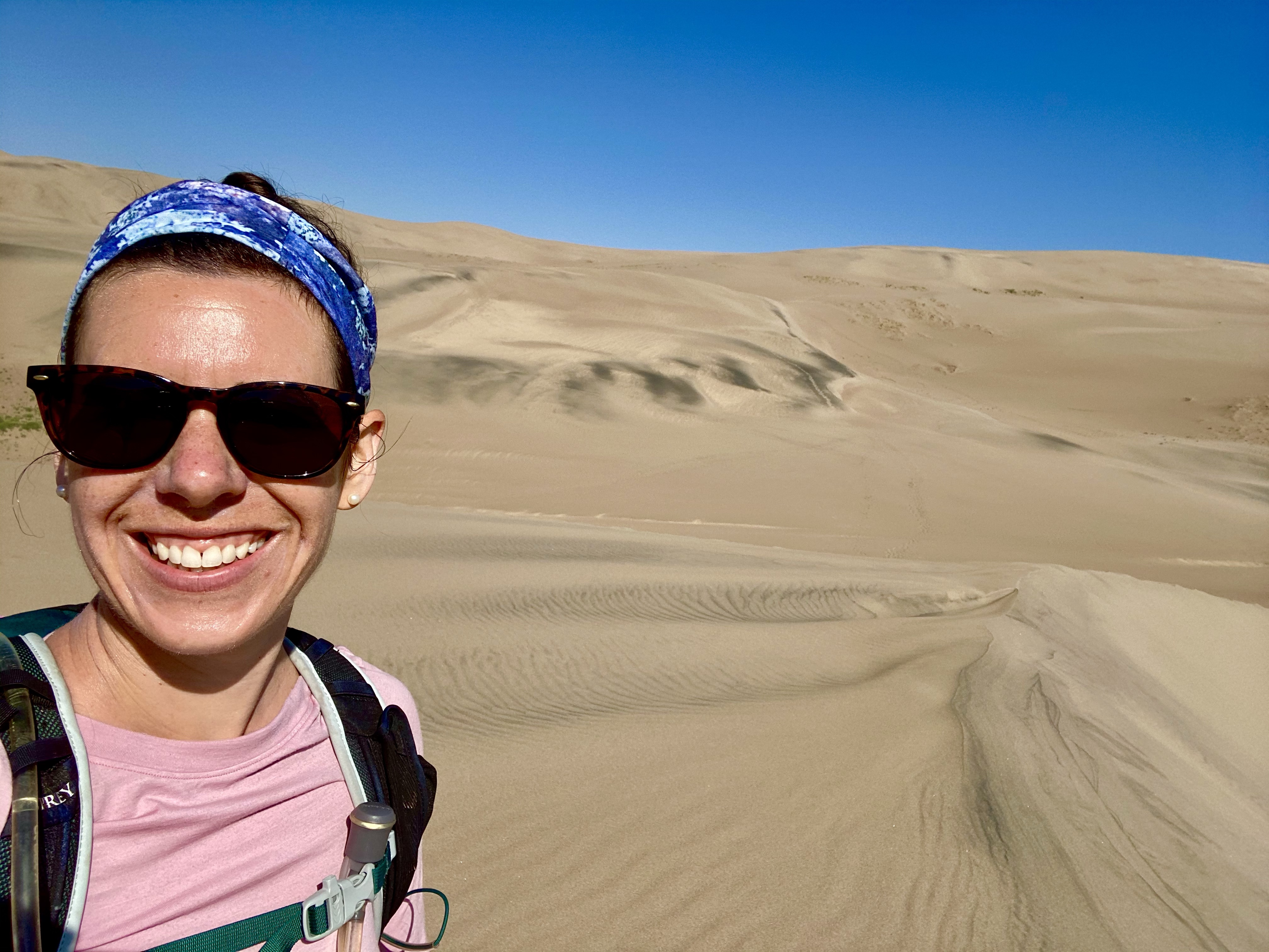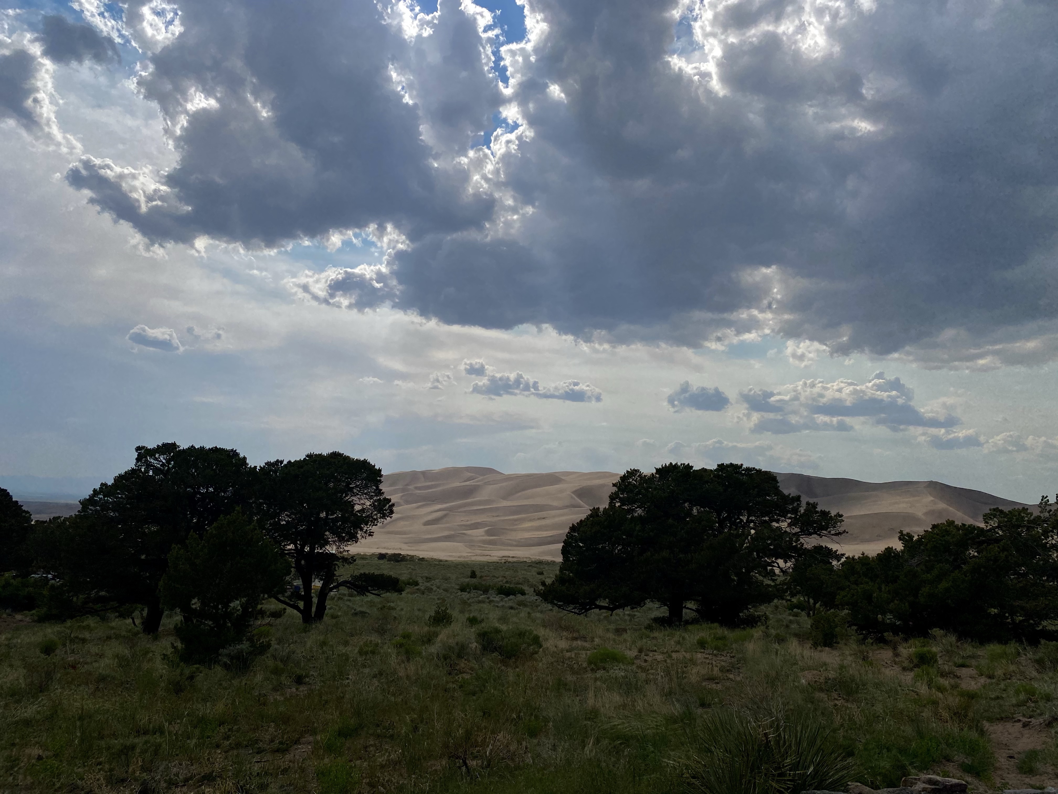 So Day One was really the following day, a Tuesday. I woke early, did yoga, and headed to the Overlook Trail to see the magnitude of this place. On the way up, I was the only one on the trail. Although the sun was rising, it was still cool and I took my time admiring the flora. At the top, a comfy bench awaited me and I sat down to admire the giant sand dunes abutting the gray pointy mountains. This park is really neat, sand dunes, mountains, forest, streams. Who would have thought?