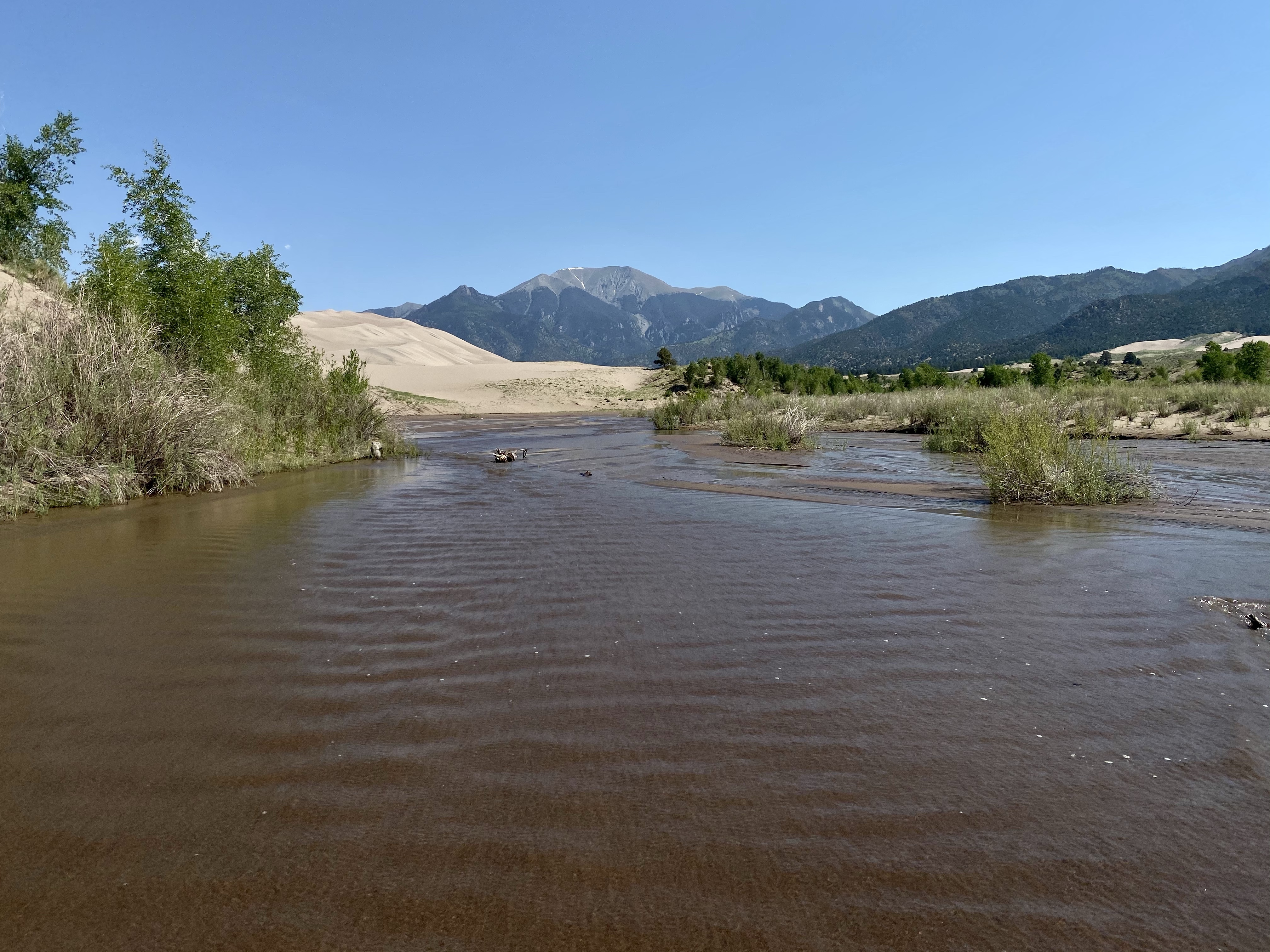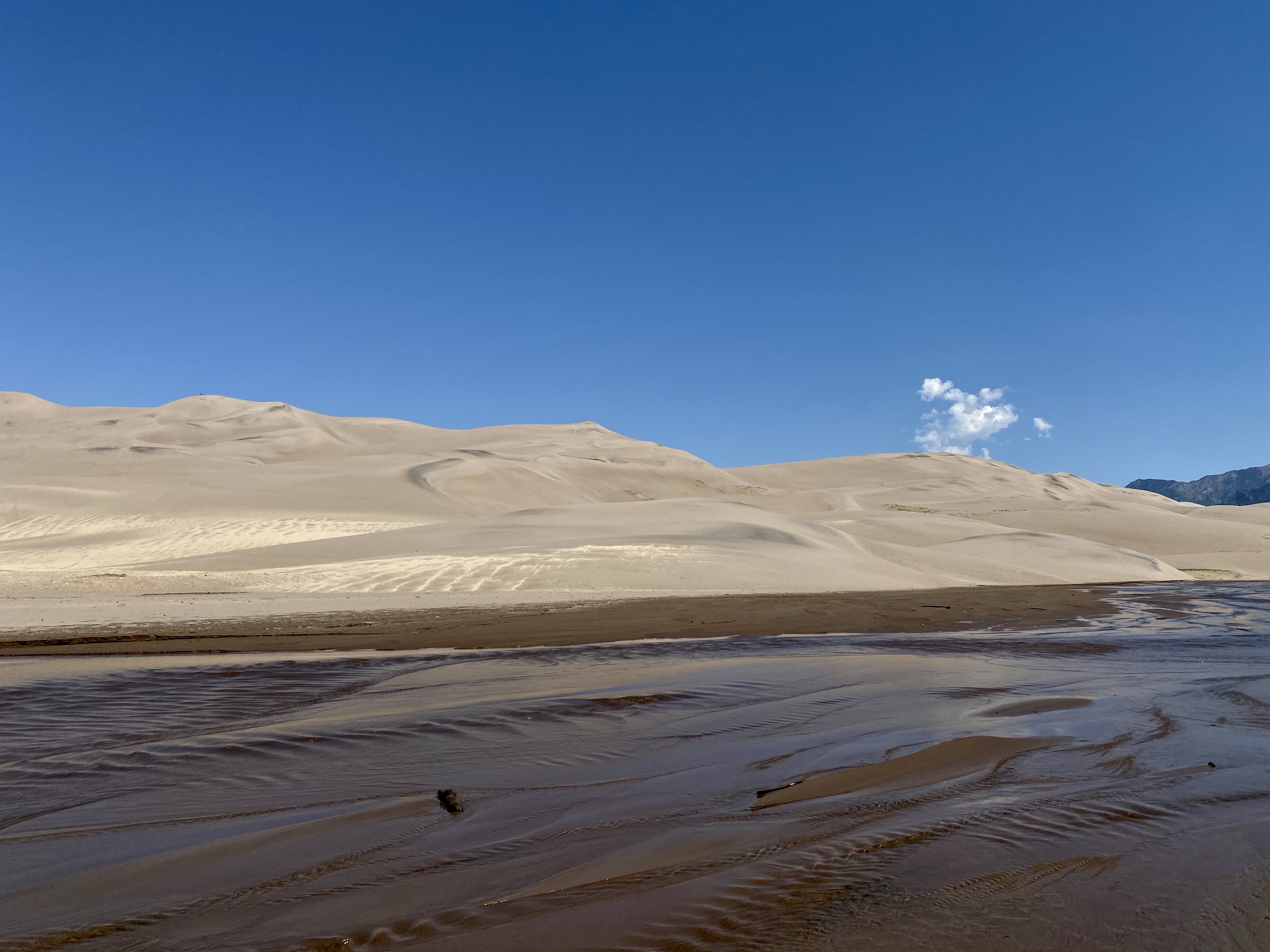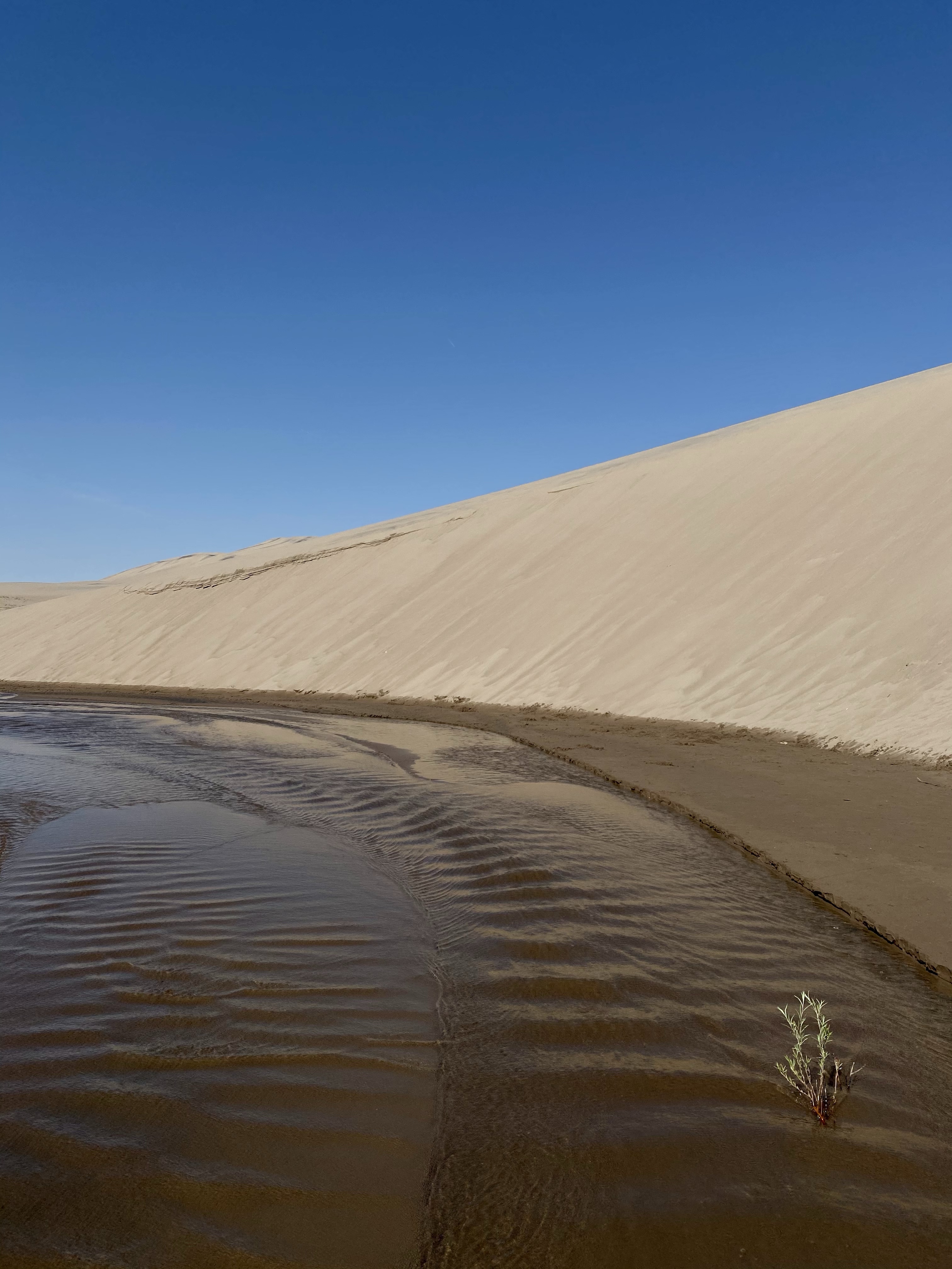 From there I headed to Sand Pit Picnic Area, where I stuck my sandy feet in the cold creek and stared up at the dunes looming on the far side. The water was cold and refreshing, trickling by from the last melting snow up in the mountains. No more than calf deep in places, it was easy to walk around and observe the patterns the changing flow made in the packed sand beneath.