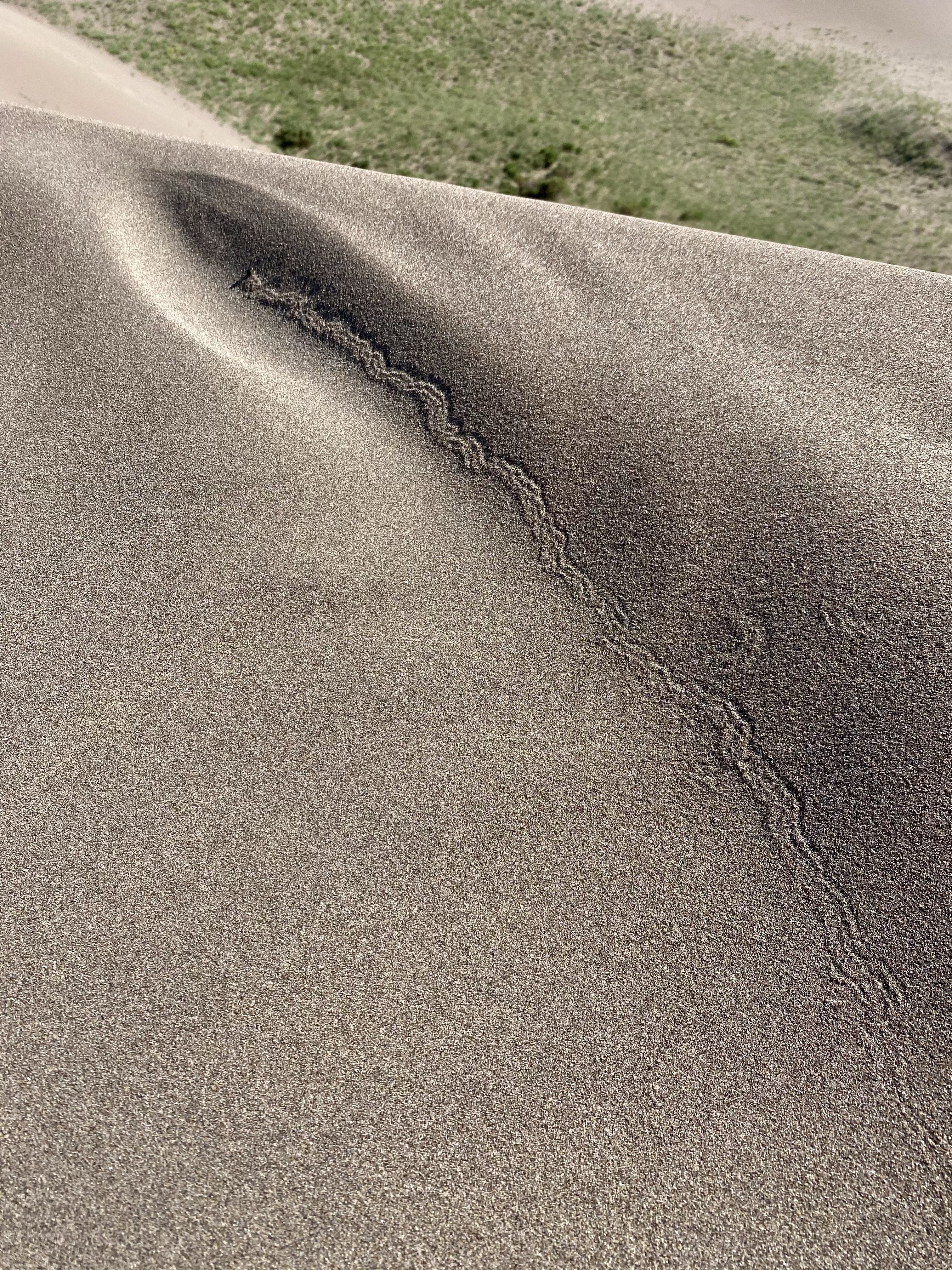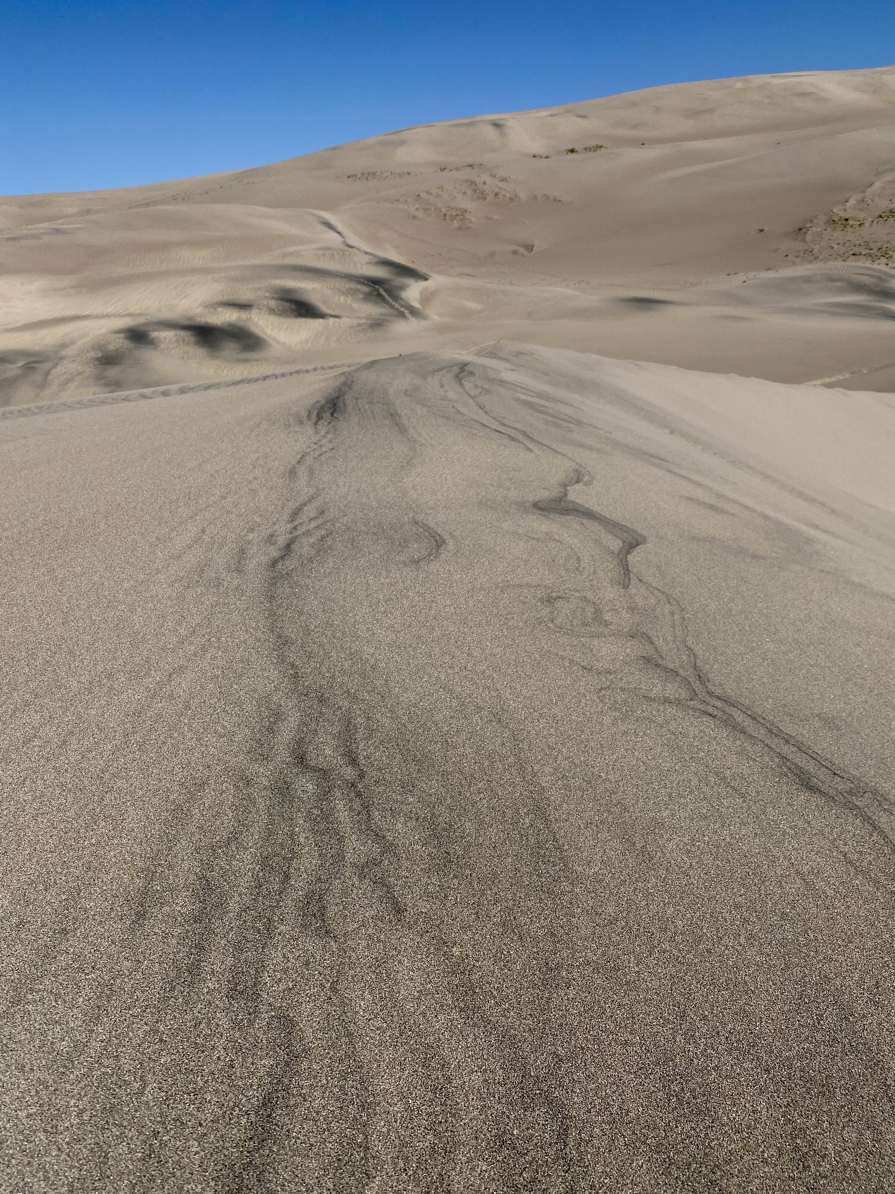 Up on top was magical. Sand glistened in the sun for miles in every direction. While the climb was difficult through loose sand, the top was flat and hard. Wind made ripples in the sand, carrying it from one spot to another. Barely visible footprints from earlier hikers dotted the landscape, showing the playground that the dunes are. You can go anywhere if you have the courage and stamina! Walking around, the gullies and ridges and peaks caught my attention and I played around capturing different angles. Little footprints of bugs and animals who were now hidden away were spotted. Waves of black sand swirled through the landscape. Nature’s canvas.