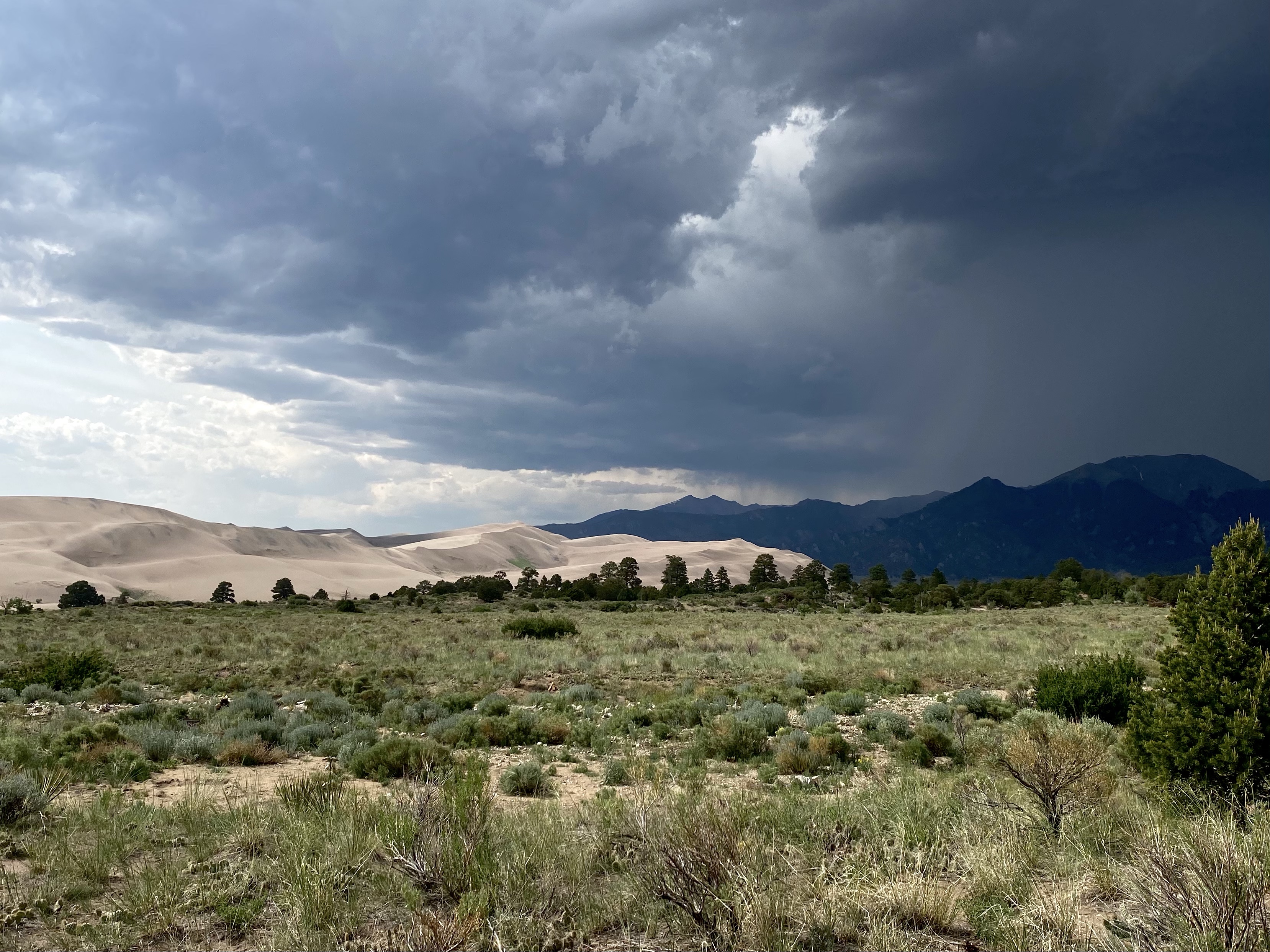 As the evening arrived, storm clouds and thunder rolled over the dunes, but no rain ever appeared. The clouds created interesting shadows on the sand, and providing a spectacular dark sky above. I admired from inside the safety of my van until they had floated by. Then I headed to bed, an early night so I could get a good rest to climb those sand hills in the morning!