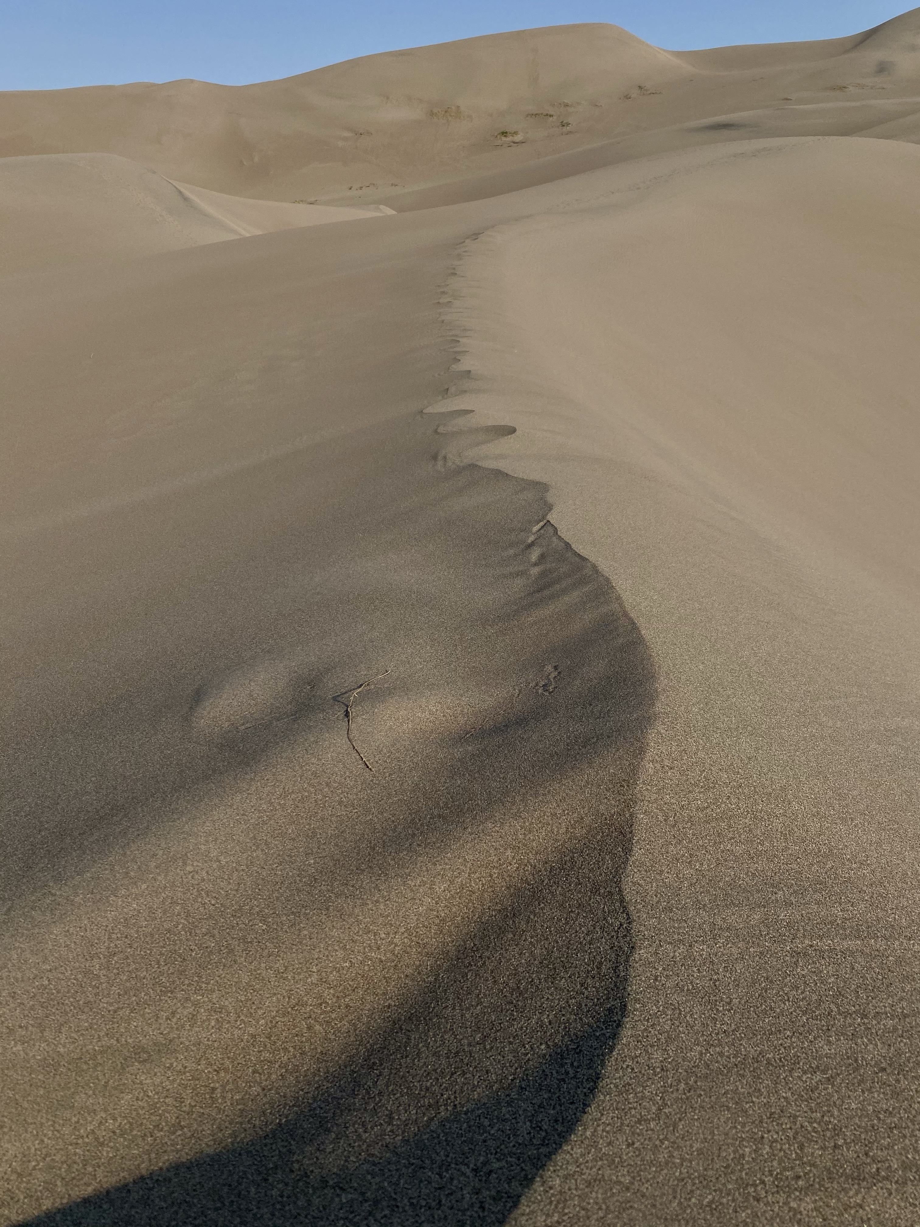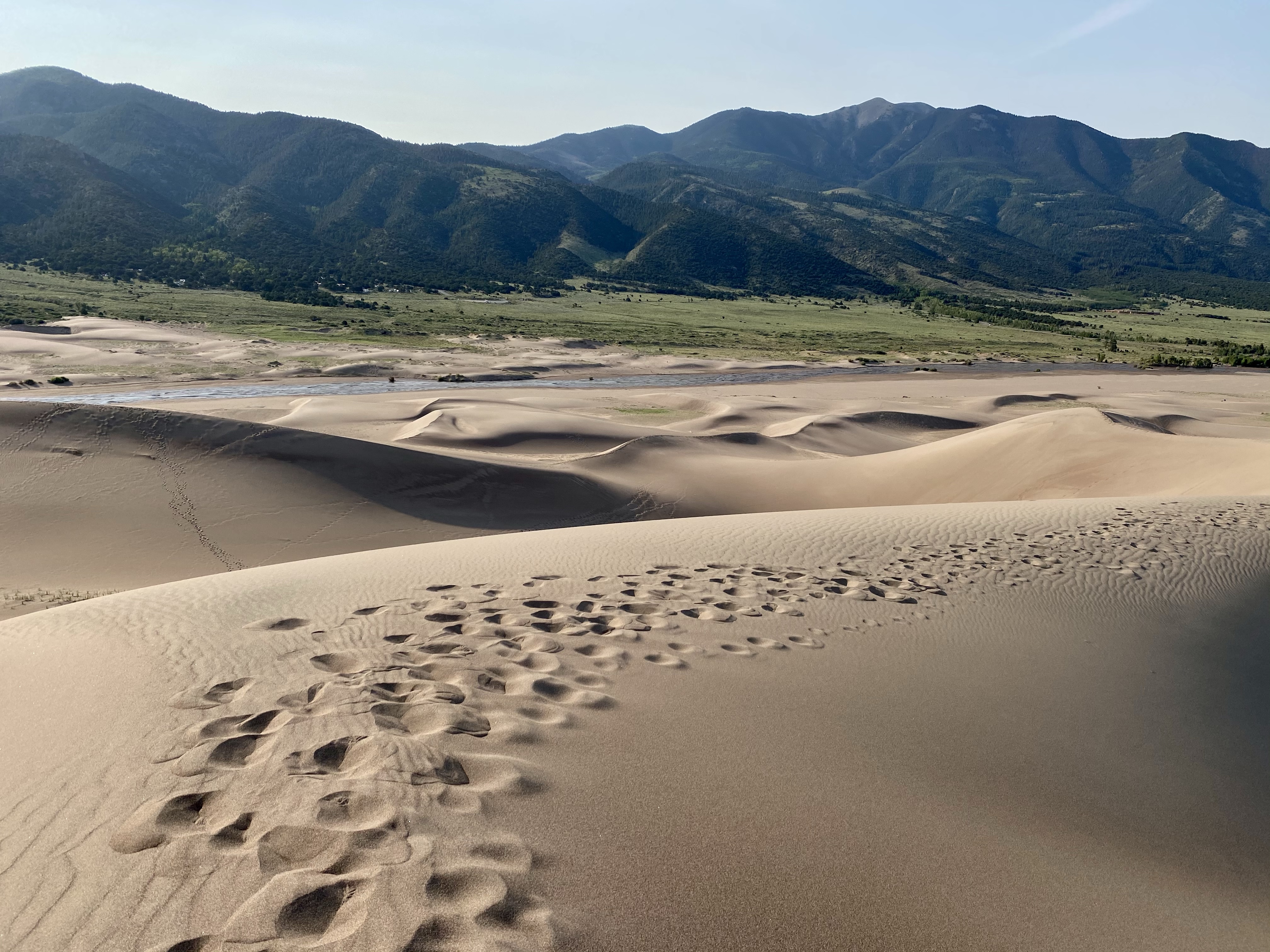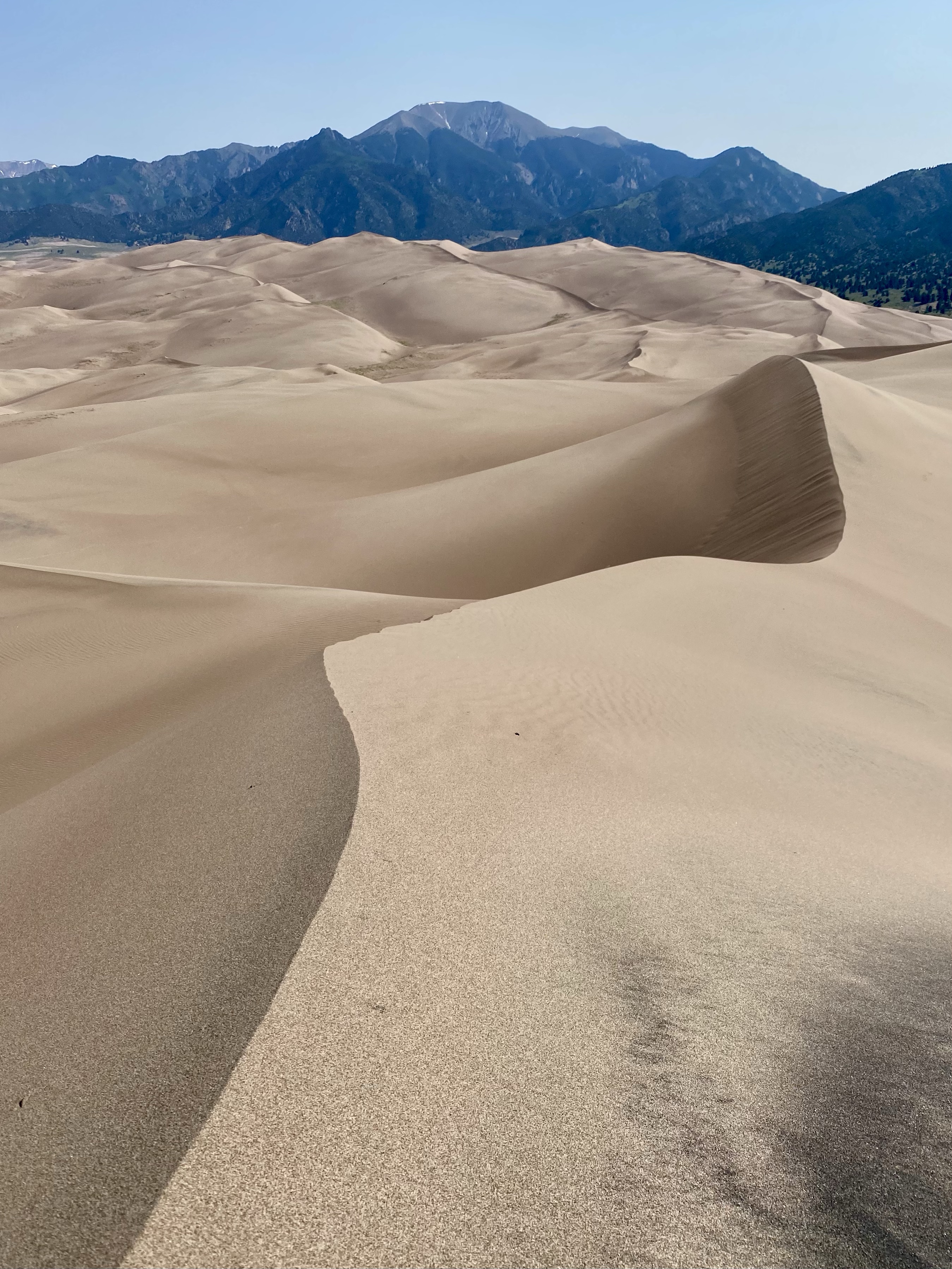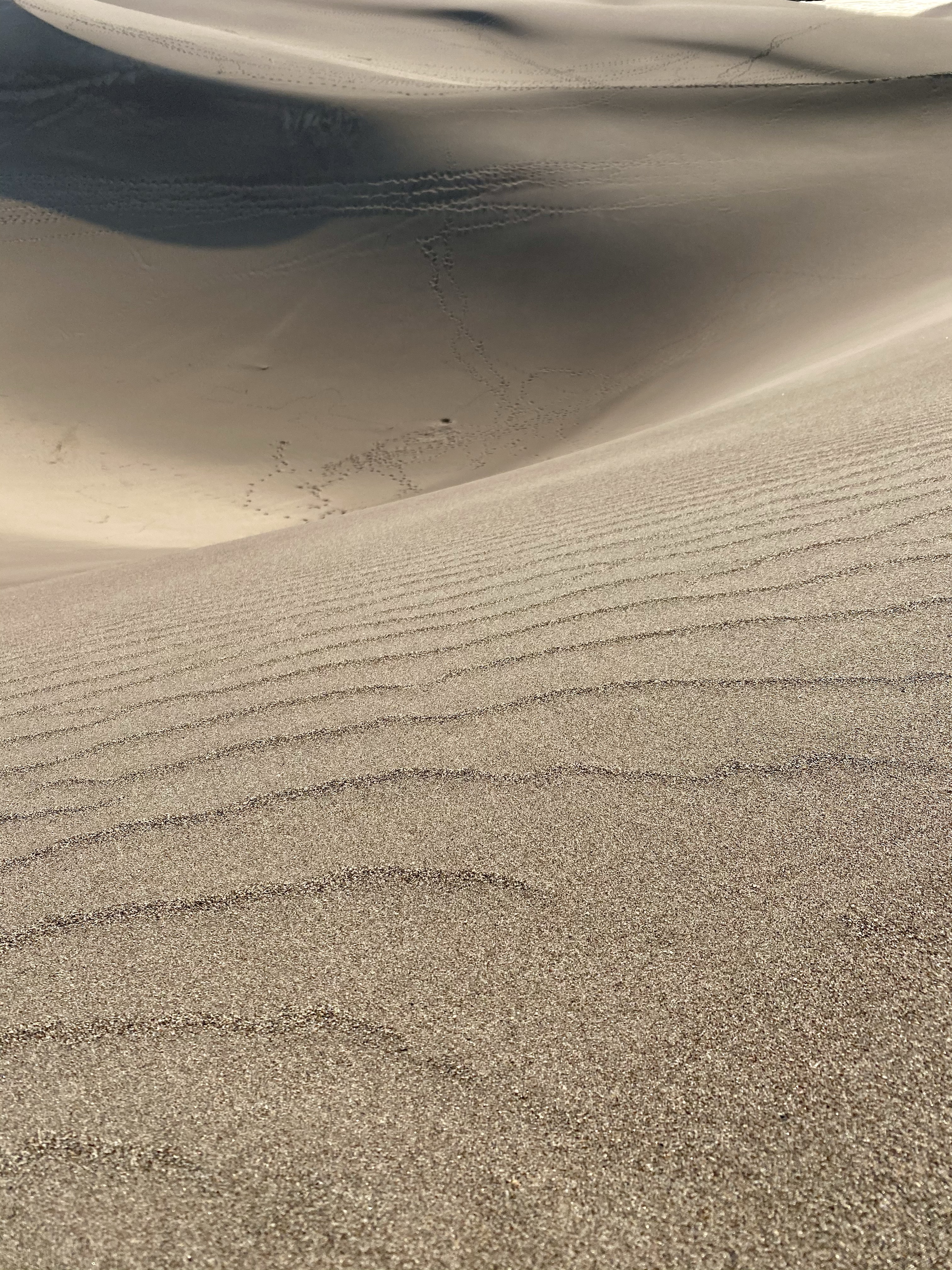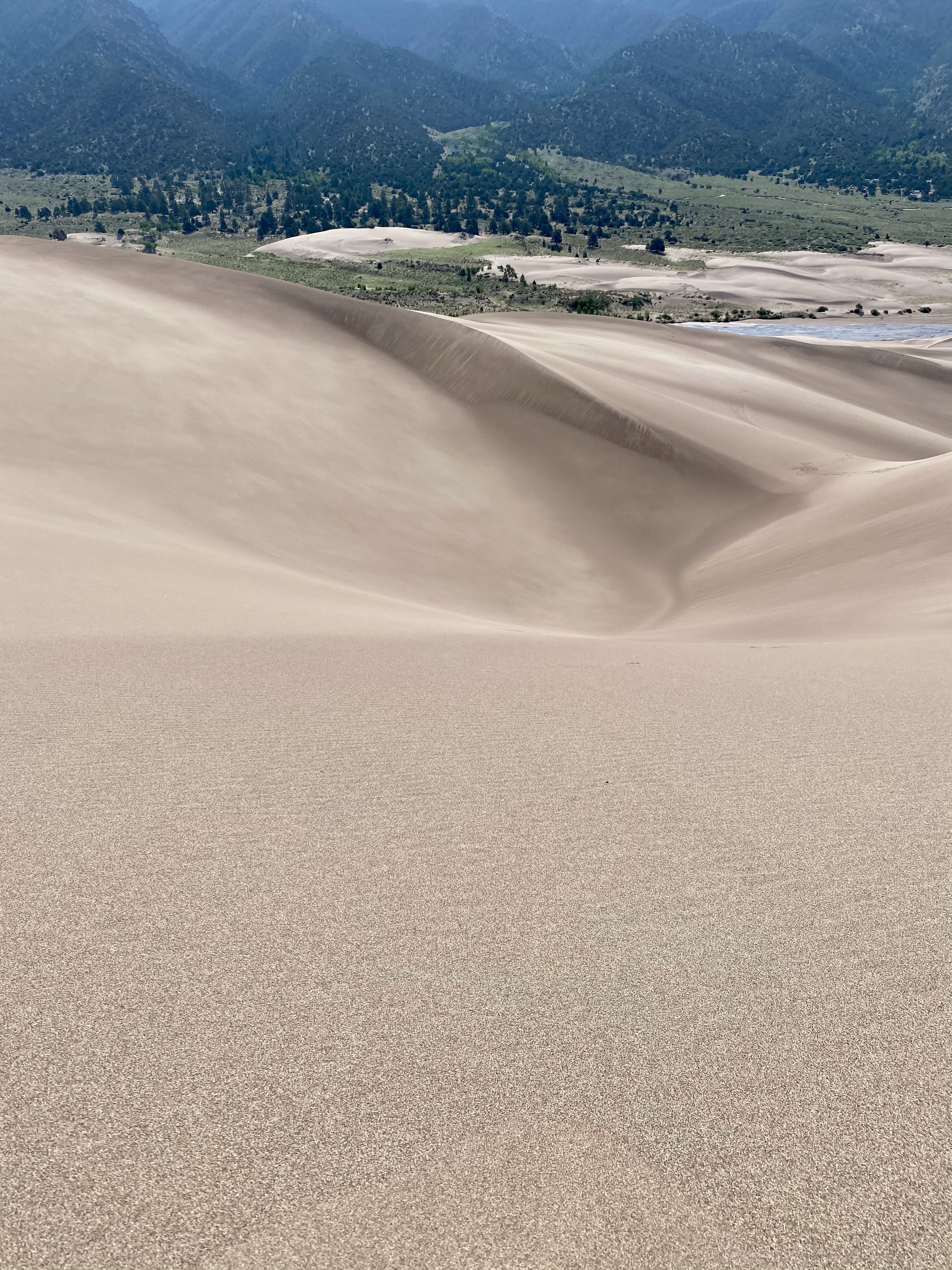 And finally, after one more push, I was there, at the very peak, high above the the creek. Two fellow climbers were already nearby, but I was alone at my vista and sat down to catch my breath and soak on the views. Looking out into the dune field, more sand rose and fell towards the mountains and towards the meadow. Waves of sand in every direction. There was a gently breeze, the sun at my back, and I rested. It was marvelous, a landscape to explore and get lost in.