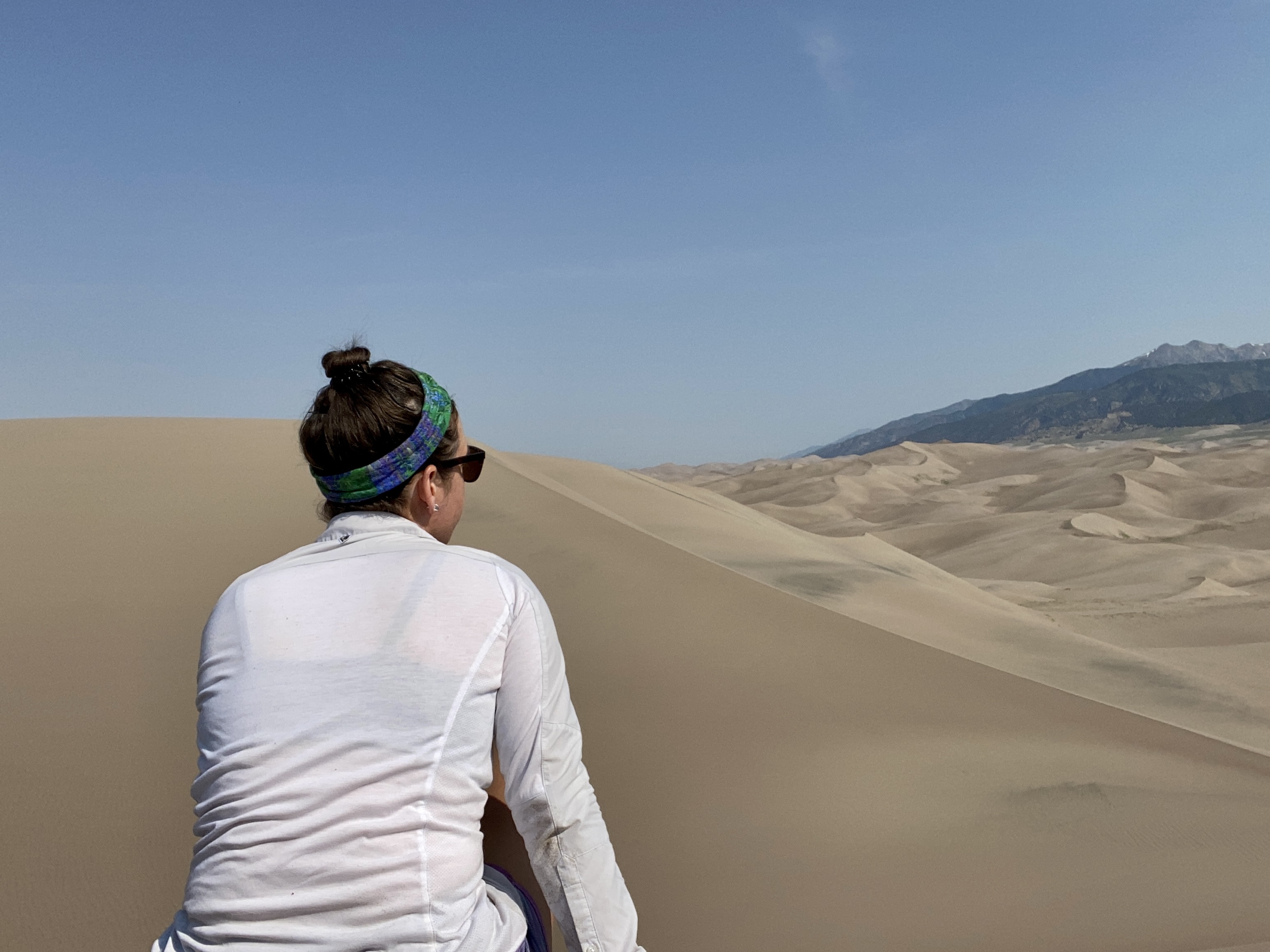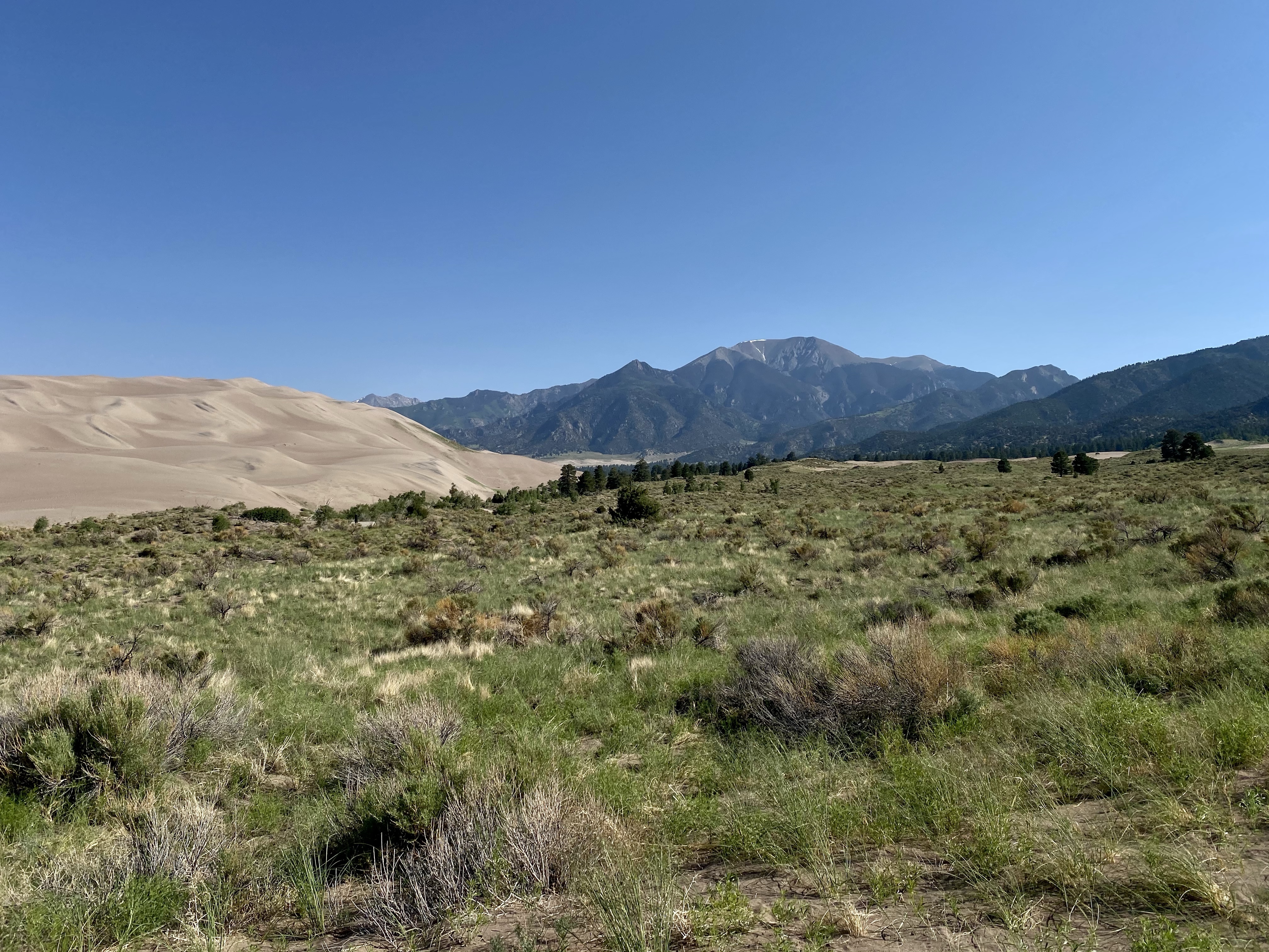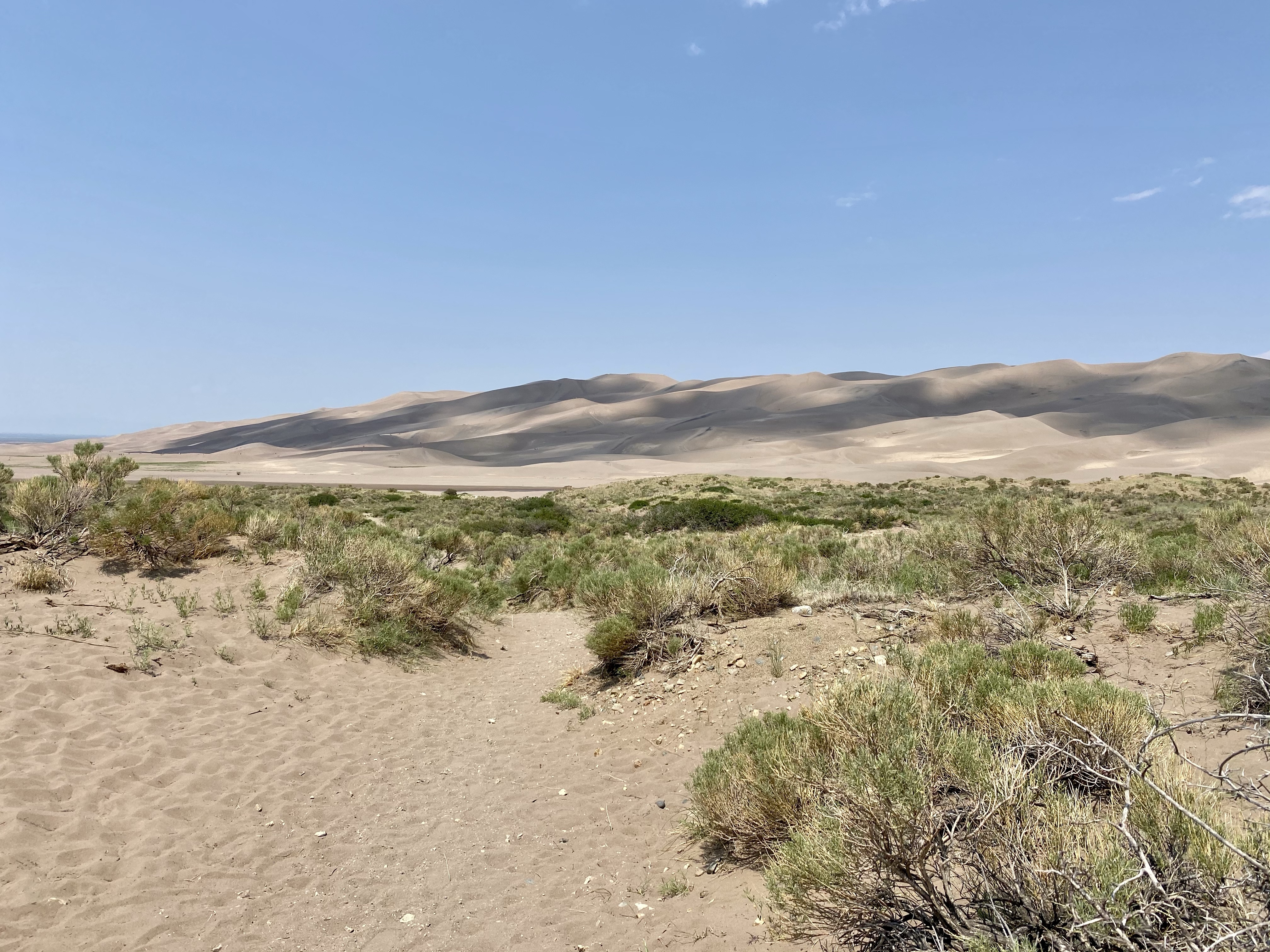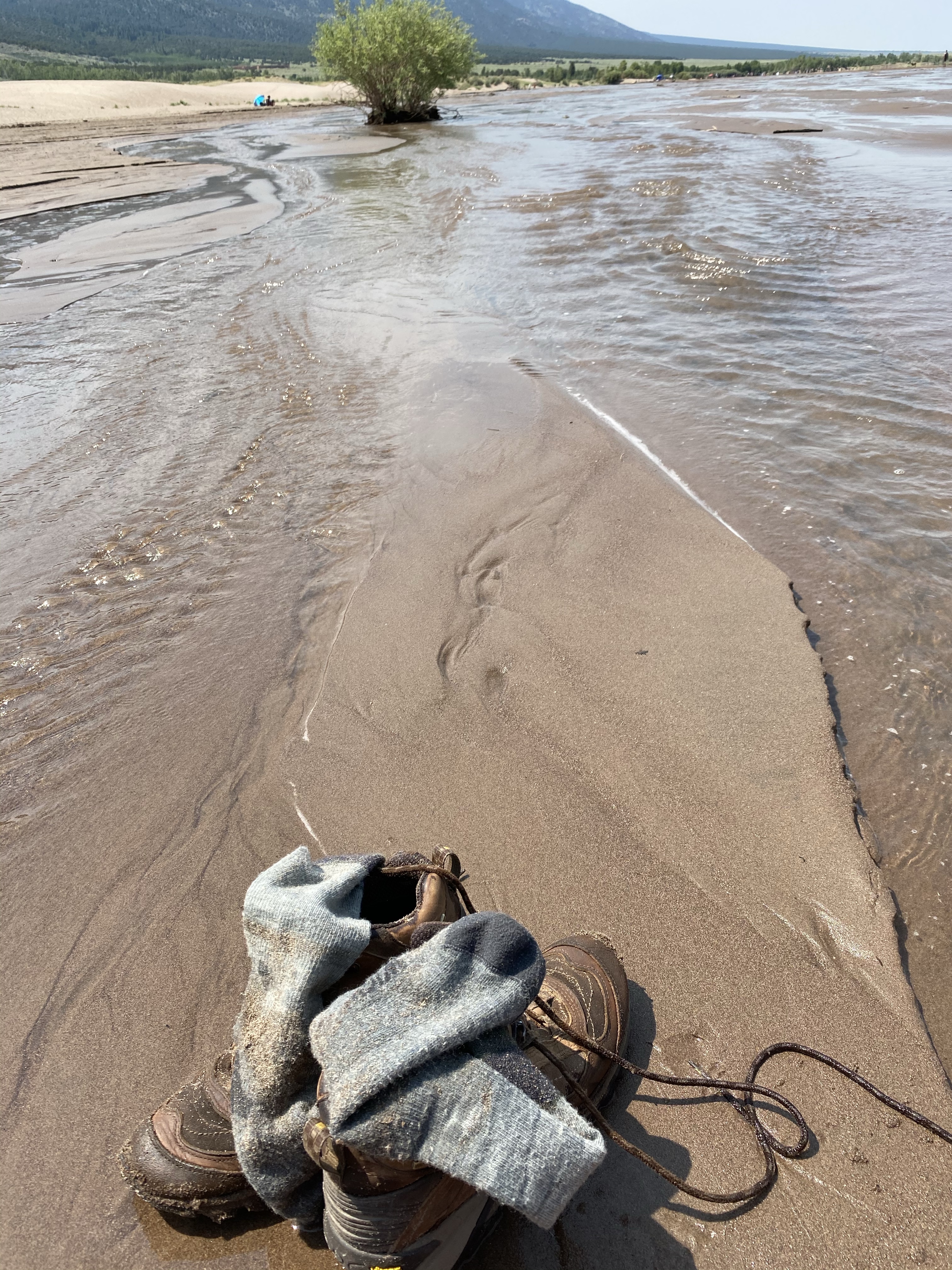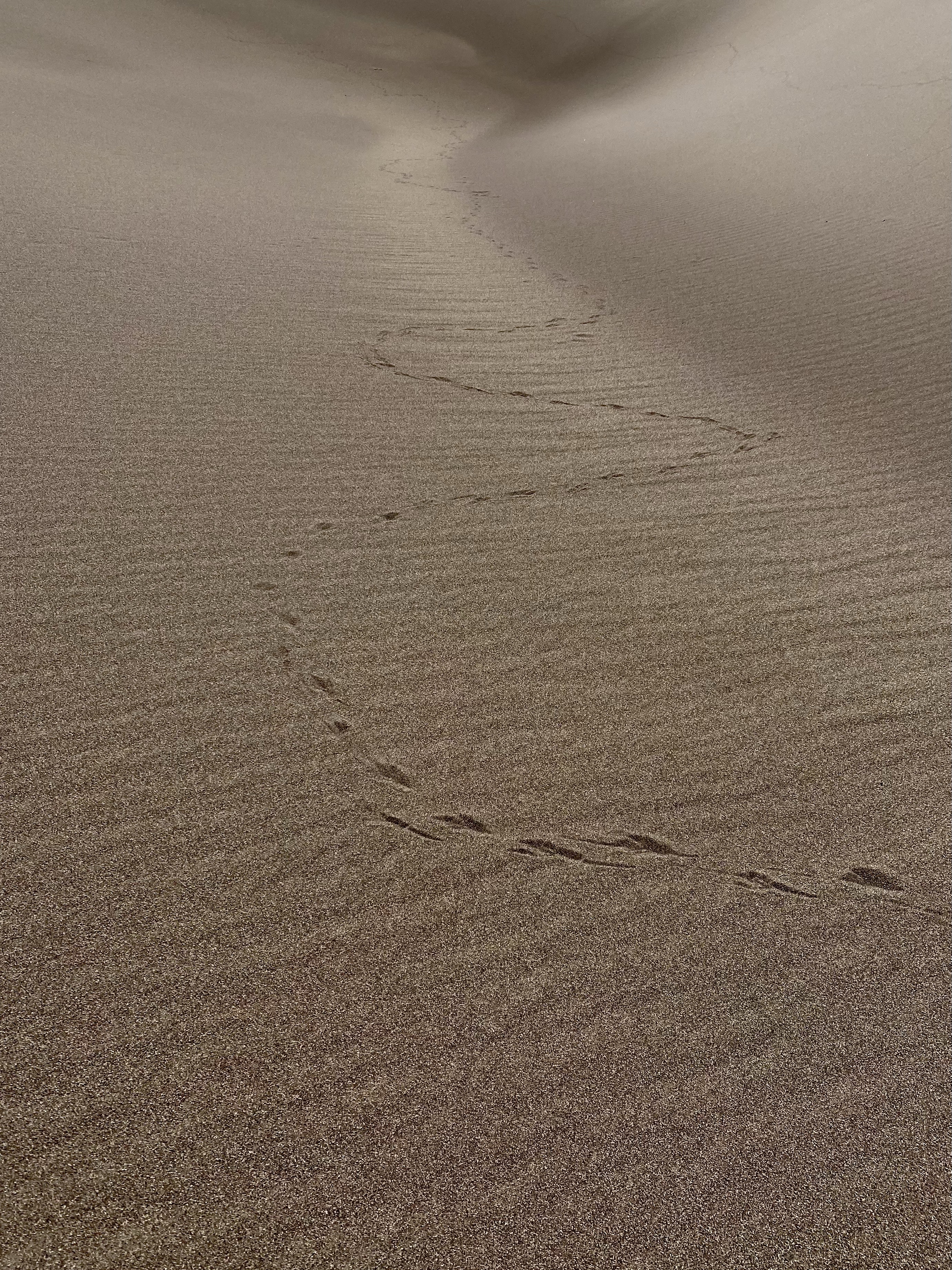 And finally, after one more push, I was there, at the very peak, high above the the creek. Two fellow climbers were already nearby, but I was alone at my vista and sat down to catch my breath and soak on the views. Looking out into the dune field, more sand rose and fell towards the mountains and towards the meadow. Waves of sand in every direction. There was a gently breeze, the sun at my back, and I rested. It was marvelous, a landscape to explore and get lost in.