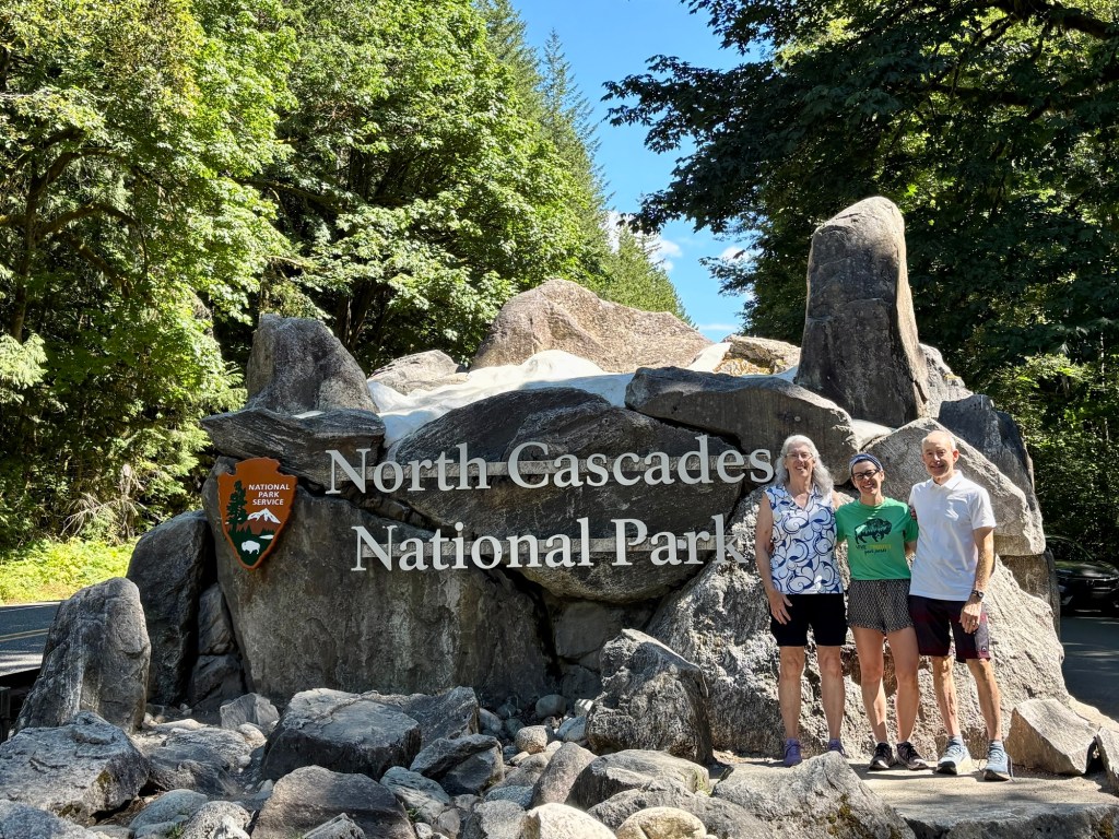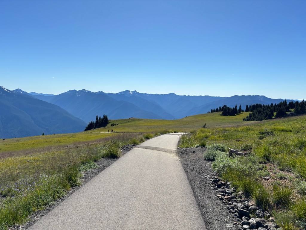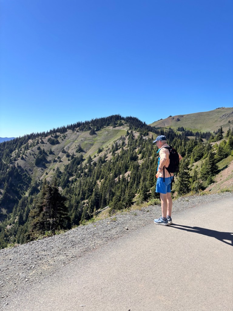 Before dinner, we headed farther into the park to experience Hurricane Ridge as we were only here for one night.  Sunny and I navigated the windy, climbing path many miles into the heart of the park. The three of us then started the climb on our feet up Hurricane Hill. It was labeled as a 1.6 mile paved path which made it sound easy, but easy it was not! The hill was a steady climb up along the edge of the mountain and then across switchbacks. The views were tremendous, green mountains in every direction. Thank goodness for that, or I might have turned around!