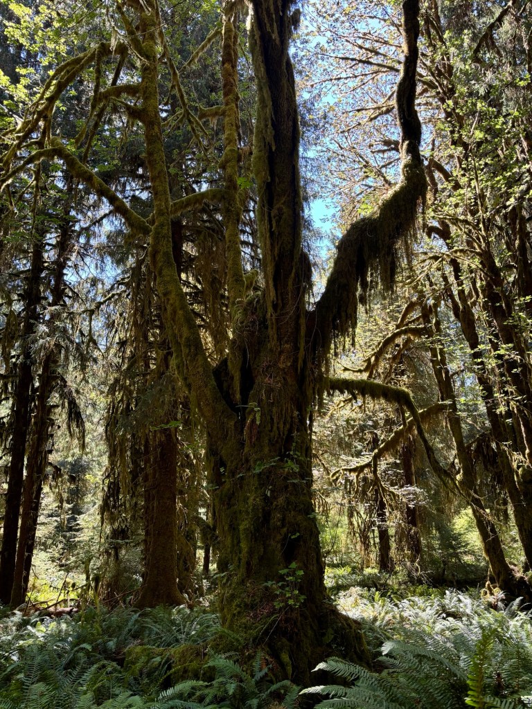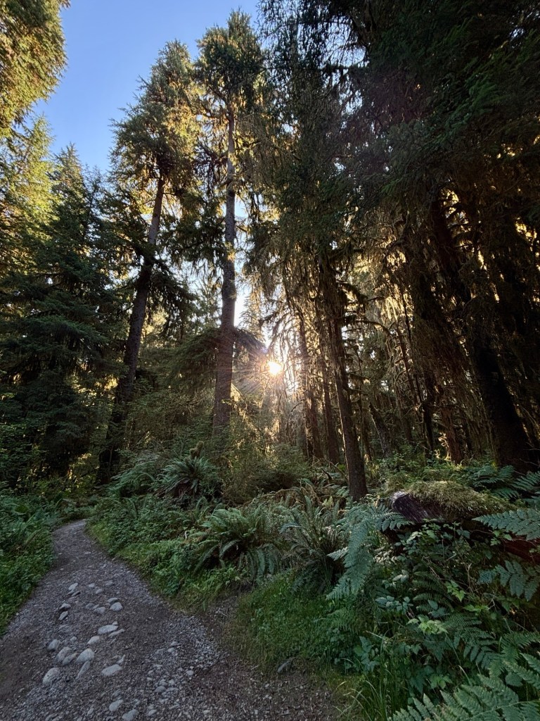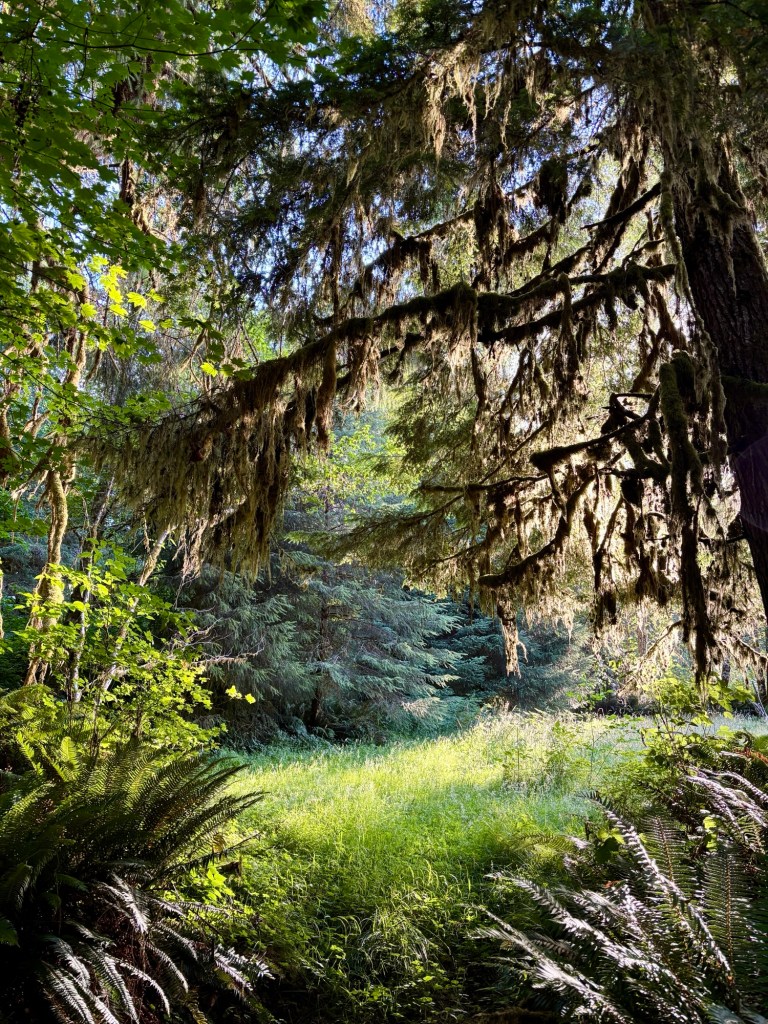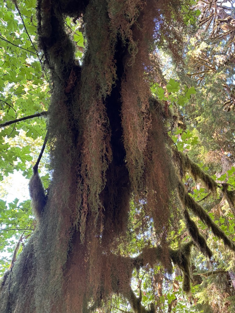 Similar to Sol Duc, tall trees rose around us, stretching for the sunlight. Moss hung from their branches like ribbons cascading down. It danced in the breeze and gentle light glimmering through the canopy.