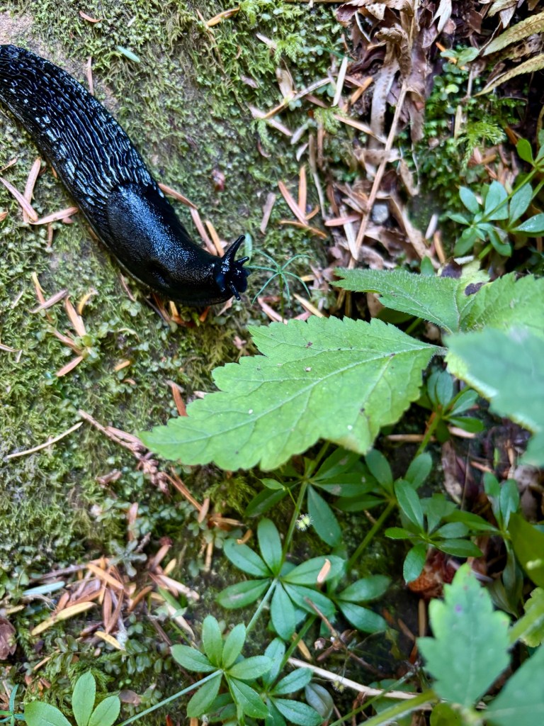 We meandered slowly, looking high and low. Down on the forest floor I found licorice slugs. Black and shiny, stretching at least four inches long, they slowing glided along the rocks and logs in search of a yummy treat. Their tiny antennas reached long to feel which way to go.