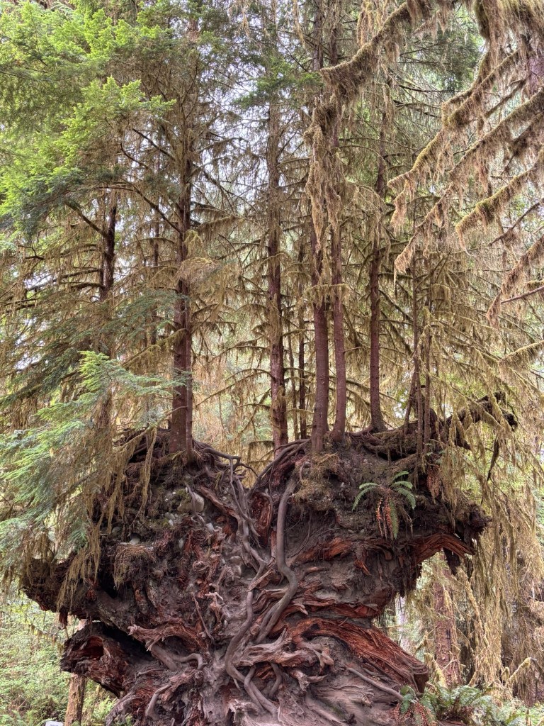 The ranger at the visitor center also taught us how to identify the trees. Sitka Spruce are spiky. You’ll say, “Ouch!” when you try to grab once. Hemlock are droopy with delicate needles. Each of these trees make up 49% of the conifers in the park. The remaining 1-2% are Douglas -firs, not a true fir but it is “friendly”, meaning you could shake its branches happily. They are such a small population because they need sunlight to grow and today not much light reaches the floor of the ancient forest. Big Leaf Maples and Adlers are the deciduous trees. Adlers’ leaves never change color but drop green. These trees are special because they help convert the nitrogen with a special fungus in their roots. Trees are neat.