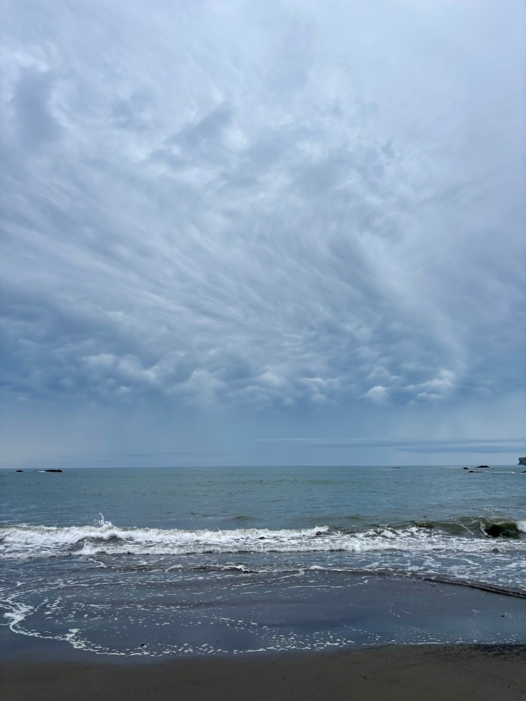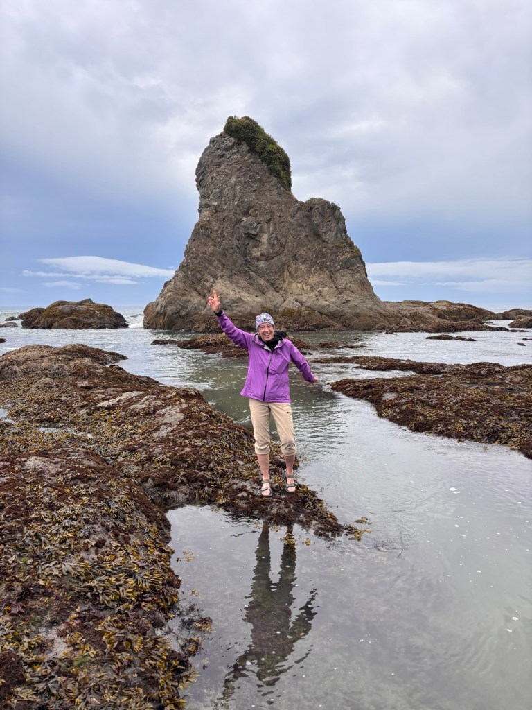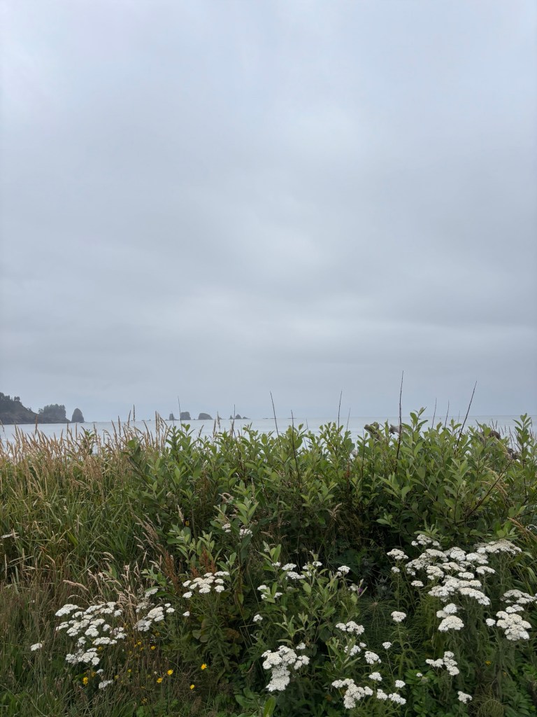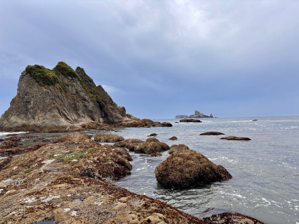 When we reached the forest edge, we had a long, steep climb down to the ocean. One step at a time, we made it, the salty air beckoning us forward. A moody day, the gray skies gave attitude to the ocean that slowly lapped at the beach as the tide moved back in. It was still out far enough though that we could see the enormous sea stacks climbing out of the ocean and explore the tide pools.
