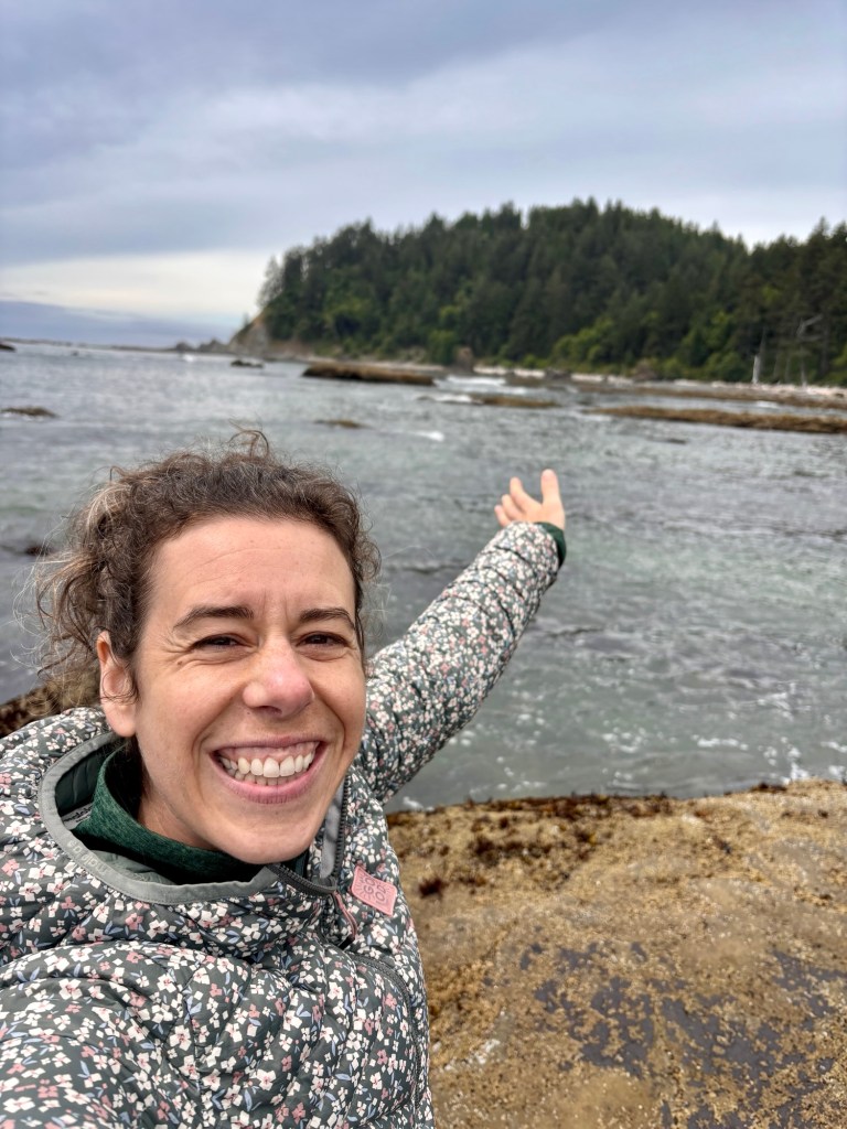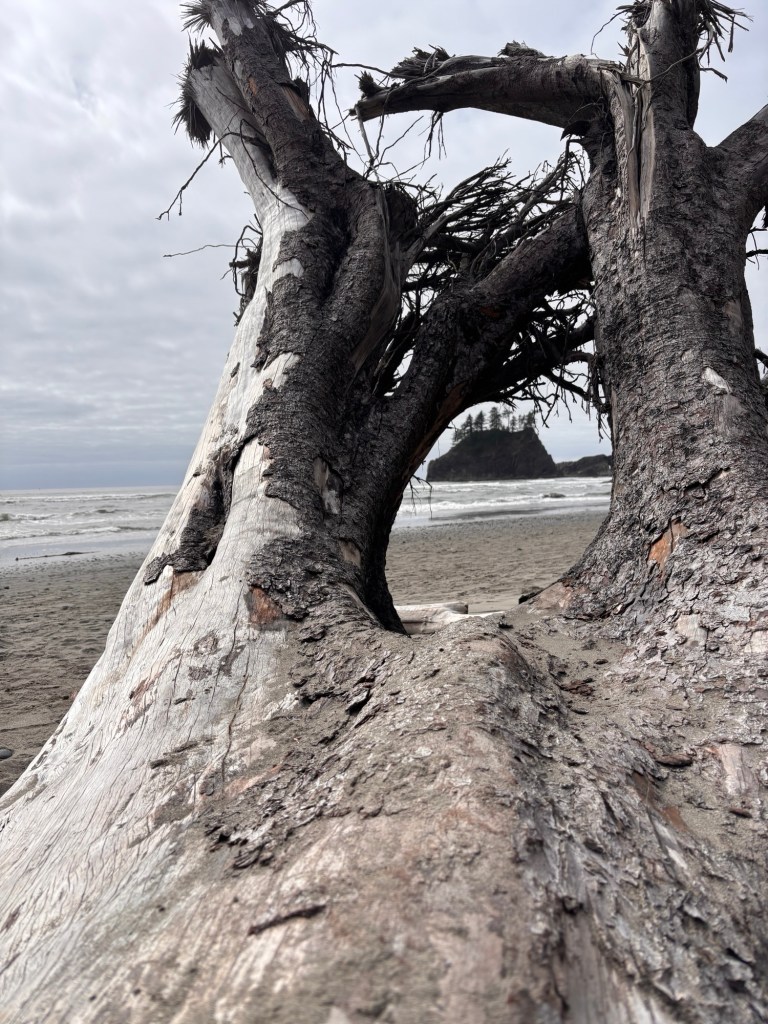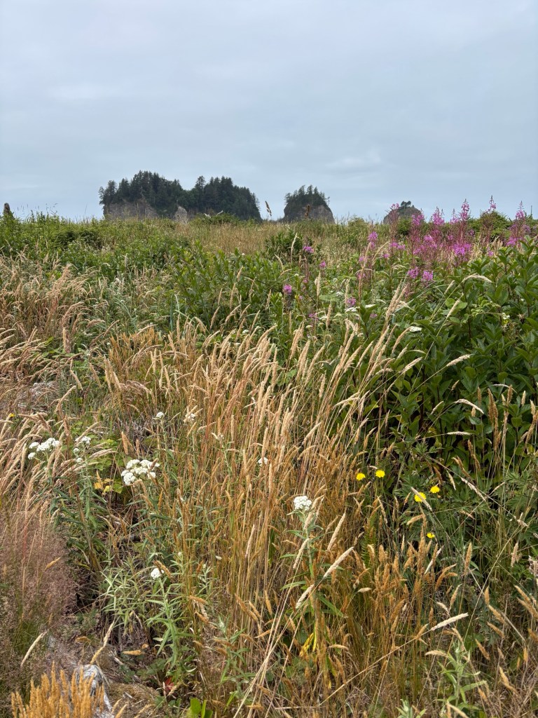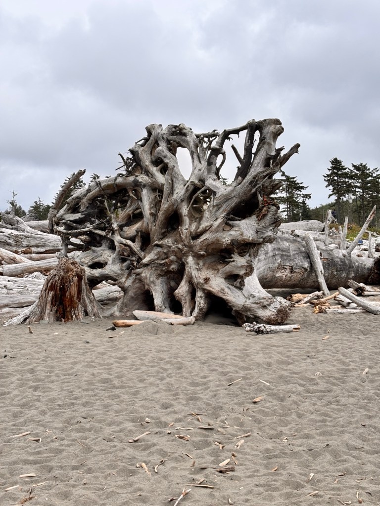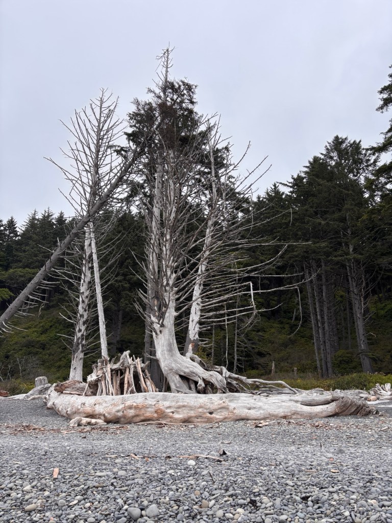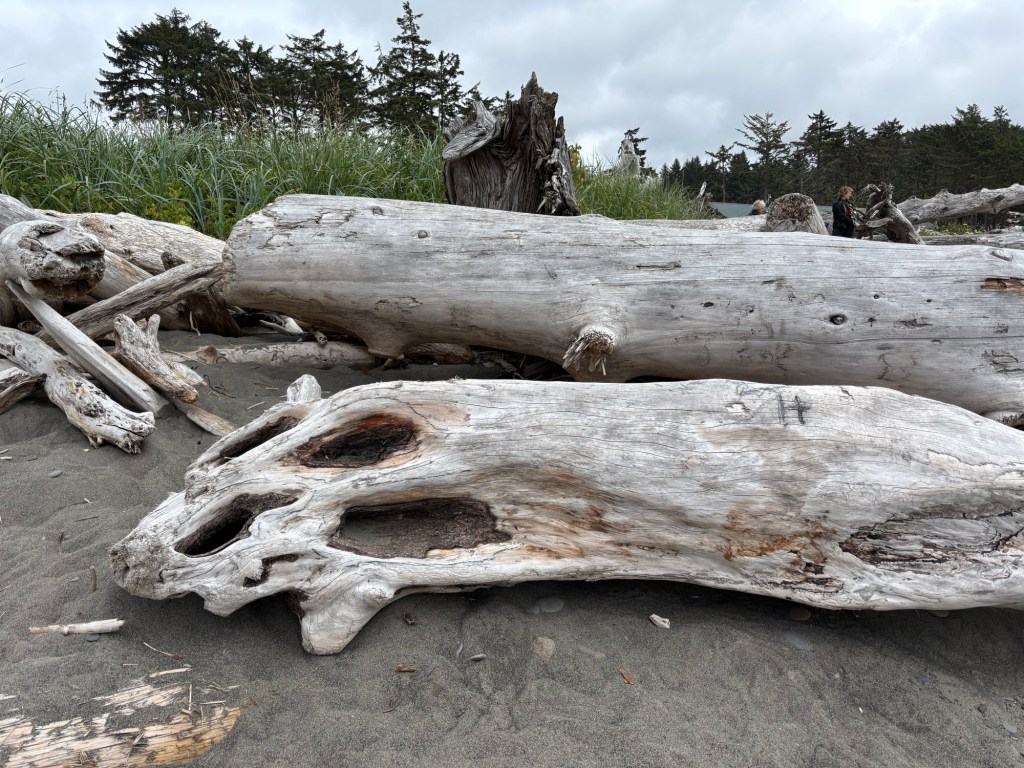 Our first day we went to La Push, the reservation of the Quileute tribe. After navigating confusion about checking in and parking, we walked downtown to the Quileute Days festivities. A medley of events – parade, motorized canoe races, softball games – we missed most of the events but were able to walk along Main Street to see the vendors. There were Rez tacos, burgers, and fruit salad for sale. Full body sleeping suits, ribbon skirts, handmade jewelry, and native patterned clothing. The street was bustling, a mix of tourists like ourselves and indigenous people. The ocean is important to many Coastal Salish tribes, so it was fitting that the celebration was right on the water.