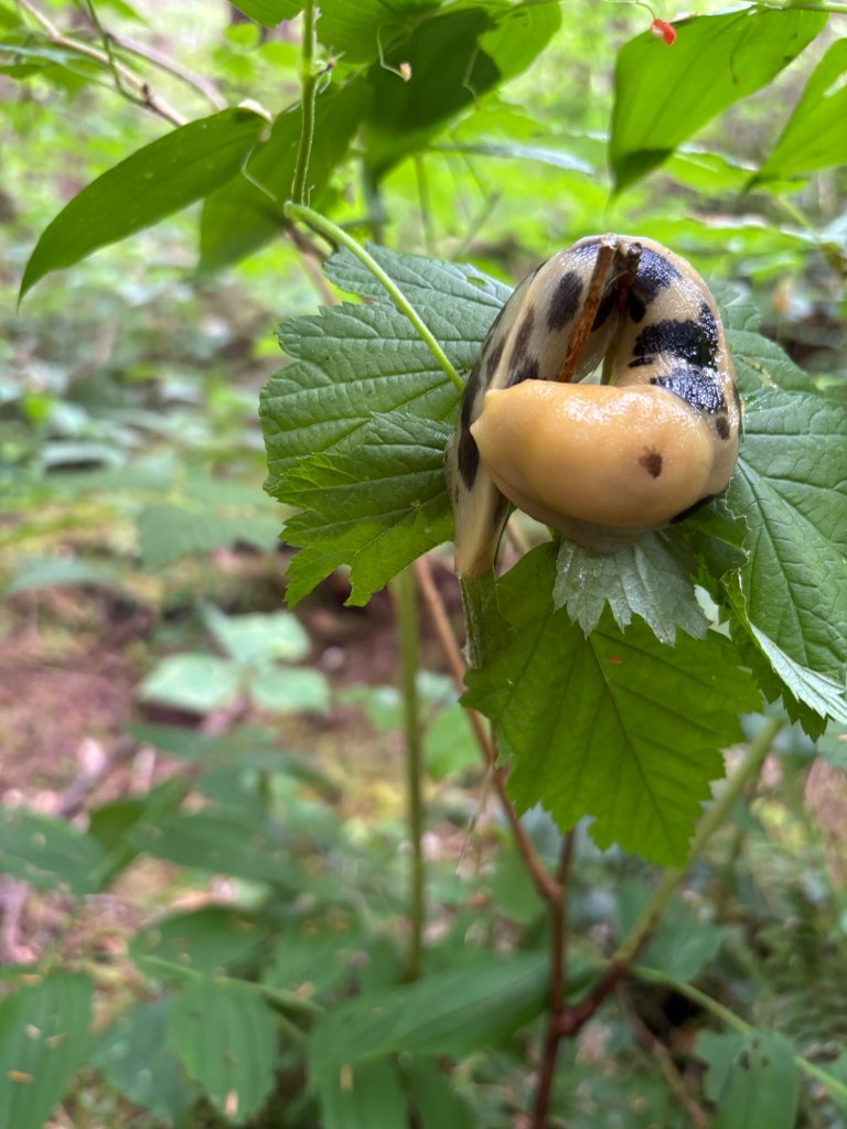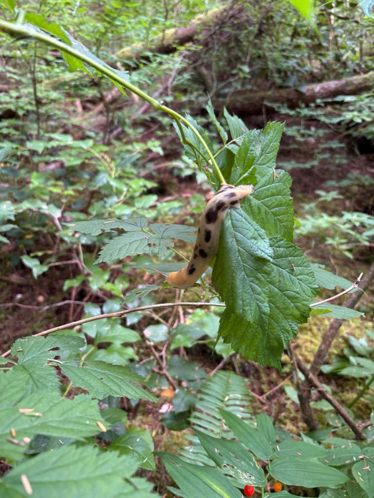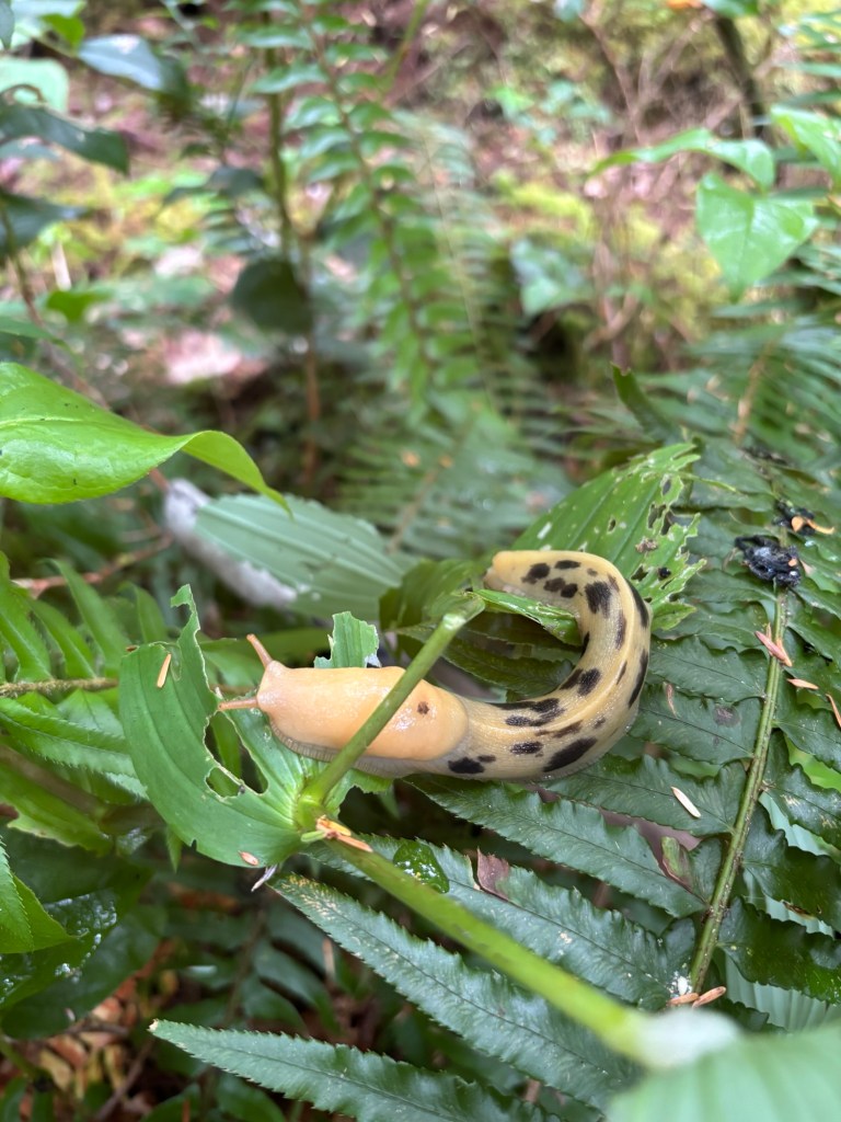 Later that afternoon, after checking into our campground, we took ourselves to Second Beach. As we walked through the forest to reach the water, I overheard a mother and two children talking with excitement about something yellow. A Banana Slug, I wondered? I stopped to ask them and sure enough they had spied a spotted one in a bush up ahead! With excitement we took off, searching about 20 feet ahead as the woman said. My mom and I looked and looked and turned disappointed the further we went. Maybe it just wasn’t our day. But I wasn’t ready to give up and much, much further along I spied not one, but two happily munching on some leaves! They looked like very happy, ripe bananas. On our way out later, we were able to show my dad too.