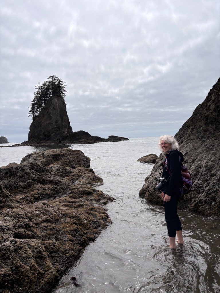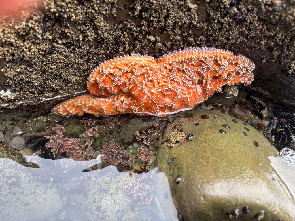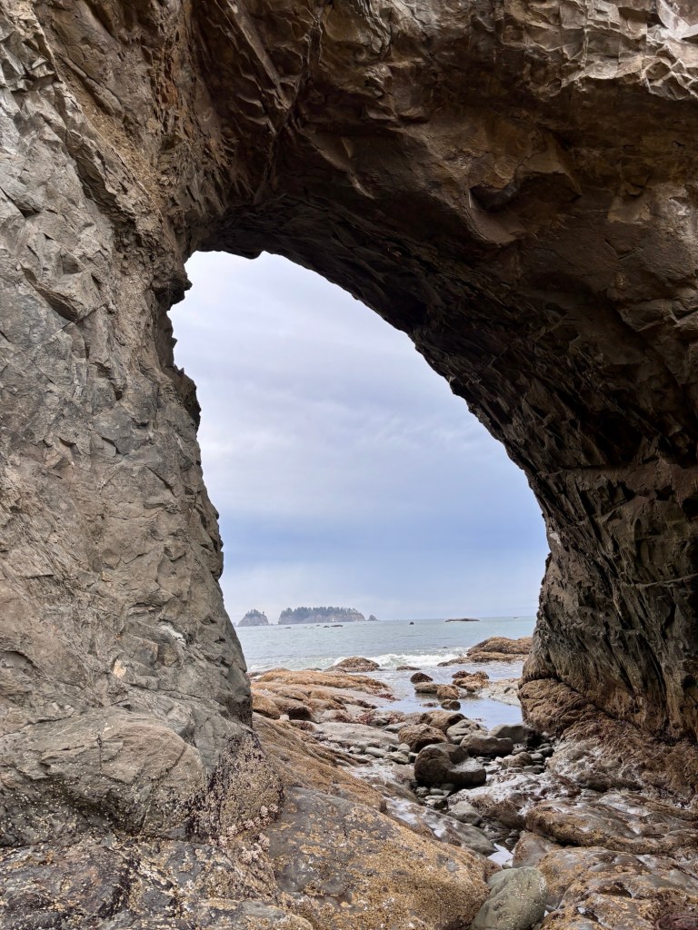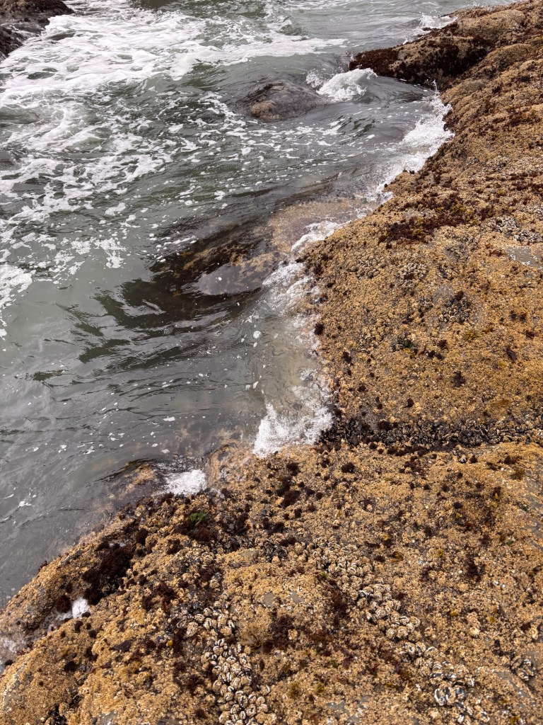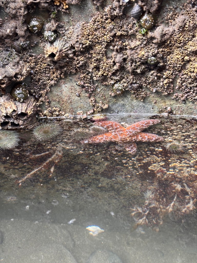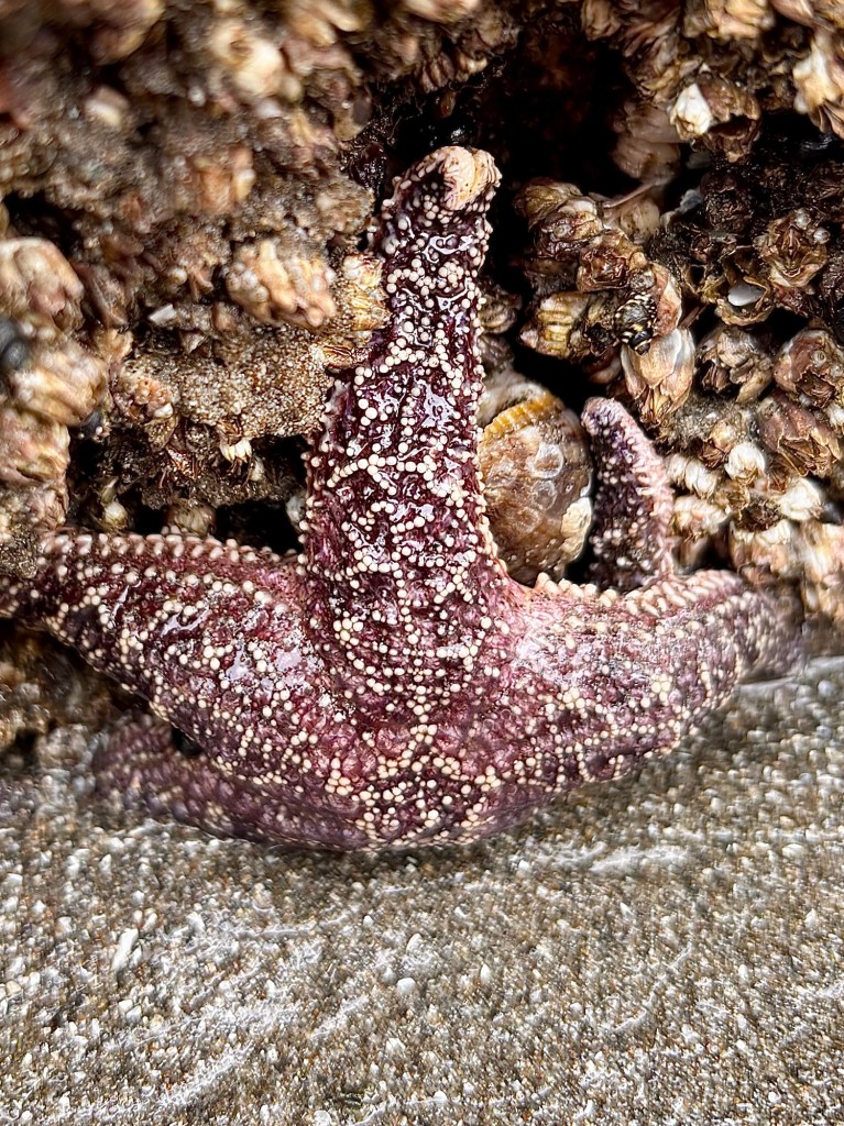 We arrived at the spot as the tide was rescinding, giving us a chance to explore. I changed into my sandals so I could go whenever I wanted, stashed my bag among the driftwood, and headed across the rocking poking out of the ocean towards the hole in the wall of the sea stack. As we were approaching, I spotted a huge starfish and bent down to capture a picture. I got a little too excited and plop! Into the water went my phone! I reacted quickly and luckily it seems no harm was done. Phew! This phone has been through a lot on this trip. I did get a picture of that starfish, in case you were wondering.