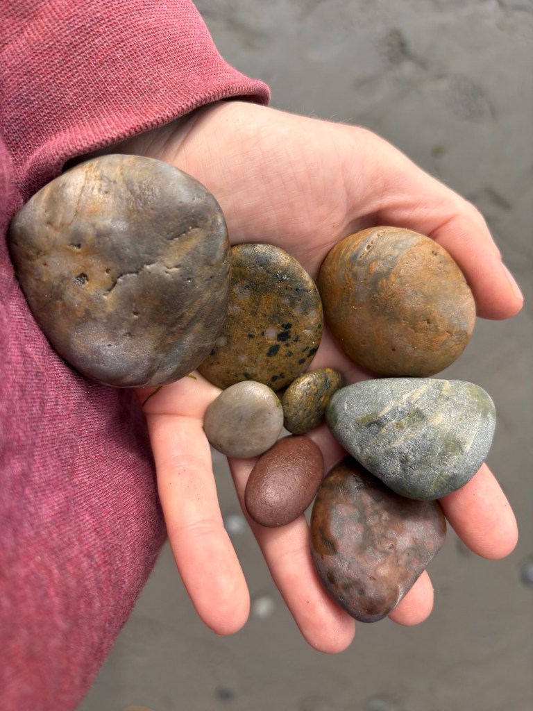 The rest of our trek back my mom and I hunted for more rocks as my dad hustled back for warmth in the van. Our feet were very sandy and we tried to wash them off in the creek leading to the beach, but that turned out to be harder than imagined. We kept sinking in! And about ten minutes later, despite trying to stay on the rocks, our feet were sand covered again. Oh well. We certainly had several good laughs.