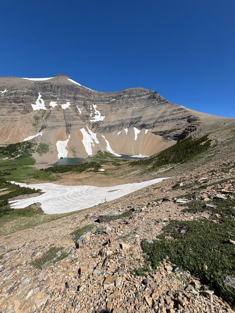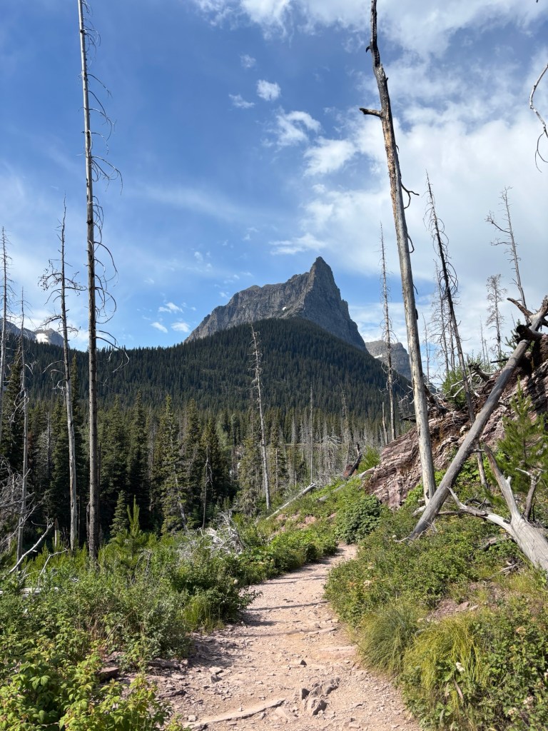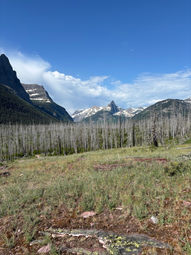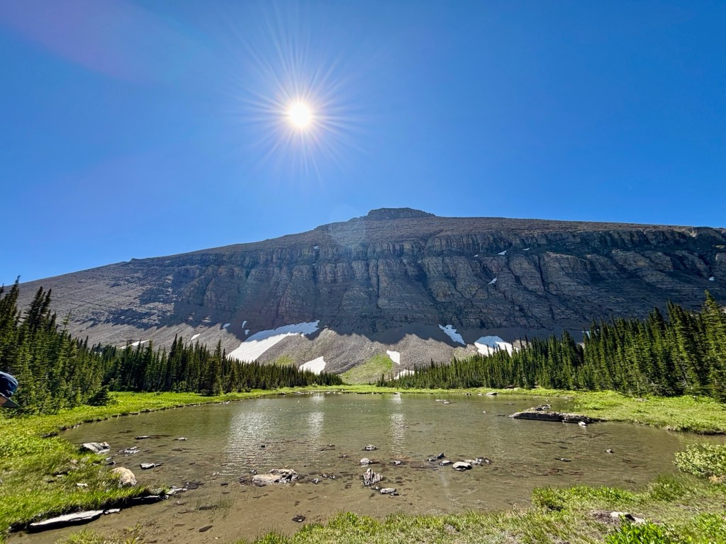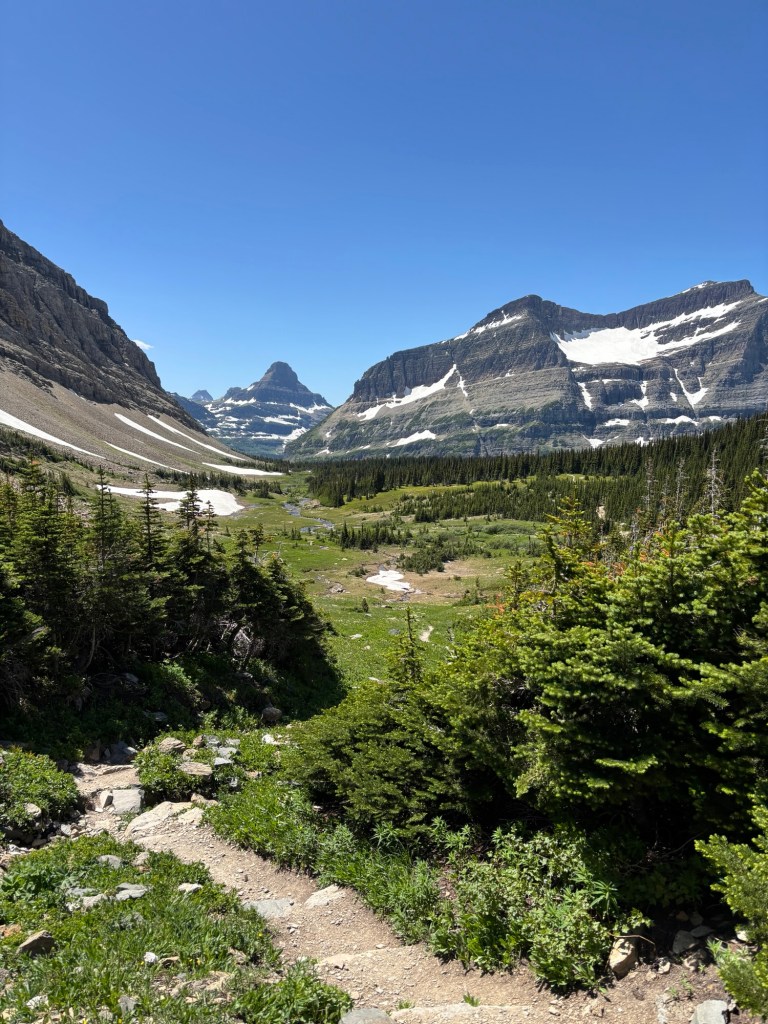 After a few miles, we arrived at the junction for Siyeh Pass and veered to the left. A new trail for us to discover. It wound through open fields and pine patches, across the river and by spring fed ponds. We even passed several patches of snow hiding out in the forest! Eventually we came to a clearly and the mountains just seemed to erupt before us. Gosh it’s amazing to be alive!