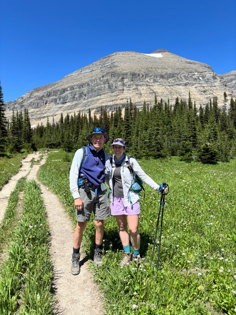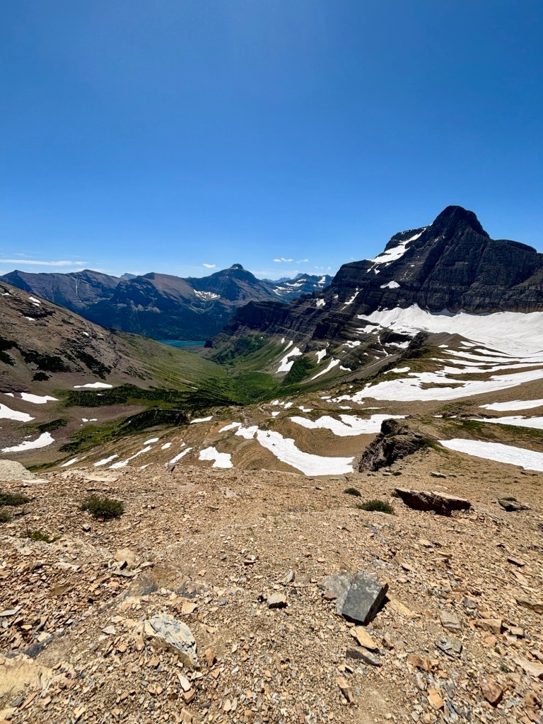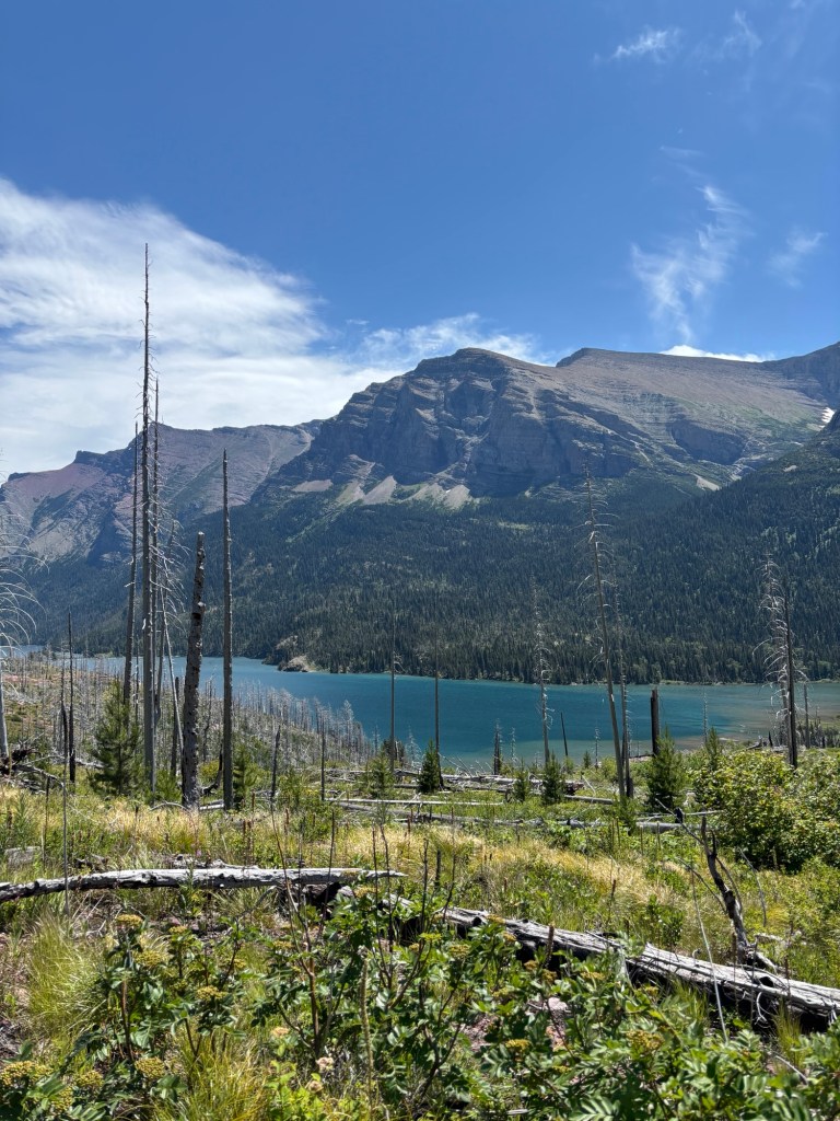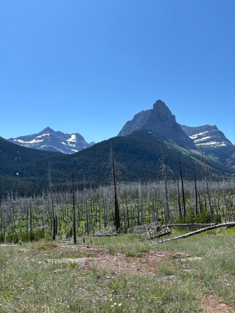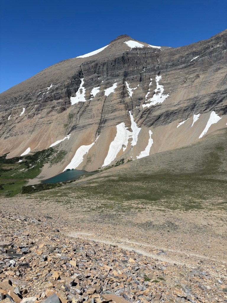 After a few miles, we arrived at the junction for Siyeh Pass and veered to the left. A new trail for us to discover. It wound through open fields and pine patches, across the river and by spring fed ponds. We even passed several patches of snow hiding out in the forest! Eventually we came to a clearly and the mountains just seemed to erupt before us. Gosh it’s amazing to be alive!