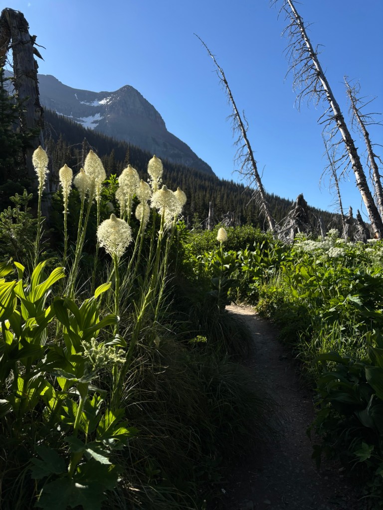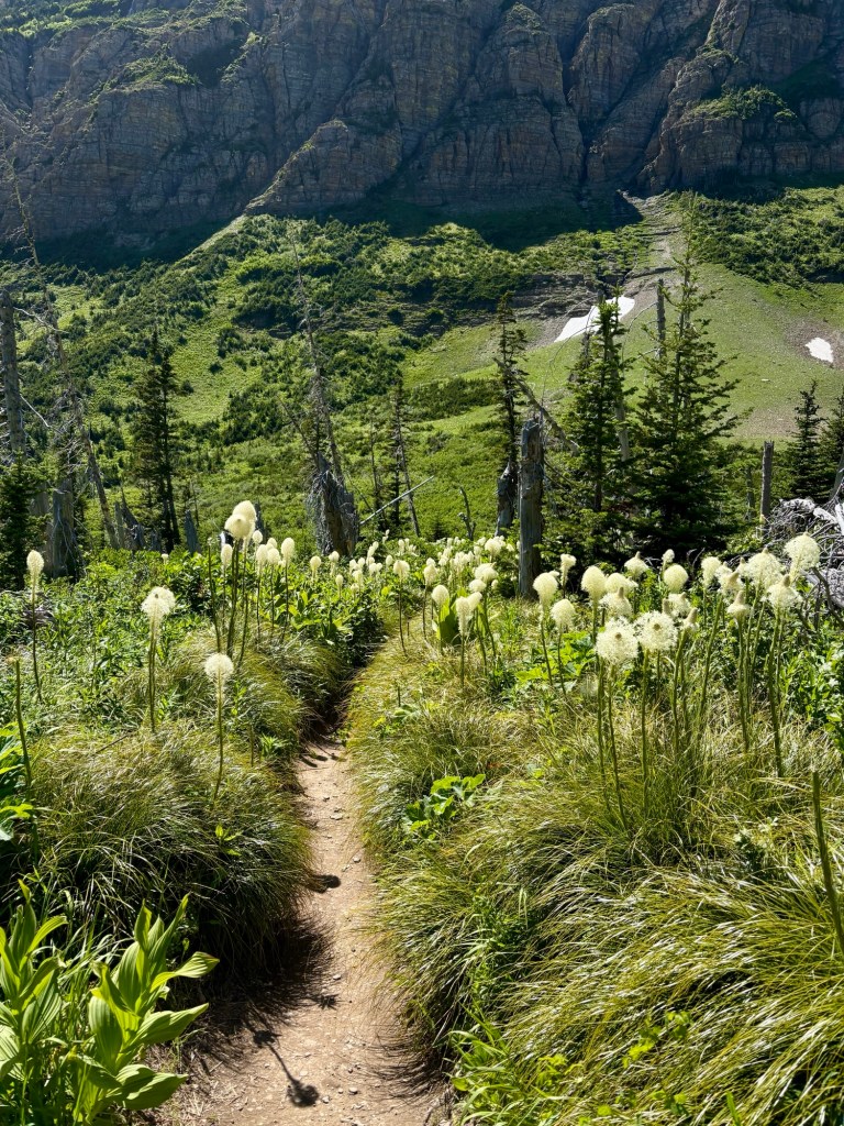 The trailhead was a welcome familiar site. Five years ago we hiked from here up to Piegan Pass. Today our goal was Siyeh Pass, a different end but the same beginning. We happily started out along the roaring river, the air brisk, the snow patches glowing, and the mountain waterfalls cascading down. Soon the path turned away from the river and into the woods. We were greeted by the fuzzy Dr. Seuss looking bear grass, the ones that make the hike just a little extra whimsical. The trail slowly climbed up, a gentle ascent.