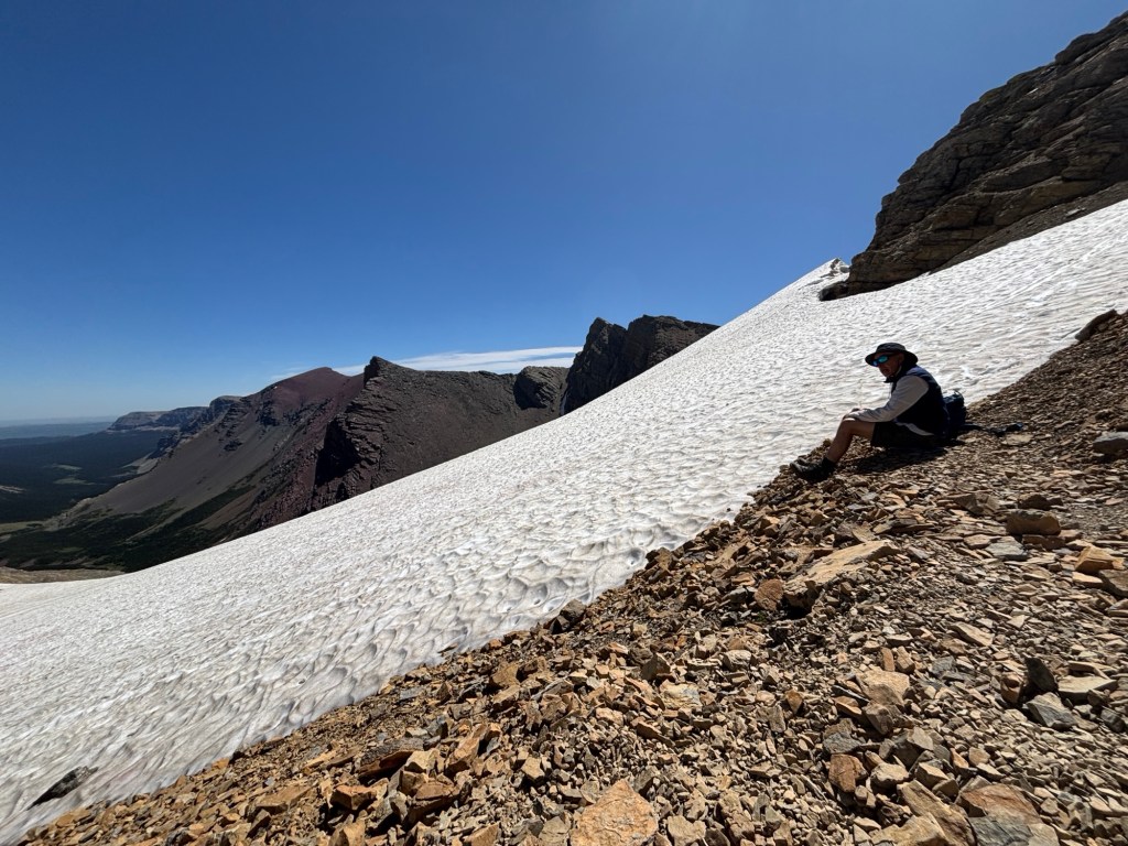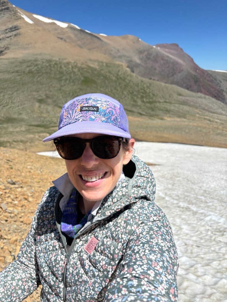 We made it about two-thirds of the way up and decided to pull off on a side trail to regroup and discuss next steps. We turned the corner, saw the glacier, and sat down next to the lingering snow and ice to rest. Down on the ground, the wind was much less and we were able to enjoy the majestic view before us. Snow on one side, towering mountains ahead, a green called far below. The rocks were a rainbow of yellow, gray, maroon, purple – so different than anything I’d seen before. And to be able to touch a glacier – how amazing!